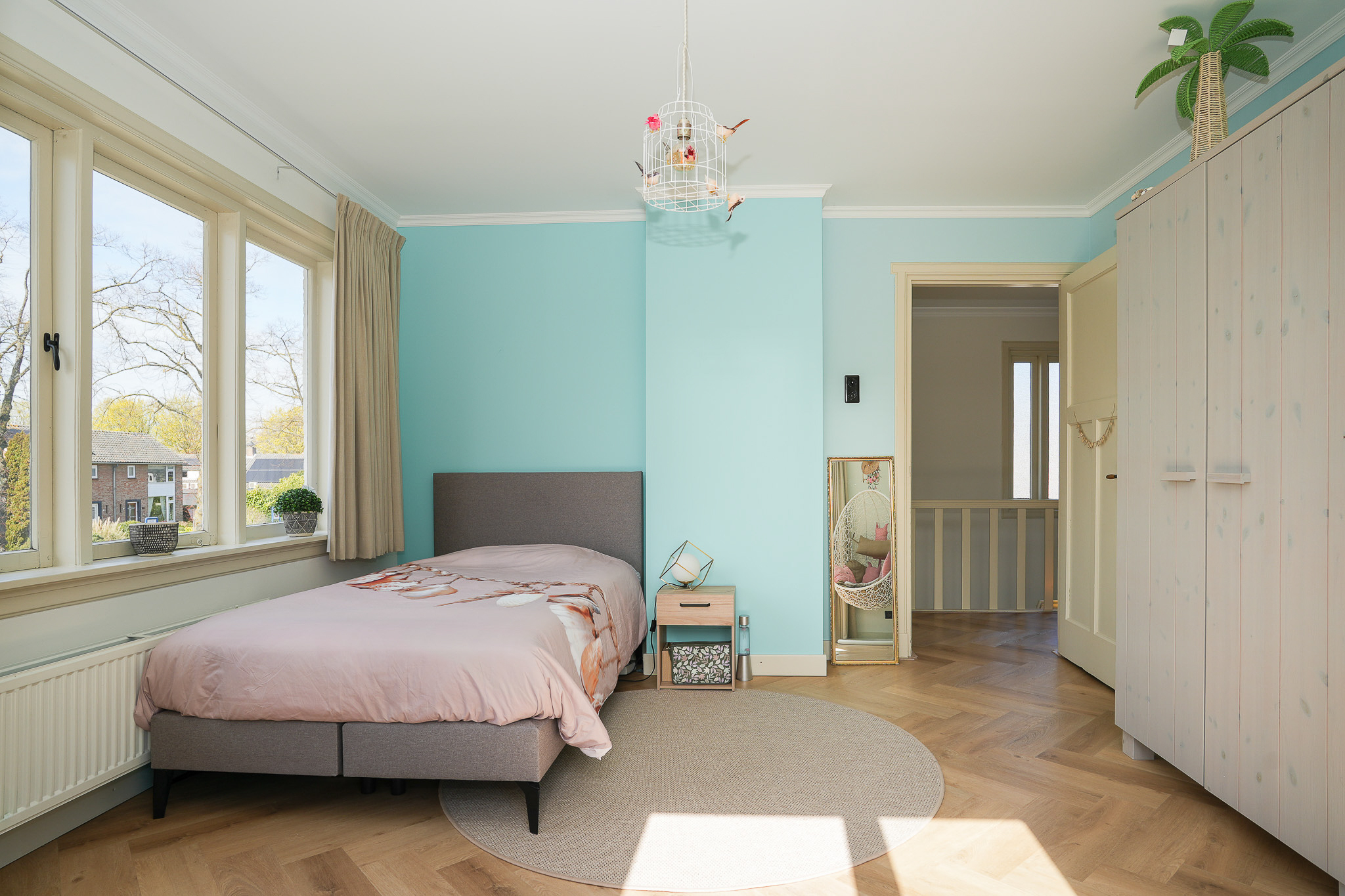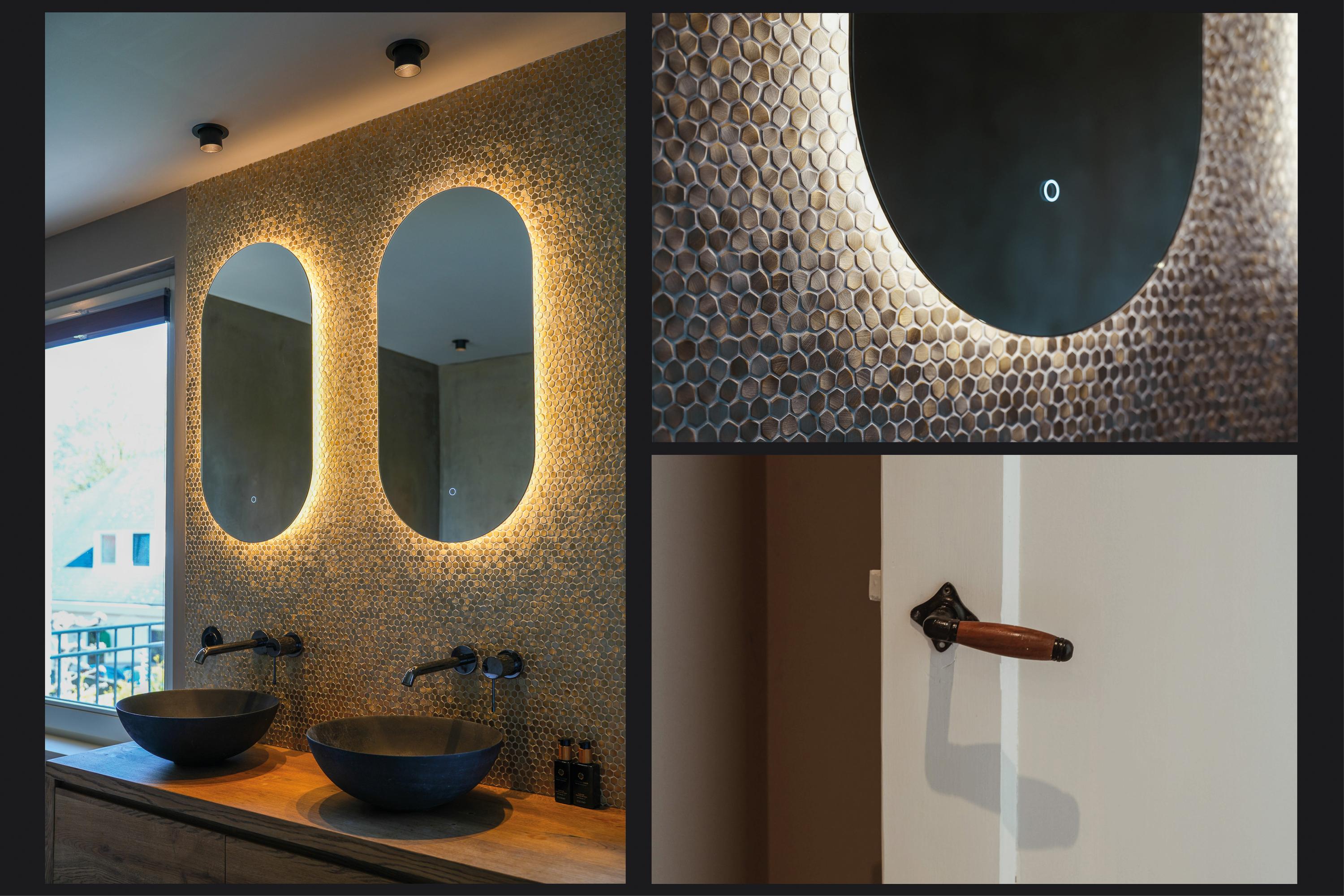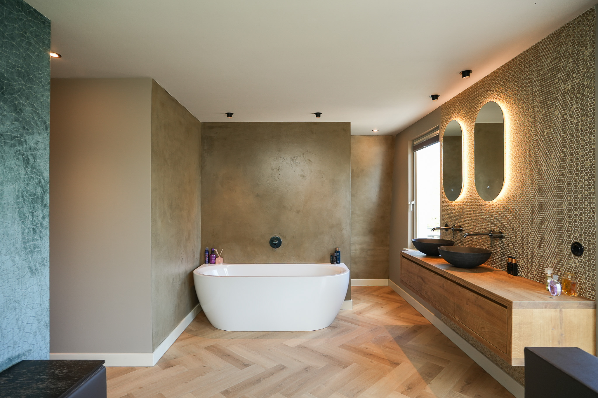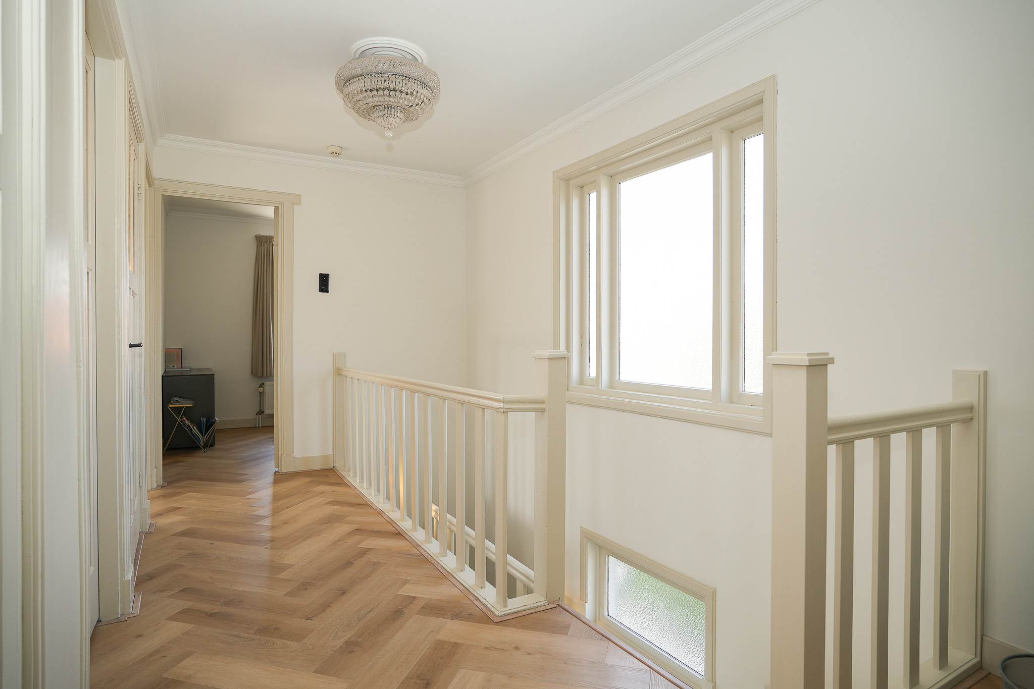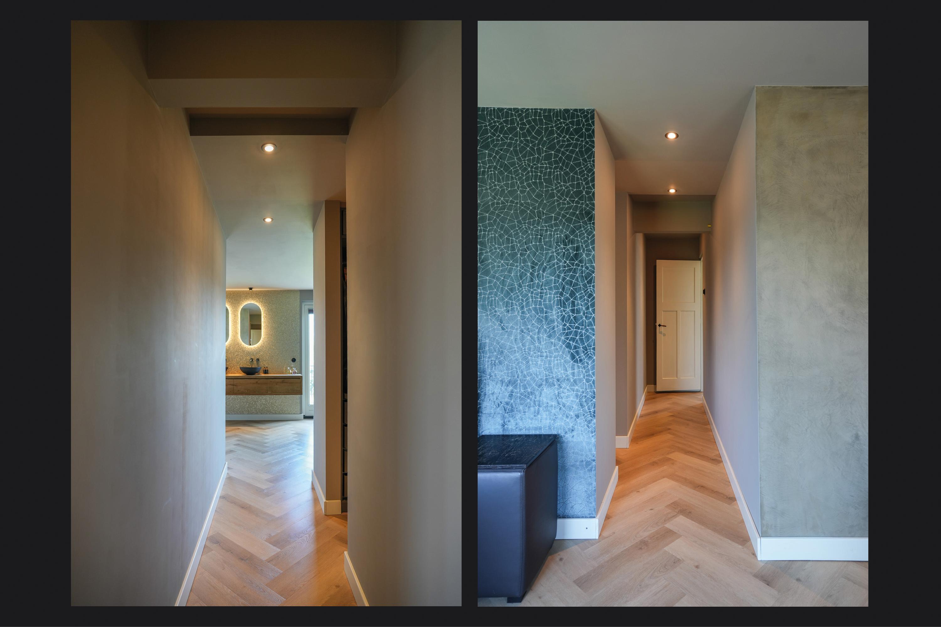 Op de overloop is zichtbaar dat de verbouwing met grote zorg is uitgevoerd. De nieuwe aanbouw sluit naadloos aan bij de oorspronkelijke stijl. Hier bevindt zich tevens de toiletruimte. In de uitbouw aan de achterzijde ligt een slaapkamer met balkon, een luxe open badkamer en een walk-in closet. De badkamer is uitgerust met een half vrijstaand ligbad, een ruime inloopdouche met regendouche en een luxe wastafelmeubel. De wand achter het meubel is afgewerkt met hexagonale mozaïektegels, terwijl de wanden bij douche en bad zijn uitgevoerd in betonciré. Door de oostelijke ligging valt hier in de ochtend het zonlicht naar binnen en is het balkon direct vanuit de slaapkamer bereikbaar.