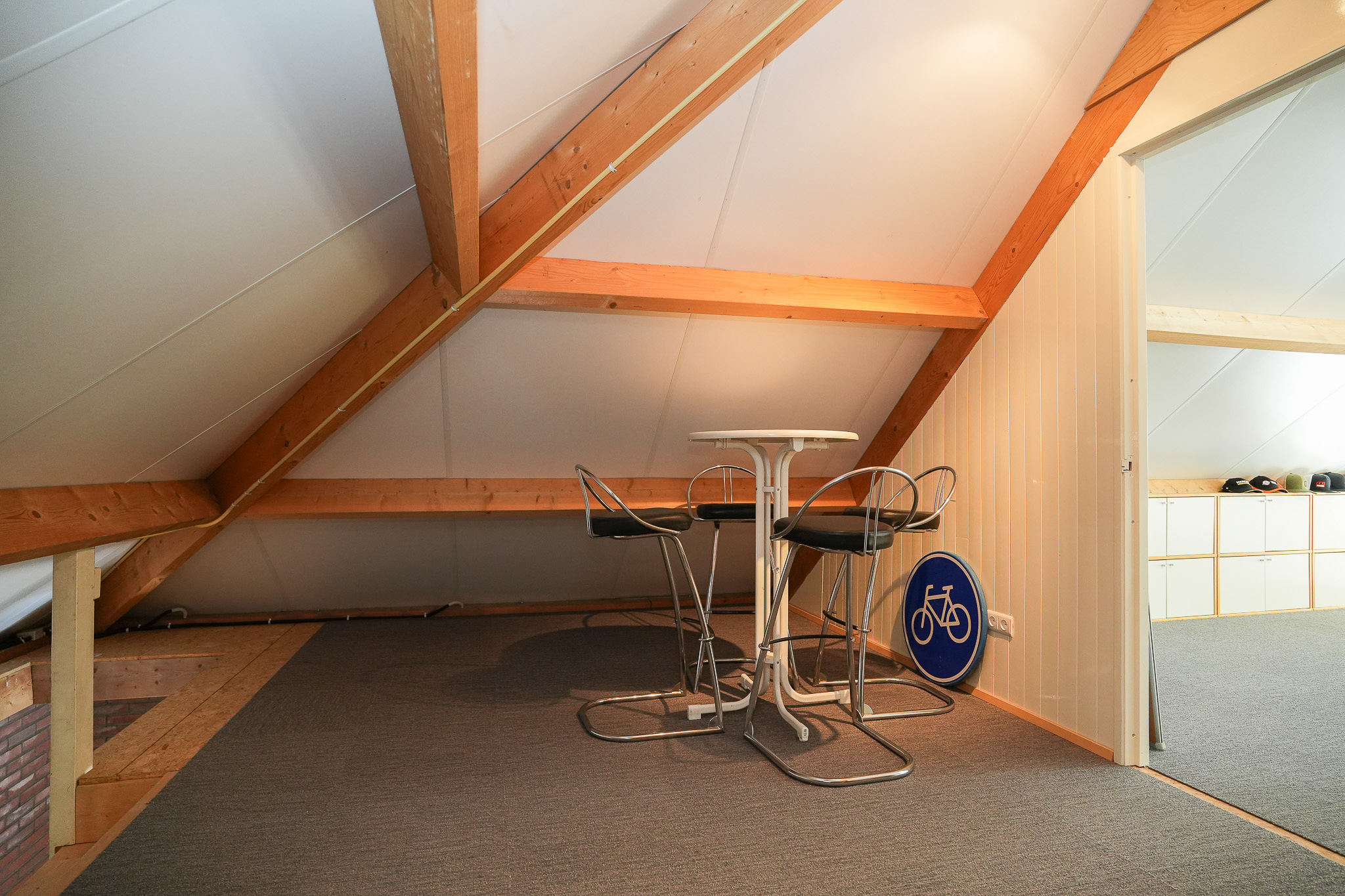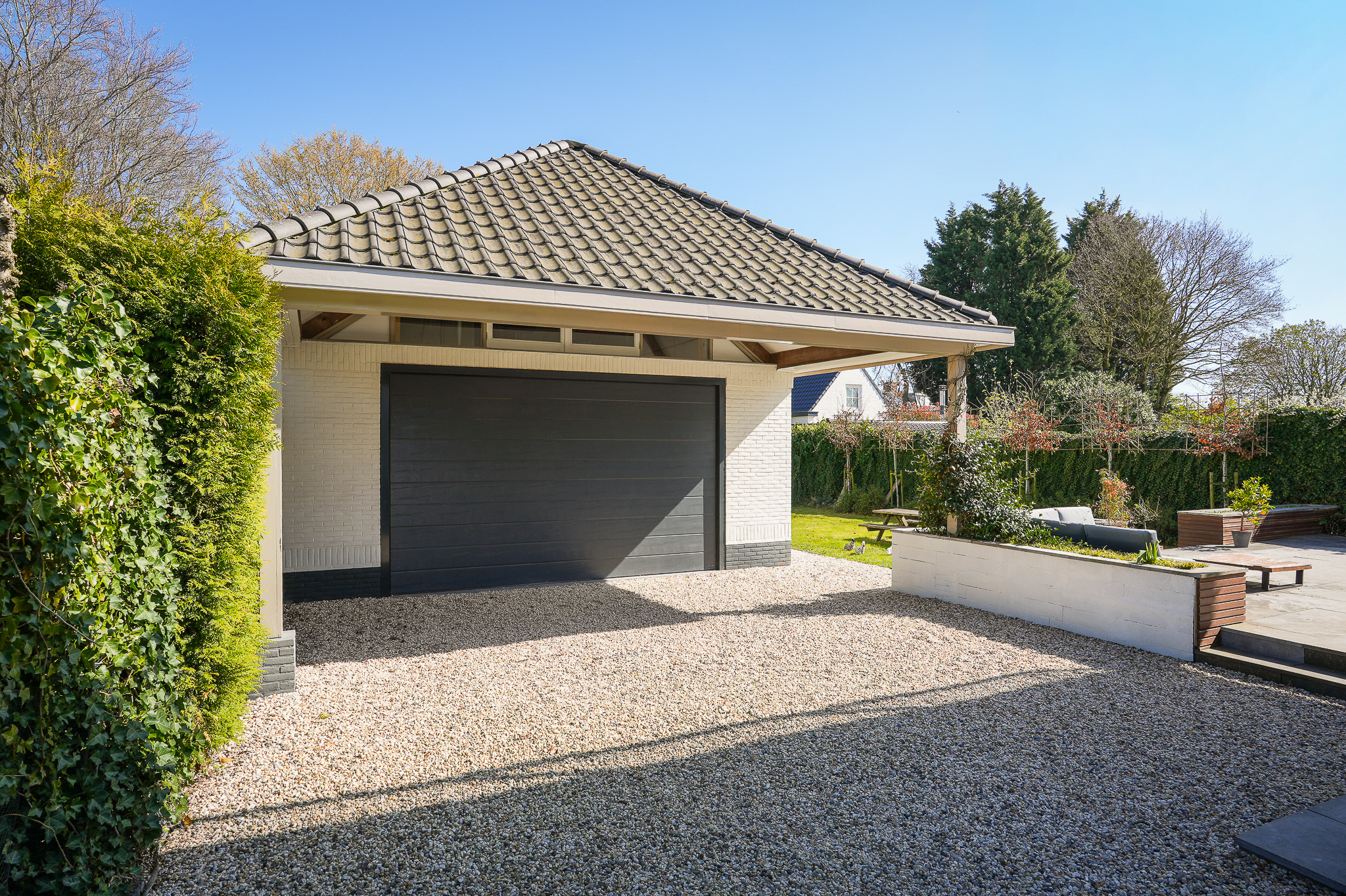 Het volledig geïsoleerde bijgebouw (2016) is voorzien van aansluitingen voor gas, water, elektra en riolering. Op de begane grond bevindt zich een open ruimte die geschikt is voor het stallen van meerdere auto’s of het gebruik als werkplaats. De royale vrije hoogte versterkt deze mogelijkheden. Het bijgebouw leent zich dan ook uitstekend voor gebruik als atelier, werkruimte of mantelzorgwoning. Via een vaste trap is de verdieping bereikbaar; een prettige en lichte werkplek onder de kap die elektrisch kan worden verwarmd.