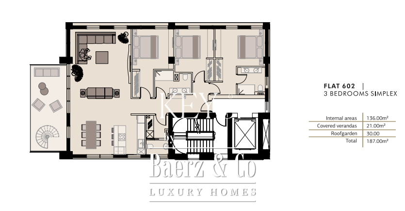 Przestrzeń doświetlona jest naturalnym światłem wpadającym przez duże okna oraz drzwi balkonowe z podwójnymi szybami, podkreślając otwartą aranżację stref dziennych zaprojektowanych z myślą o codziennym komforcie. Każda sypialnia ma własną łazienkę typu en-suite, dodatkowo do dyspozycji mieszkańców jest toaleta dla gości. Wbudowane szafy, kuchnie projektowane z wysokiej klasy blatami oraz indywidualnie dopasowane rozwiązania wykończeniowe odzwierciedlają przywiązanie do jakości i unikalnych potrzeb.