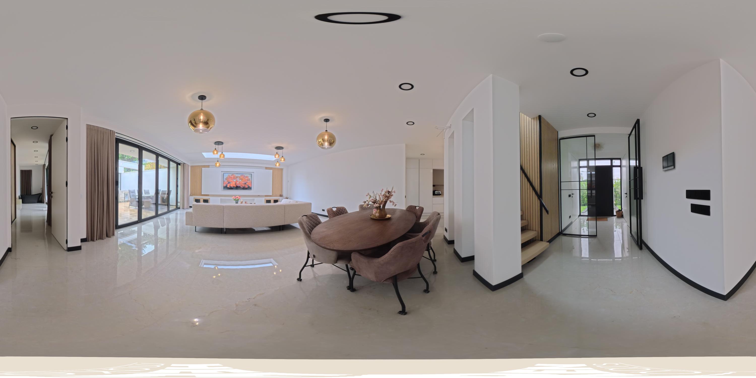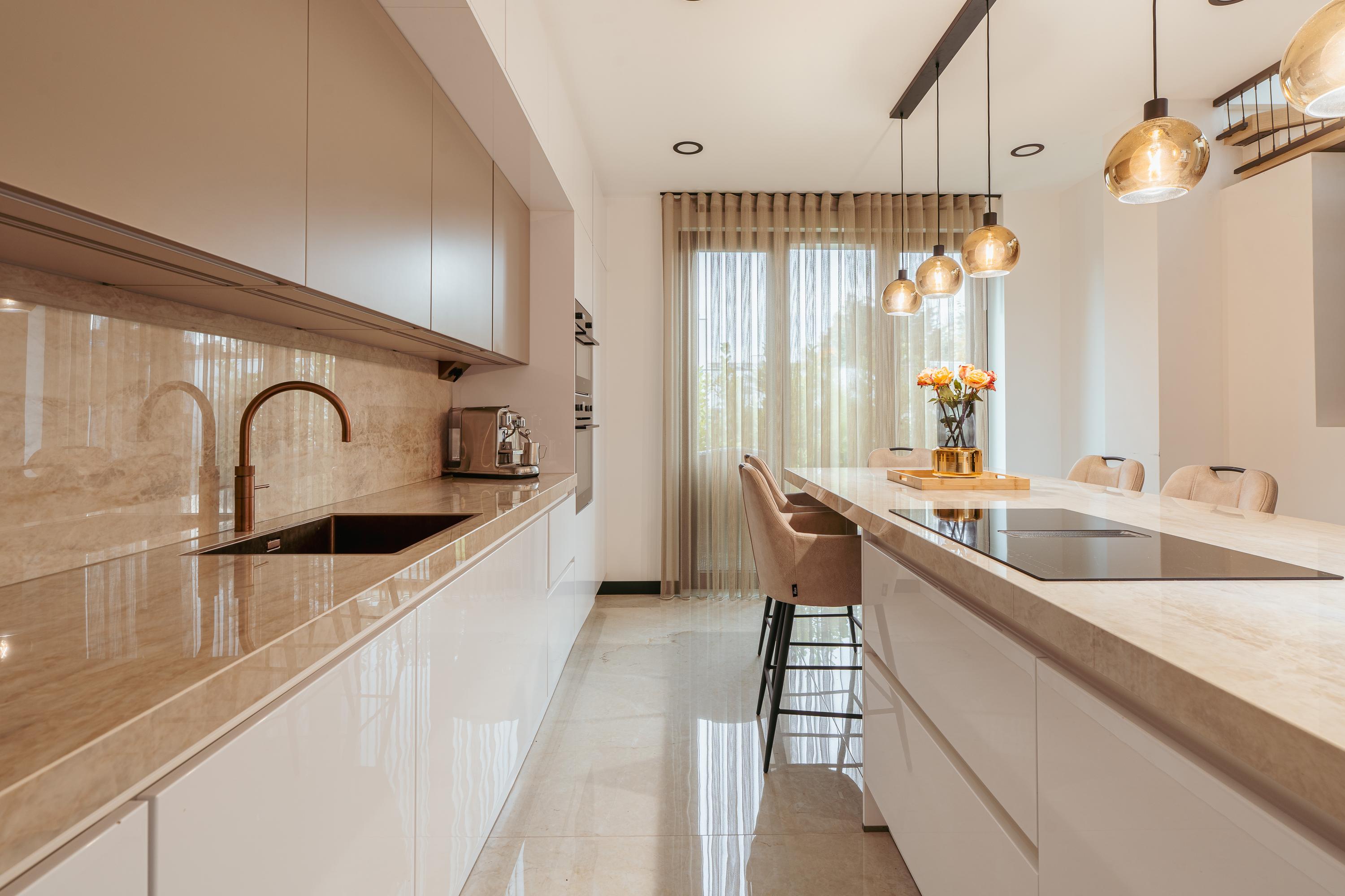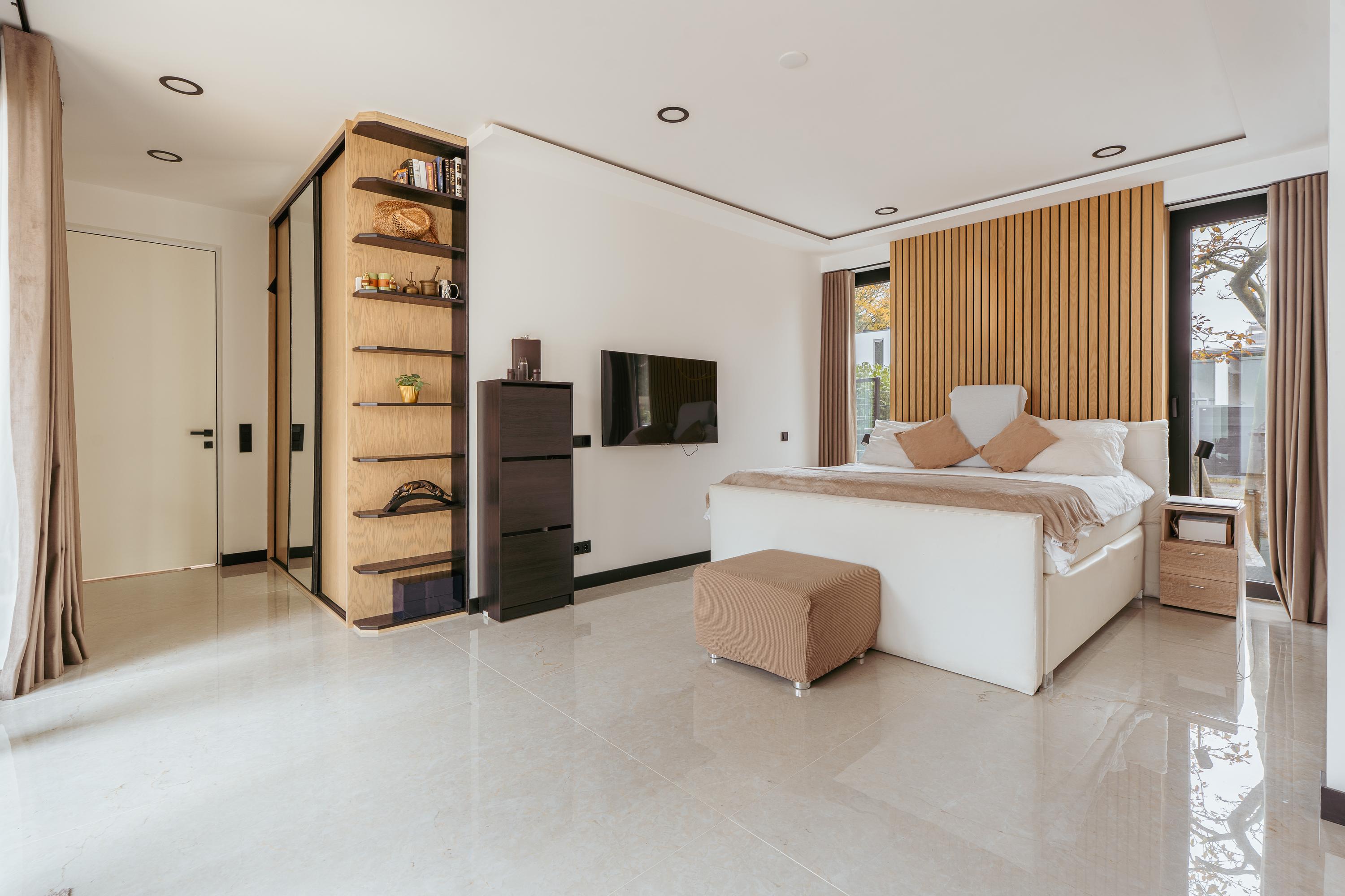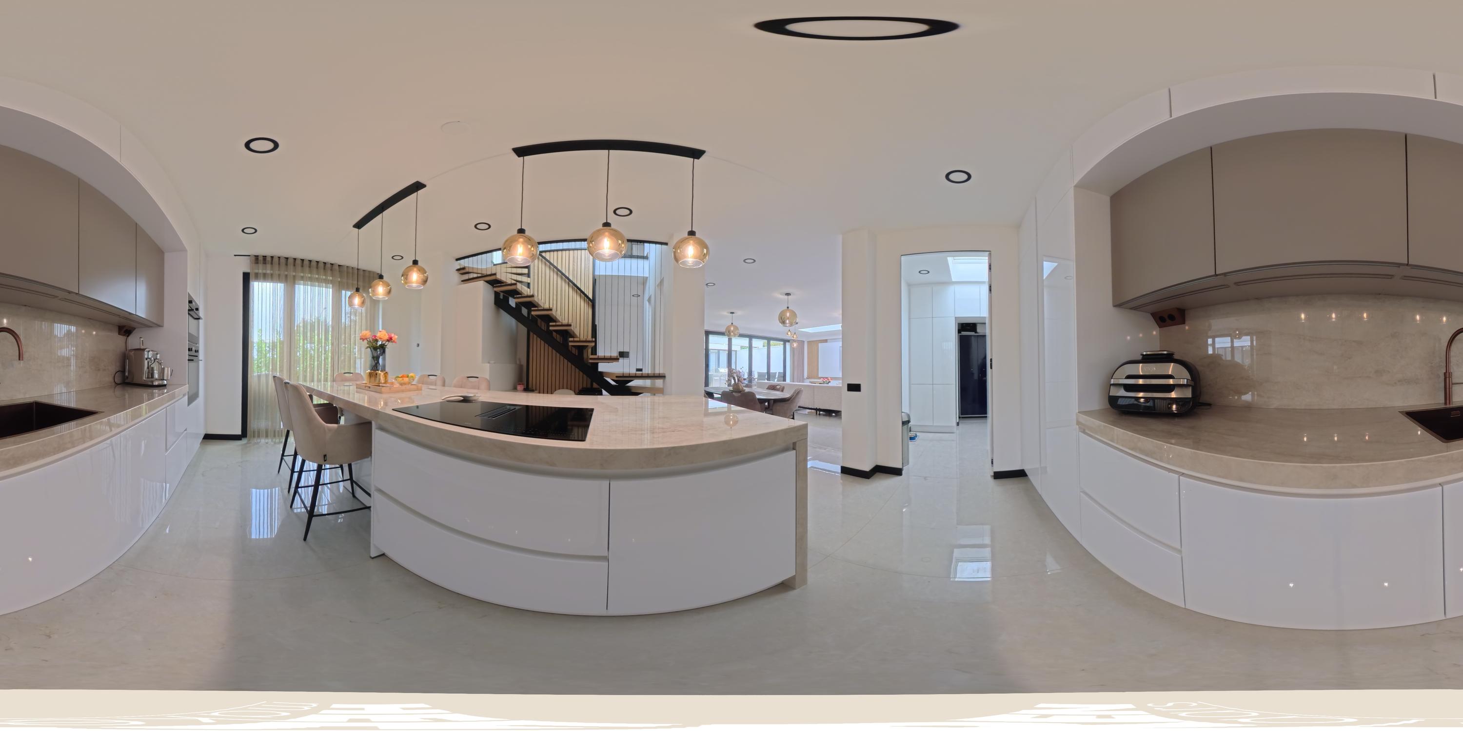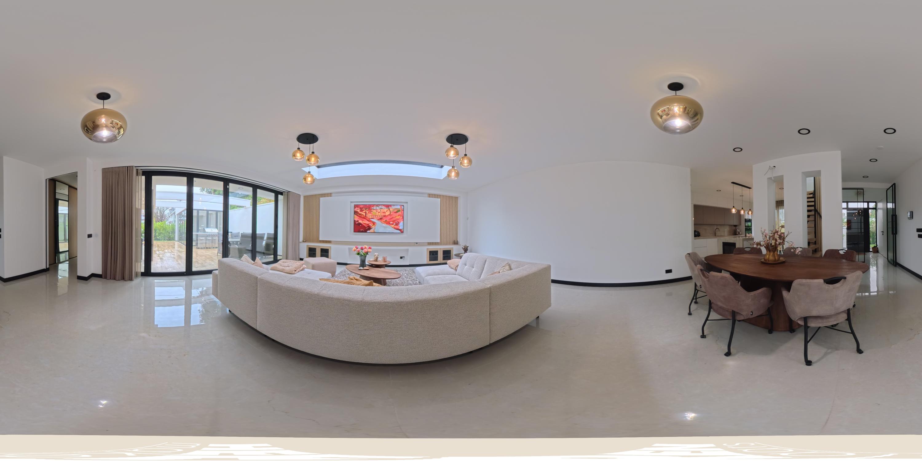 Naturalne światło wypełnia główną przestrzeń dzienną przez duże okna, przechodząc płynnie na południowy ogród o powierzchni 177,3 m². Zaprojektowany taras i zewnętrzna kuchnia zachęcają do relaksu, a wolnostojący domek ogrodowy to potencjał na siłownię lub studio. Luksusowa otwarta kuchnia z nowoczesnym sprzętem i klimatyzowaną szafą na wino stanowi centralne miejsce spotkań, natomiast sąsiadująca pralnia i liczne rozwiązania do przechowywania zapewniają codzienną wygodę.