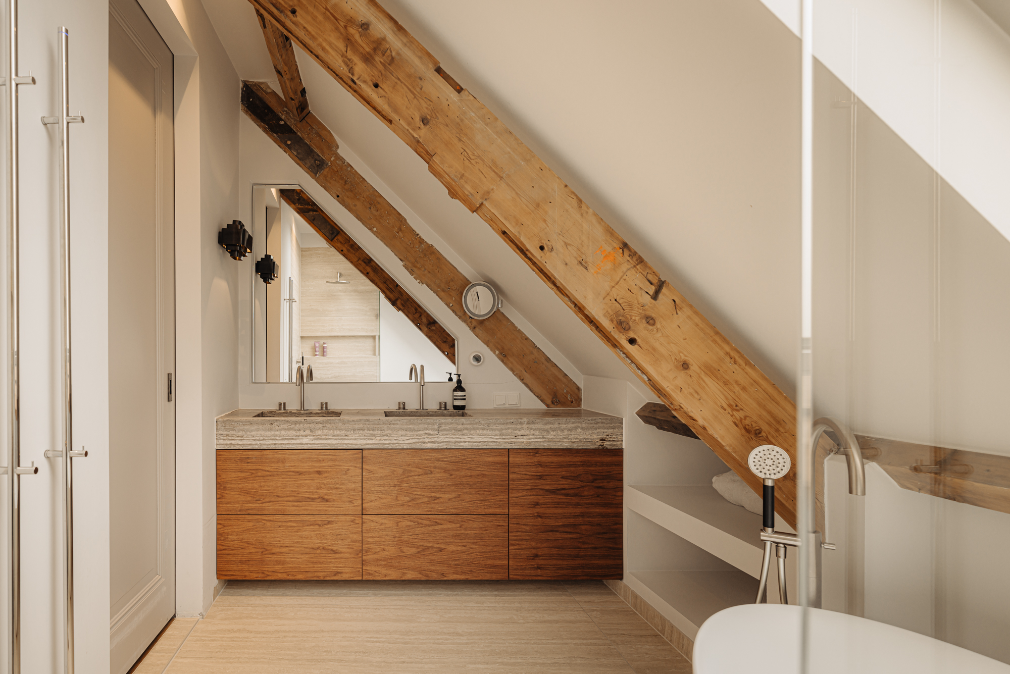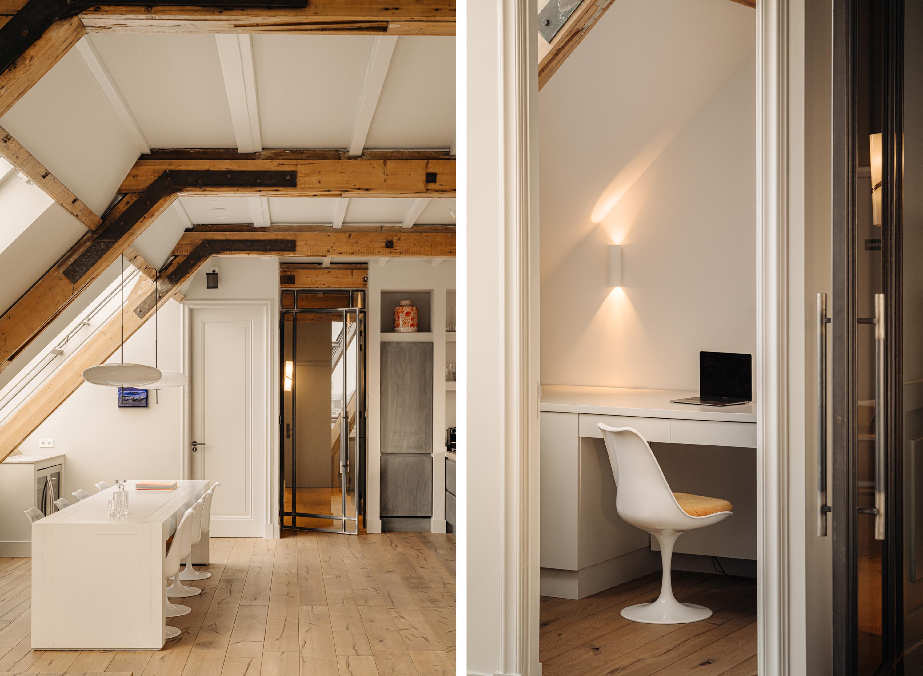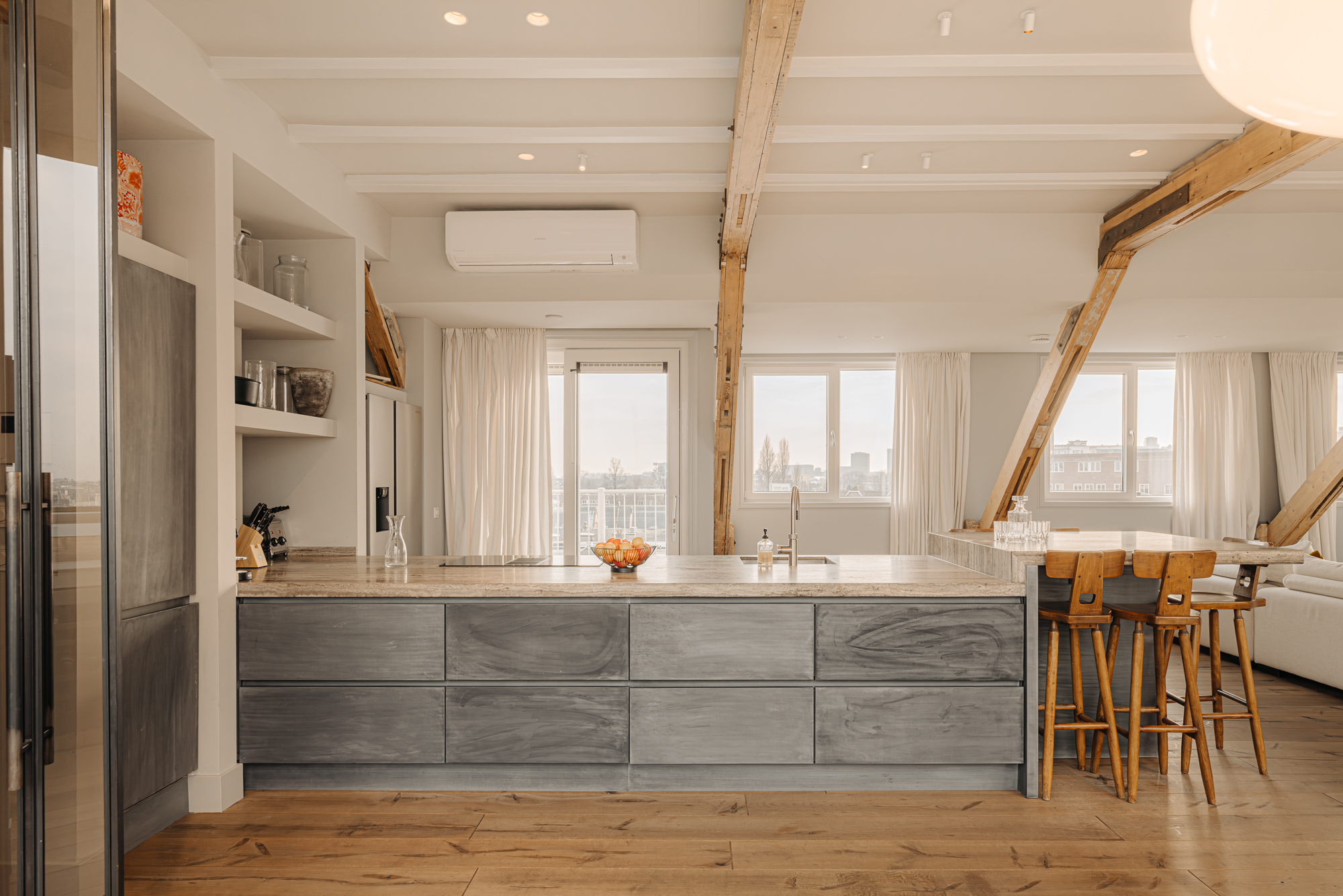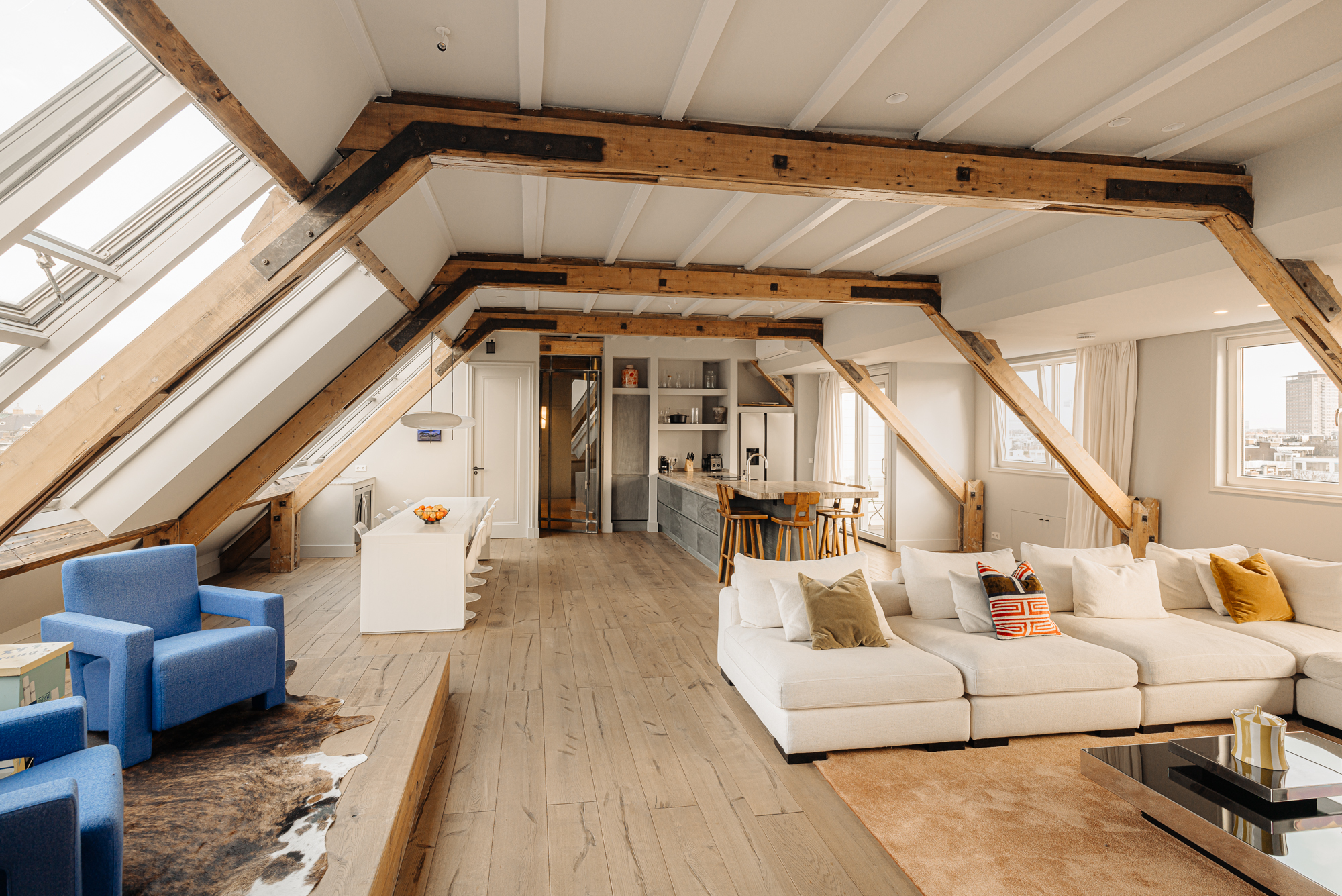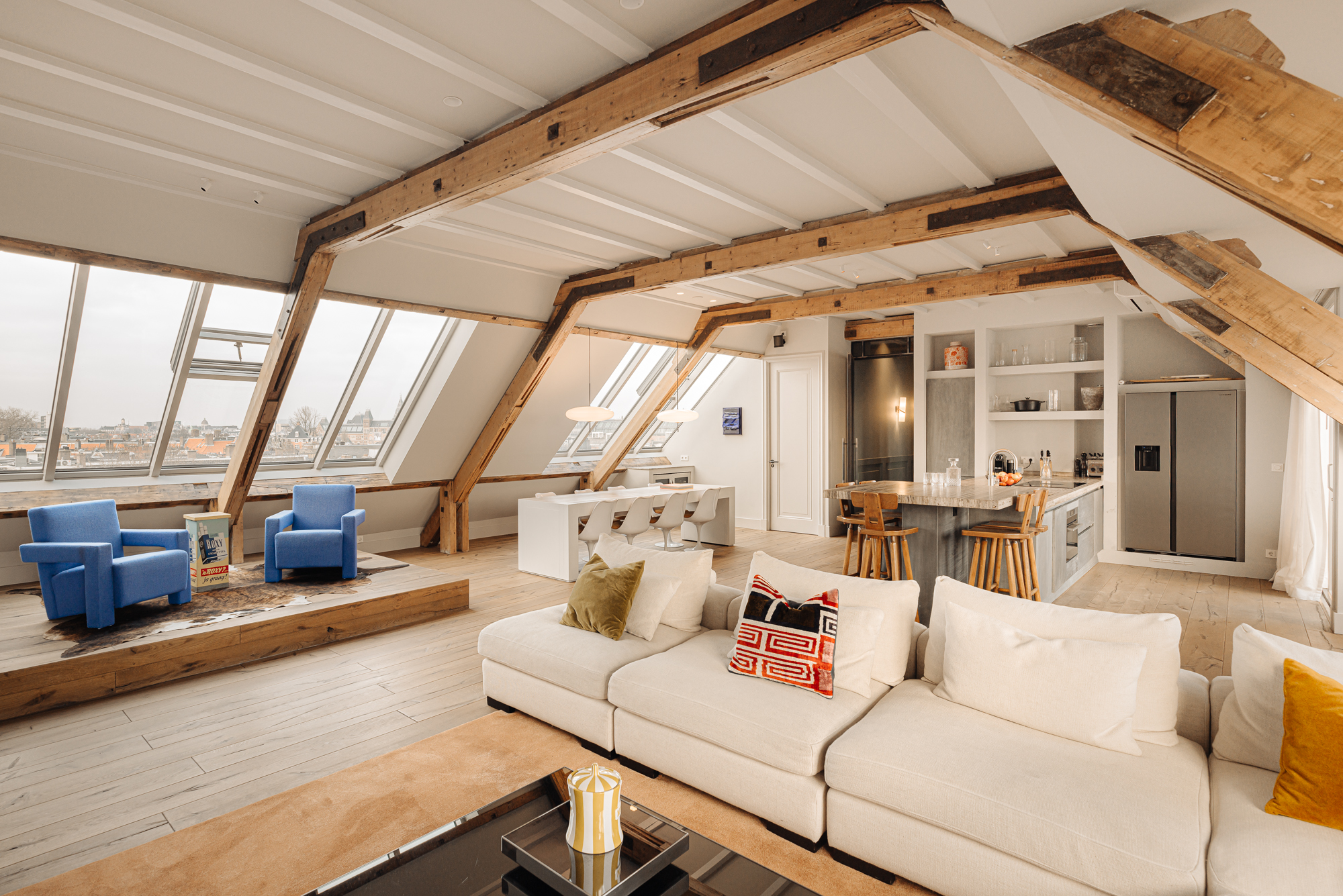 Apartment Amsterdam to wyrafinowana propozycja na najwyższym piętrze eleganckiego budynku w dzielnicy Amsterdam Oud-Zuid. Na powierzchni około 148 m² jasnych wnętrz łączy się nowoczesny komfort z dyskretnym luksusem. Otwarta przestrzeń dzienna, zaakcentowana widocznymi drewnianymi belkami i rozległym widokiem na miasto, prowadzi na dwa balkony z ekspozycją południową o łącznej powierzchni 8 m². Duże okna po obu stronach wypełniają wnętrze światłem dziennym i nadają mu poczucie przestronności, a podwyższone strefy wypoczynku i jadalni zachęcają do swobodnych spotkań w gronie bliskich.