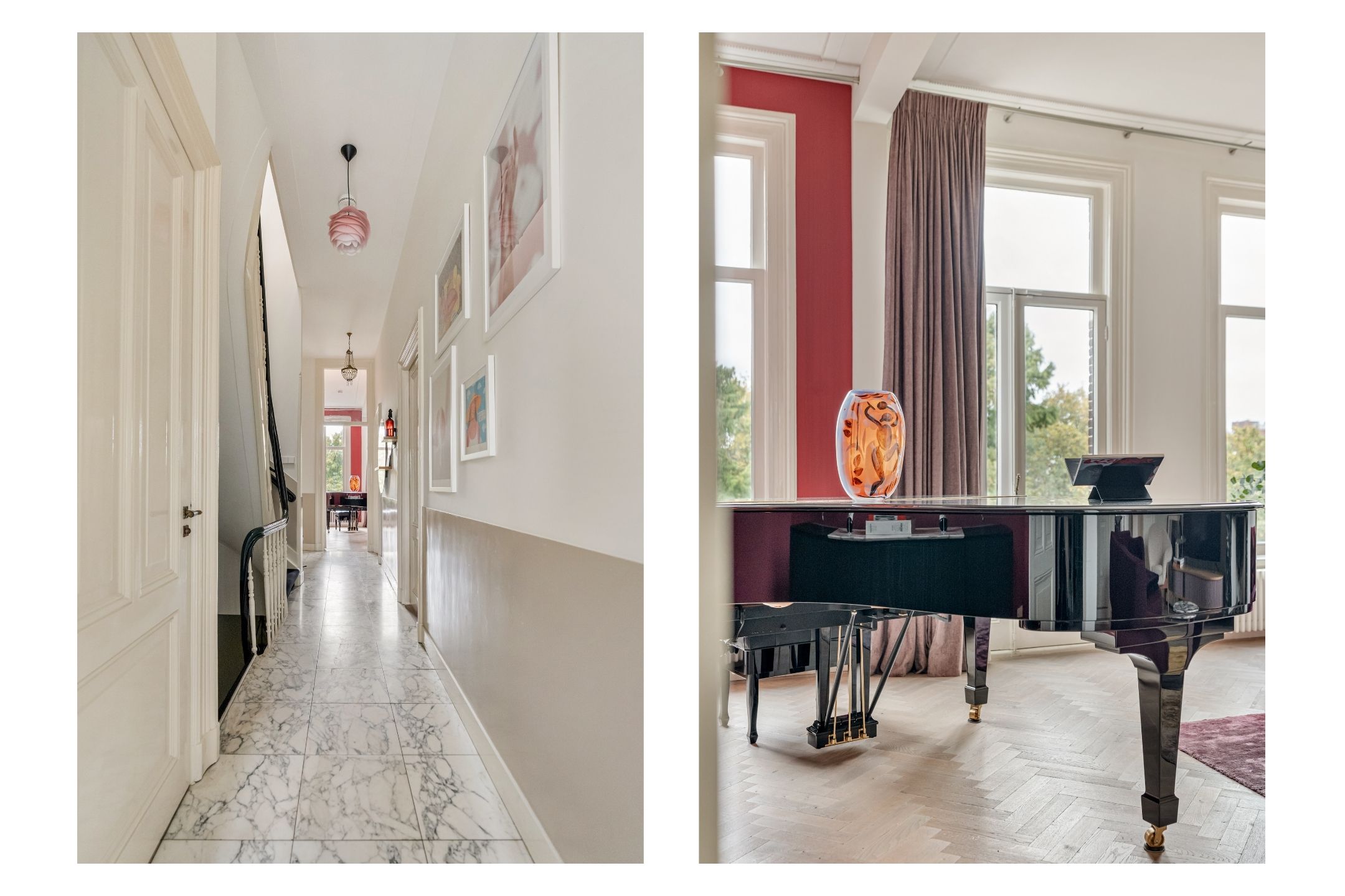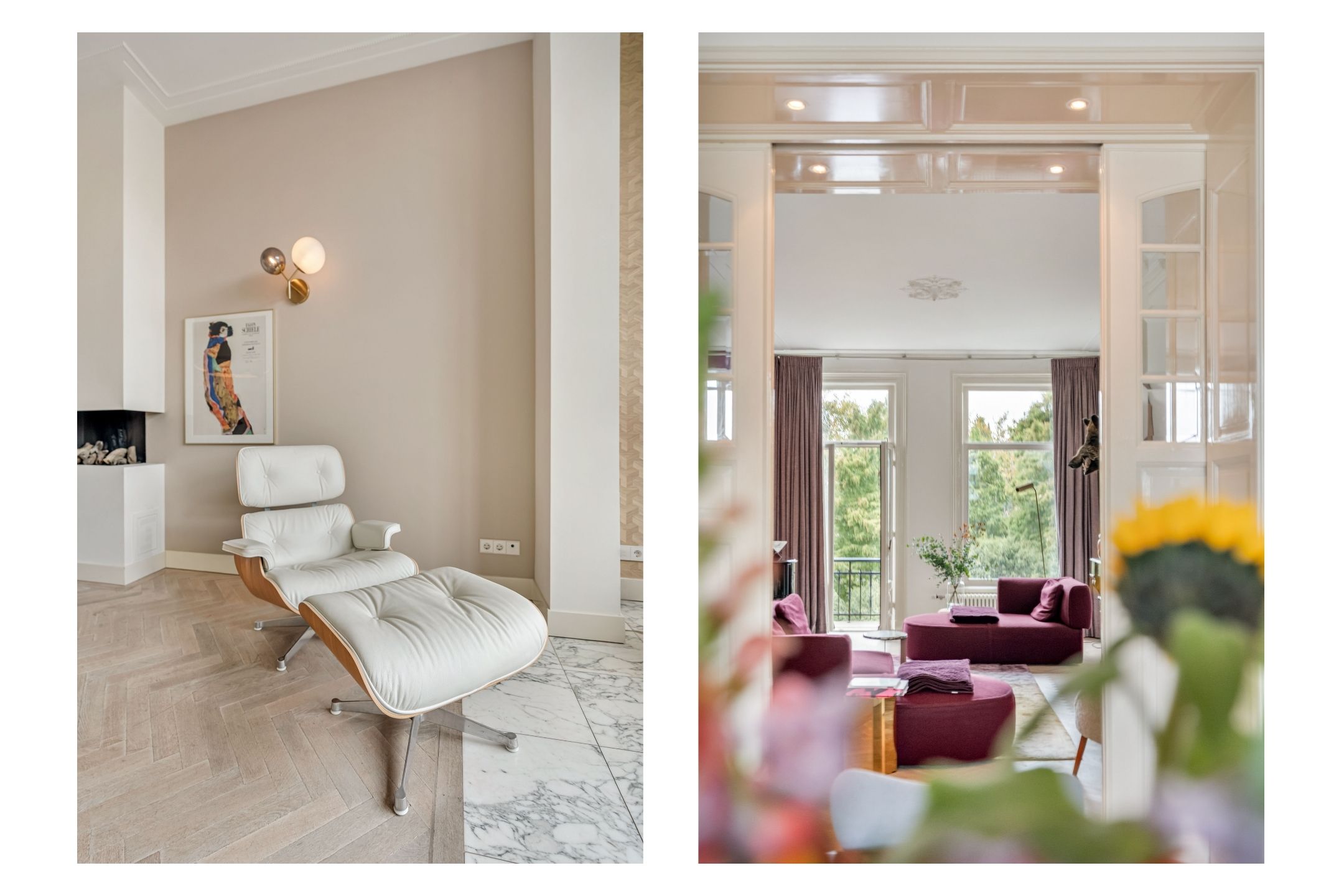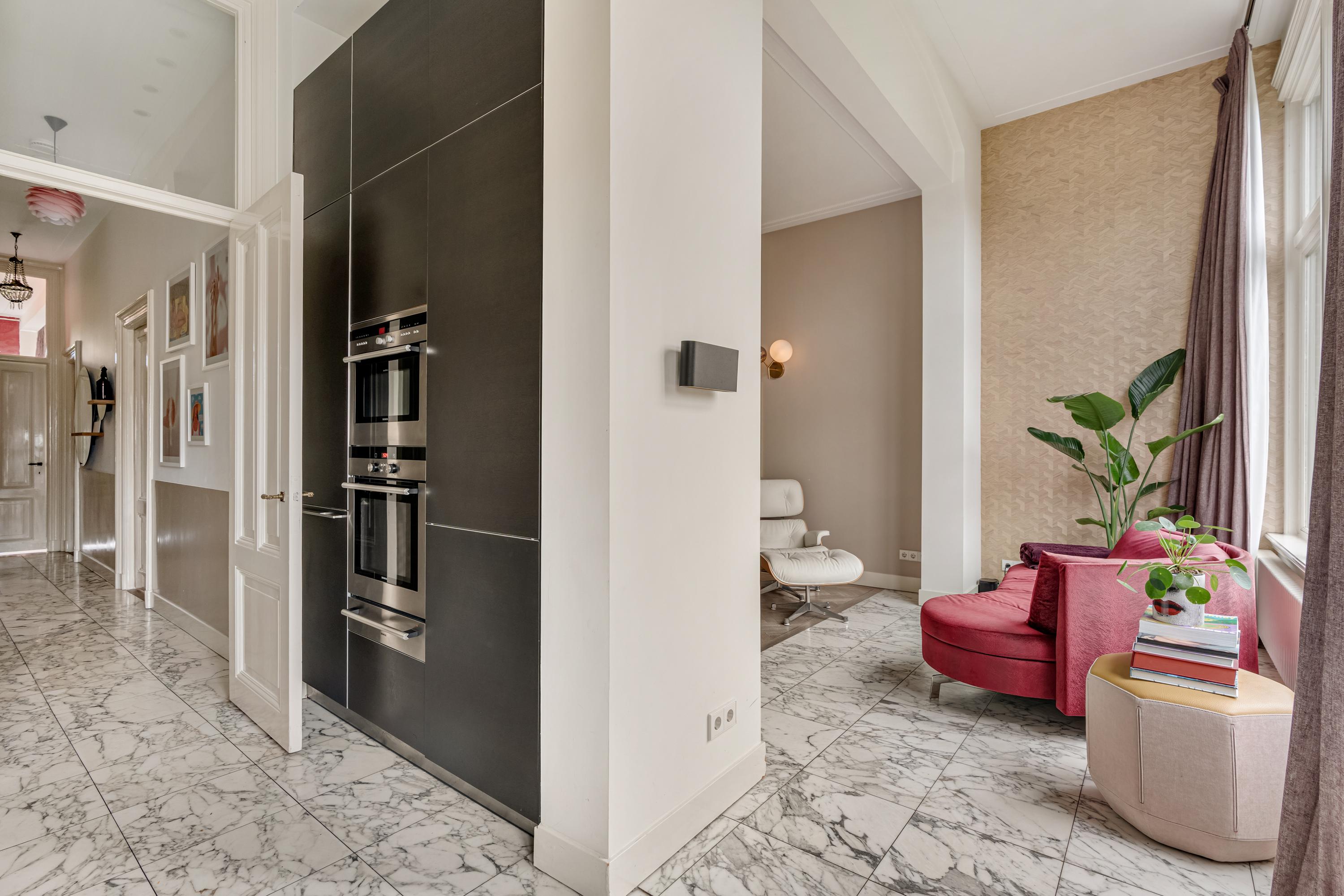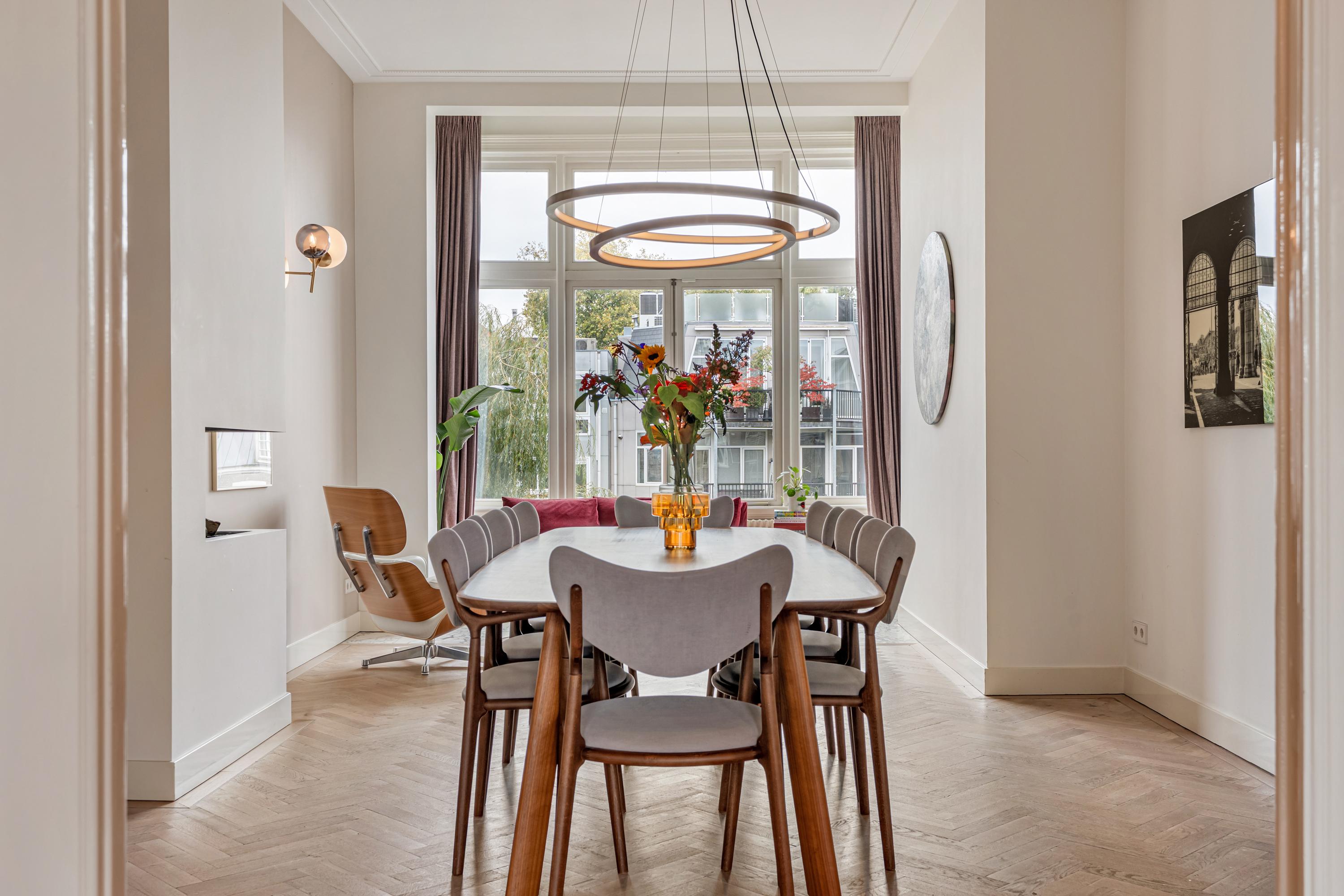 Apartament Amsterdam Vossiusstraat to wyjątkowa rezydencja bezpośrednio przy Vondelpark, oferująca 183 m² wyrafinowanej przestrzeni do życia na dwóch starannie wykończonych kondygnacjach. Mieszkanie łączy w sobie charakter klasycznej kamienicy z nowoczesnym komfortem, podkreślonym wysokimi sufitami, oryginalnymi sztukateriami, marmurowymi detalami oraz jasną podłogą w jodełkę. Z przestronnego salonu, zarówno przez przednie, jak i tylne okna, wpada mnóstwo naturalnego światła, podkreślając wyjątkowy widok na zieleń parku i spokojne prywatne ogrody.