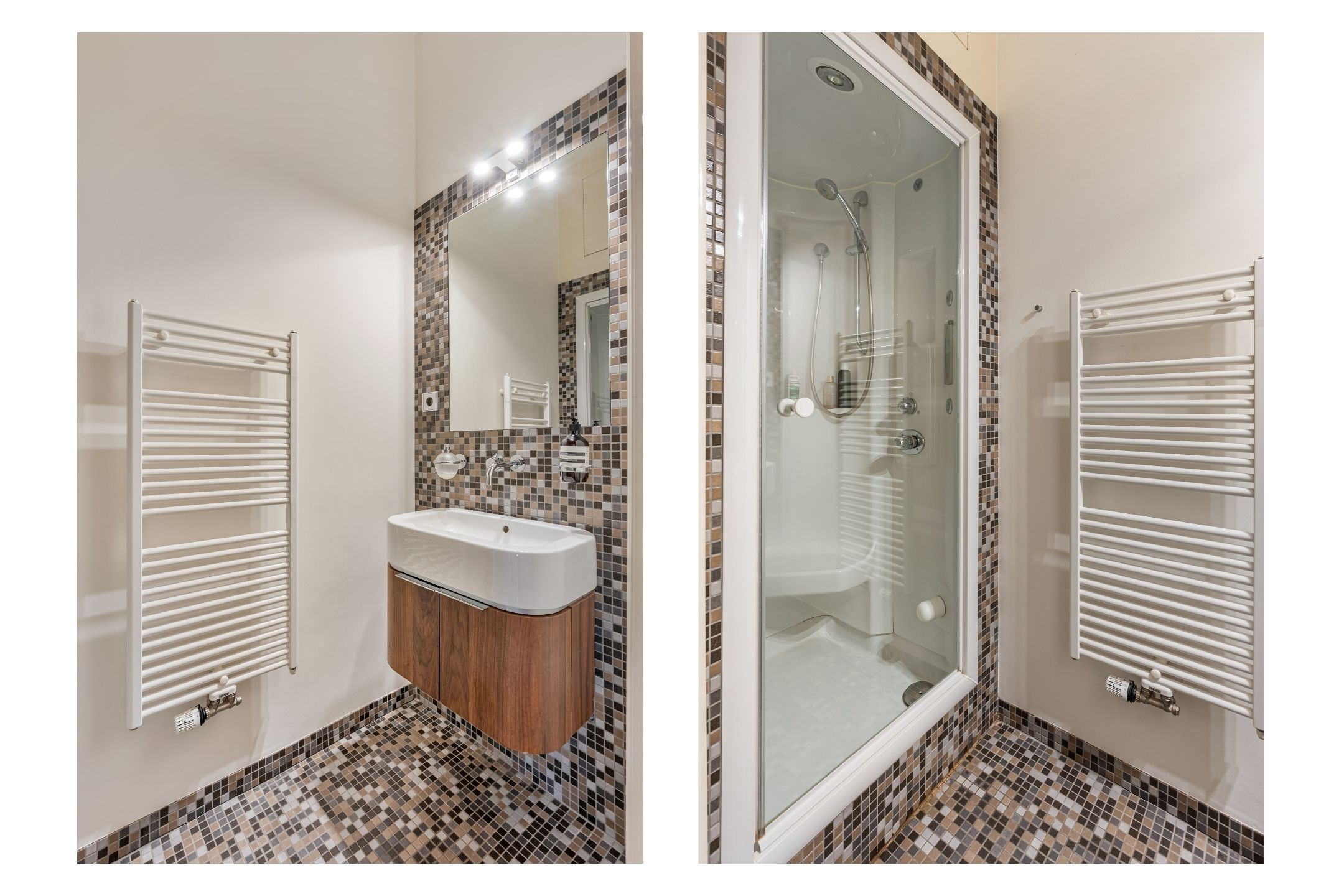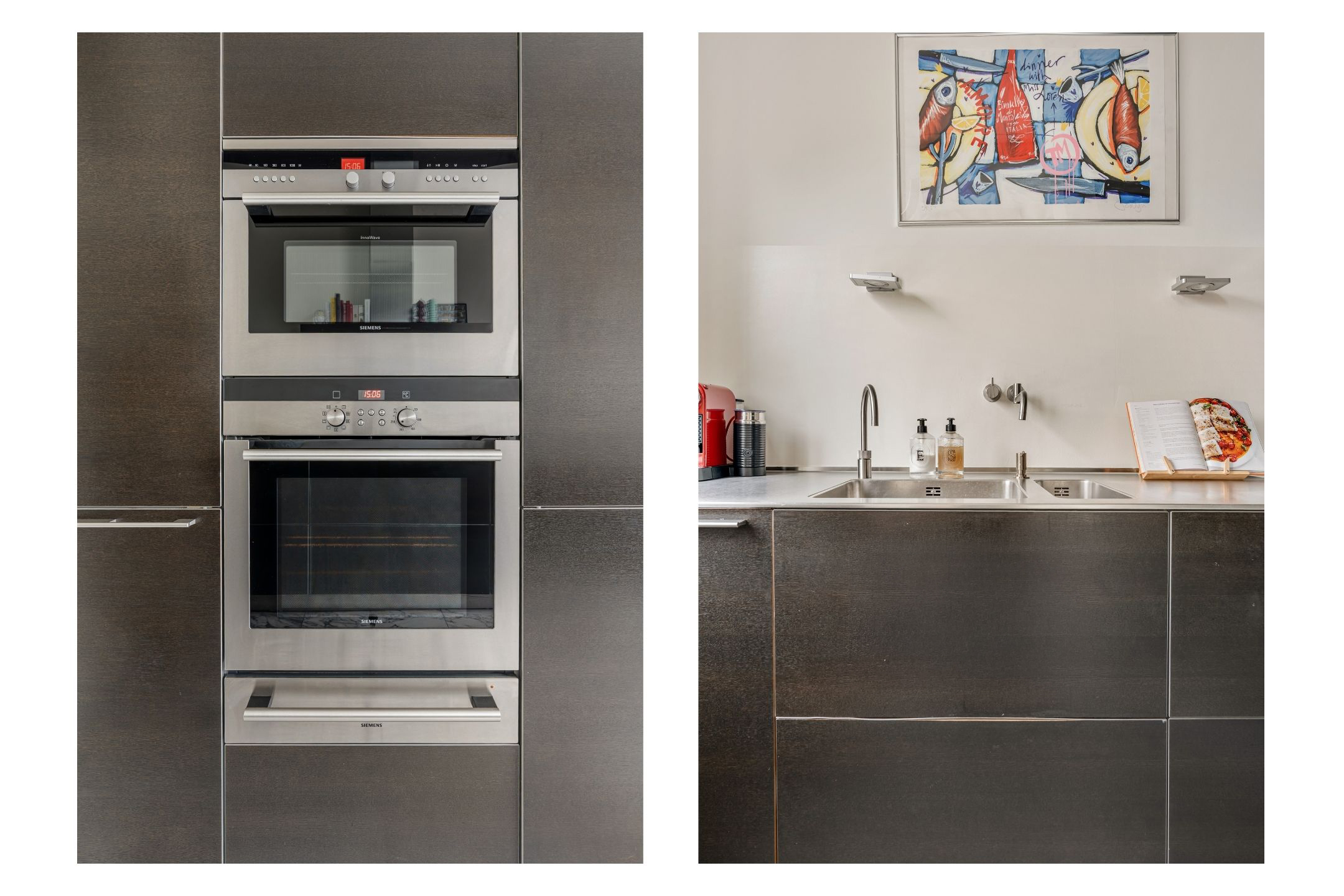 Rozkład mieszkania emanuje spokojem—przestrzenie en suite, oryginalne przesuwne drzwi drewniane oraz kominki zapewniają ciepło i architektoniczną dostojność. Centralnym punktem jest nowoczesna półotwarta kuchnia z wysokiej klasy sprzętem i marmurową podłogą, otwarta na strefę jadalni i salon. Trzy sypialnie dają wiele możliwości aranżacyjnych: główna znajduje się od frontu, a elastyczne pomieszczenia z tyłu prowadzą na południowy balkon oraz 59 m² tarasu dachowego, idealnego na prywatne chwile na świeżym powietrzu i panoramiczne widoki na miasto. Dwie łazienki, z czego jedna z kabiną parową, potęgują poczucie komfortu.