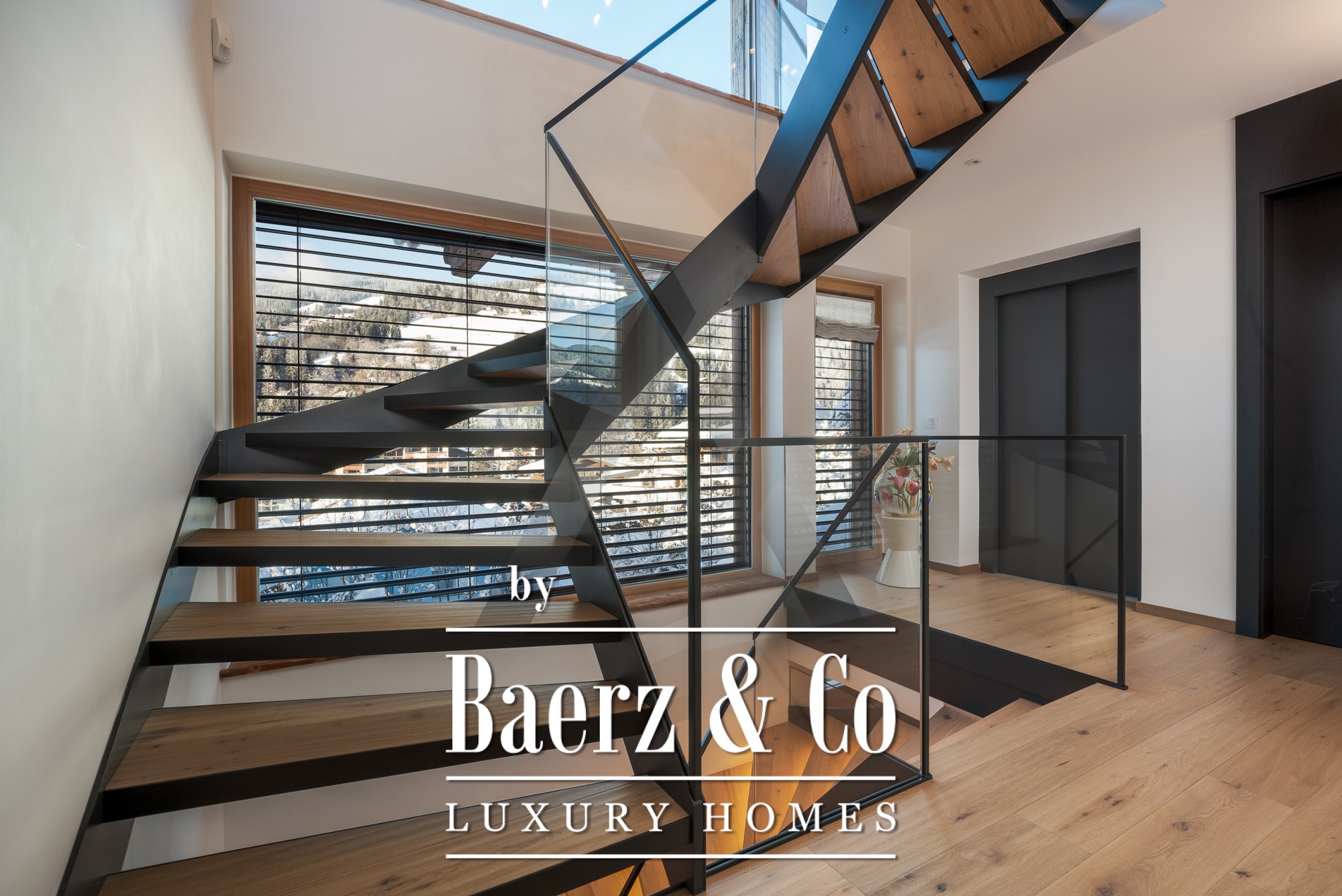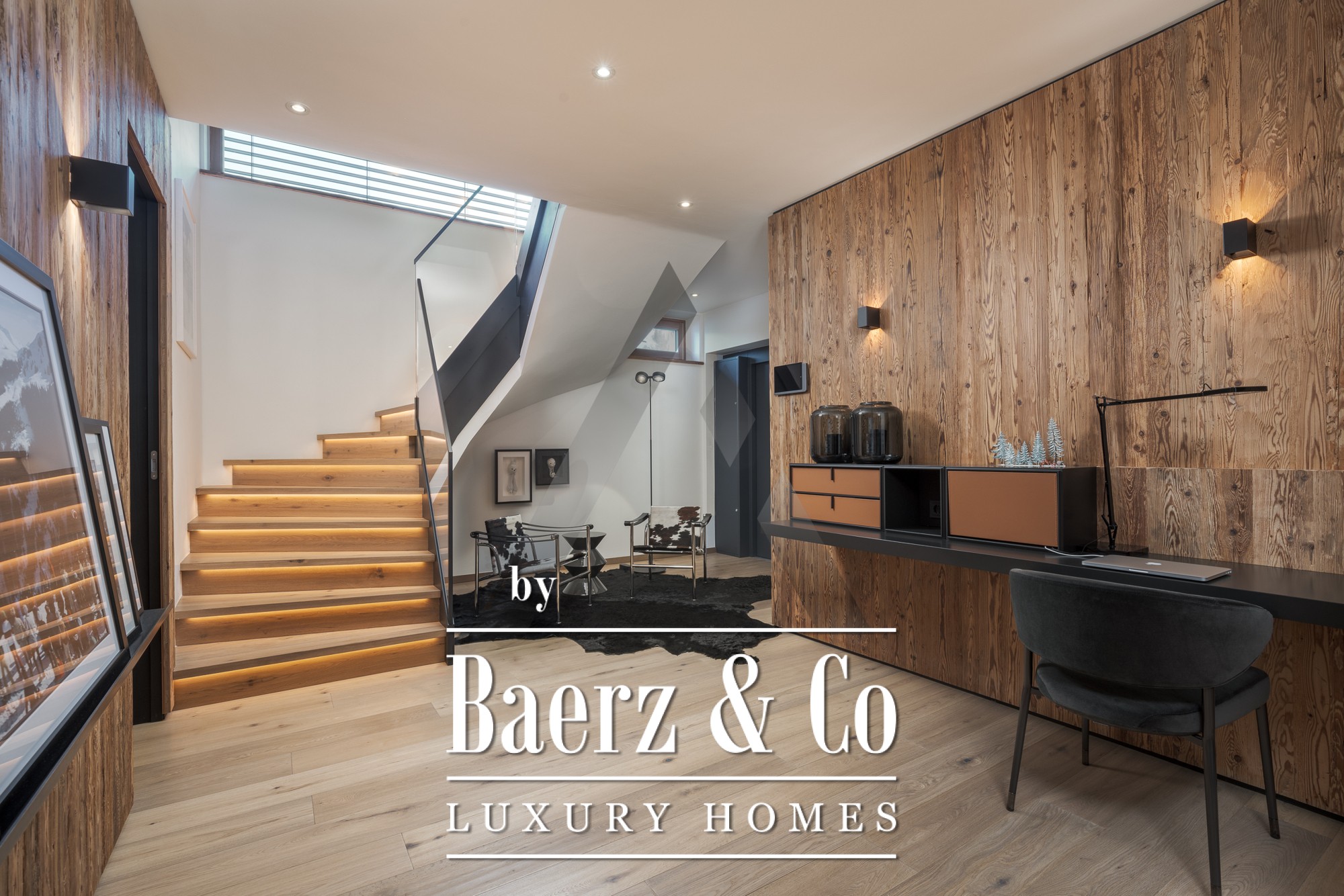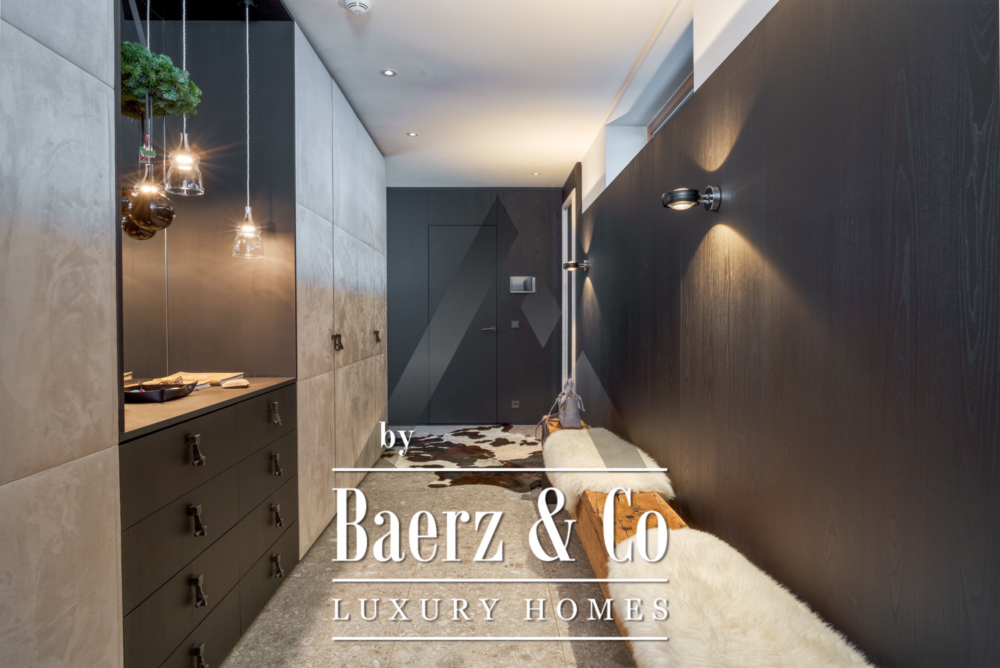 Na uwagę zasługują detale: designerskie oświetlenie Occhio, ogrzewanie geotermalne, klimatyzacja i winda. Garaż na dwa samochody oraz miejsce postojowe na zewnątrz gwarantują miejsce zarówno dla samochodów, jak i sprzętu do aktywności alpejskich. Całość obejmuje indywidualnie zaprojektowane elementy wykończenia i meble renomowanego projektanta.