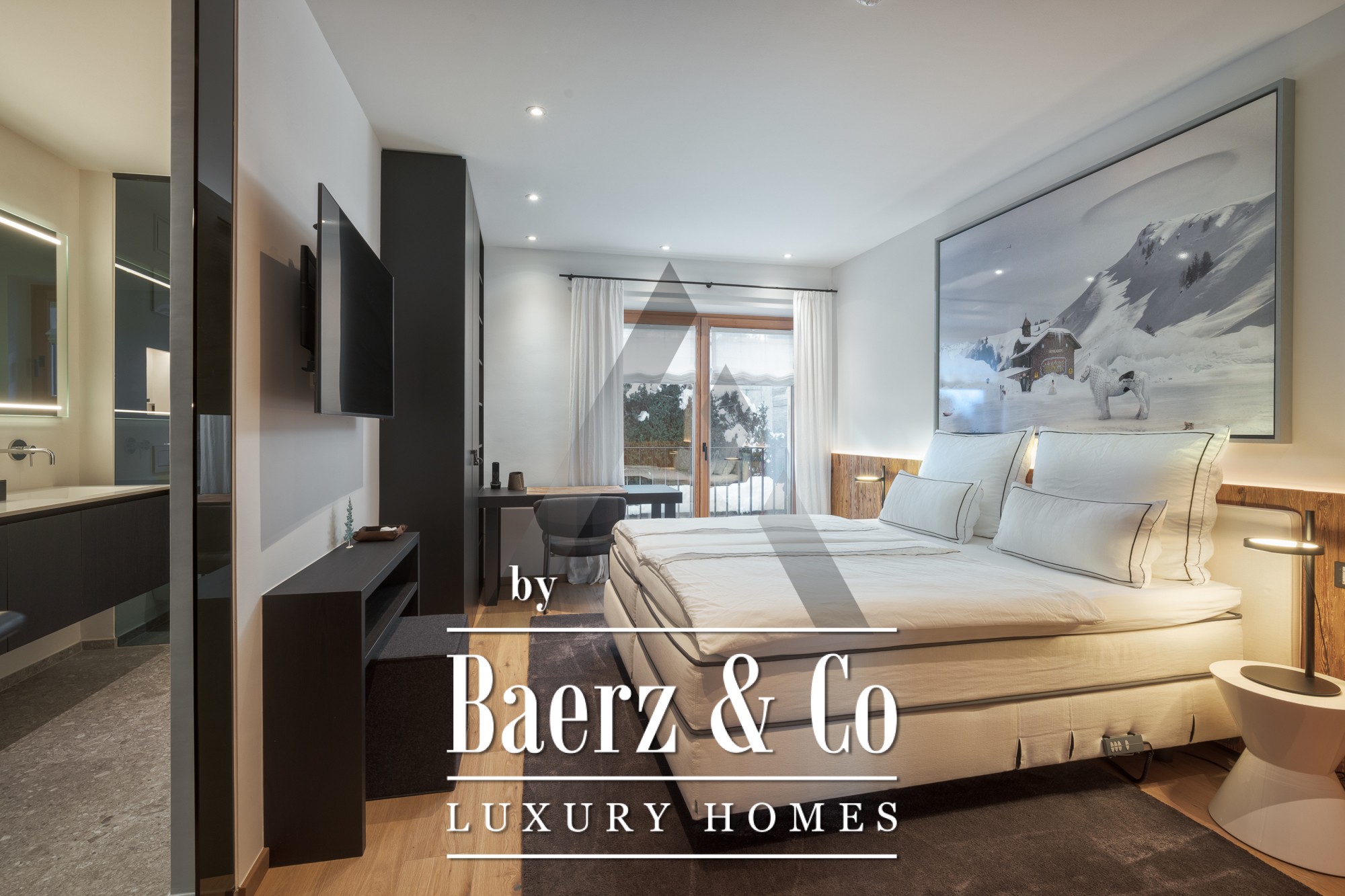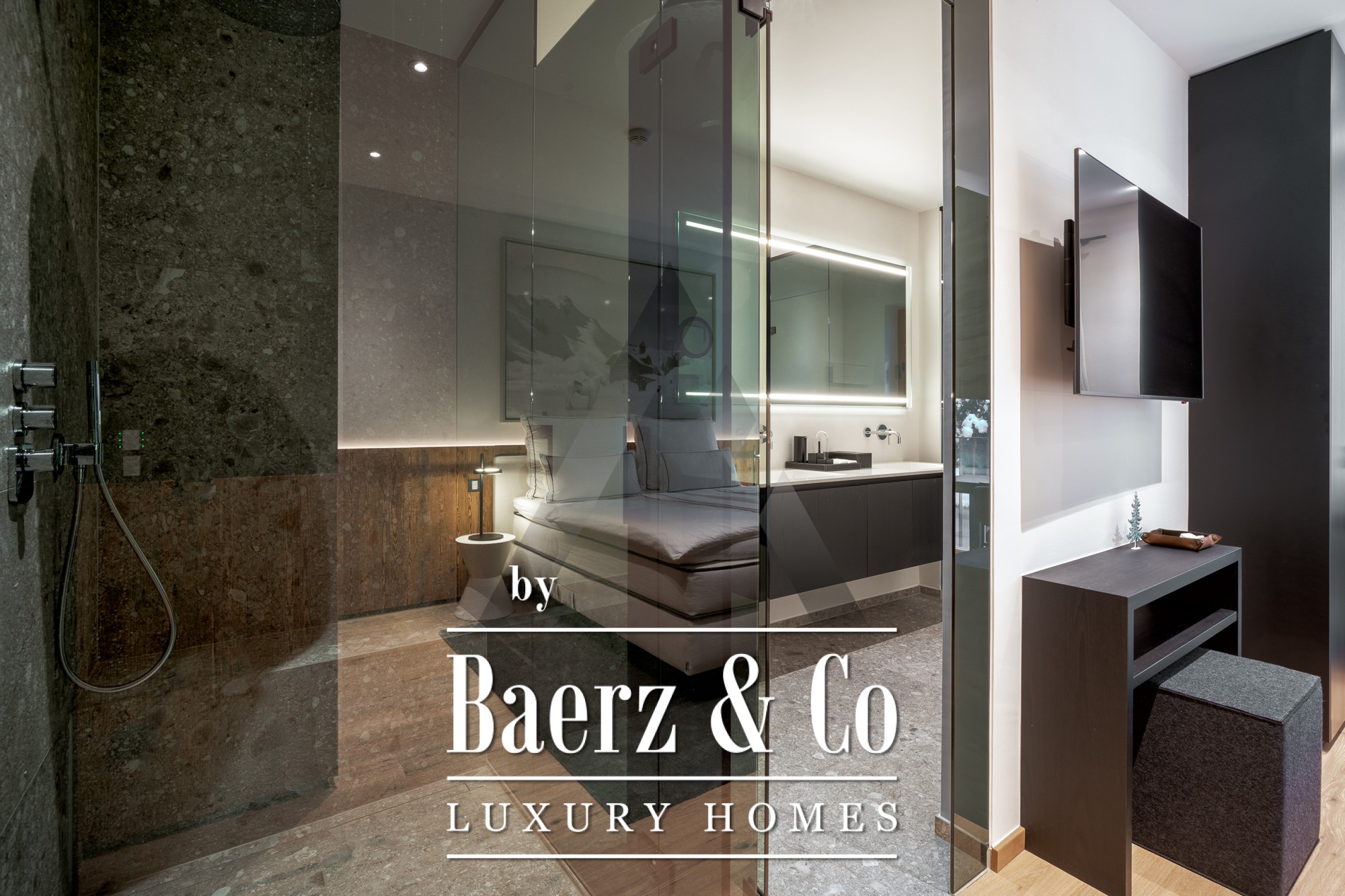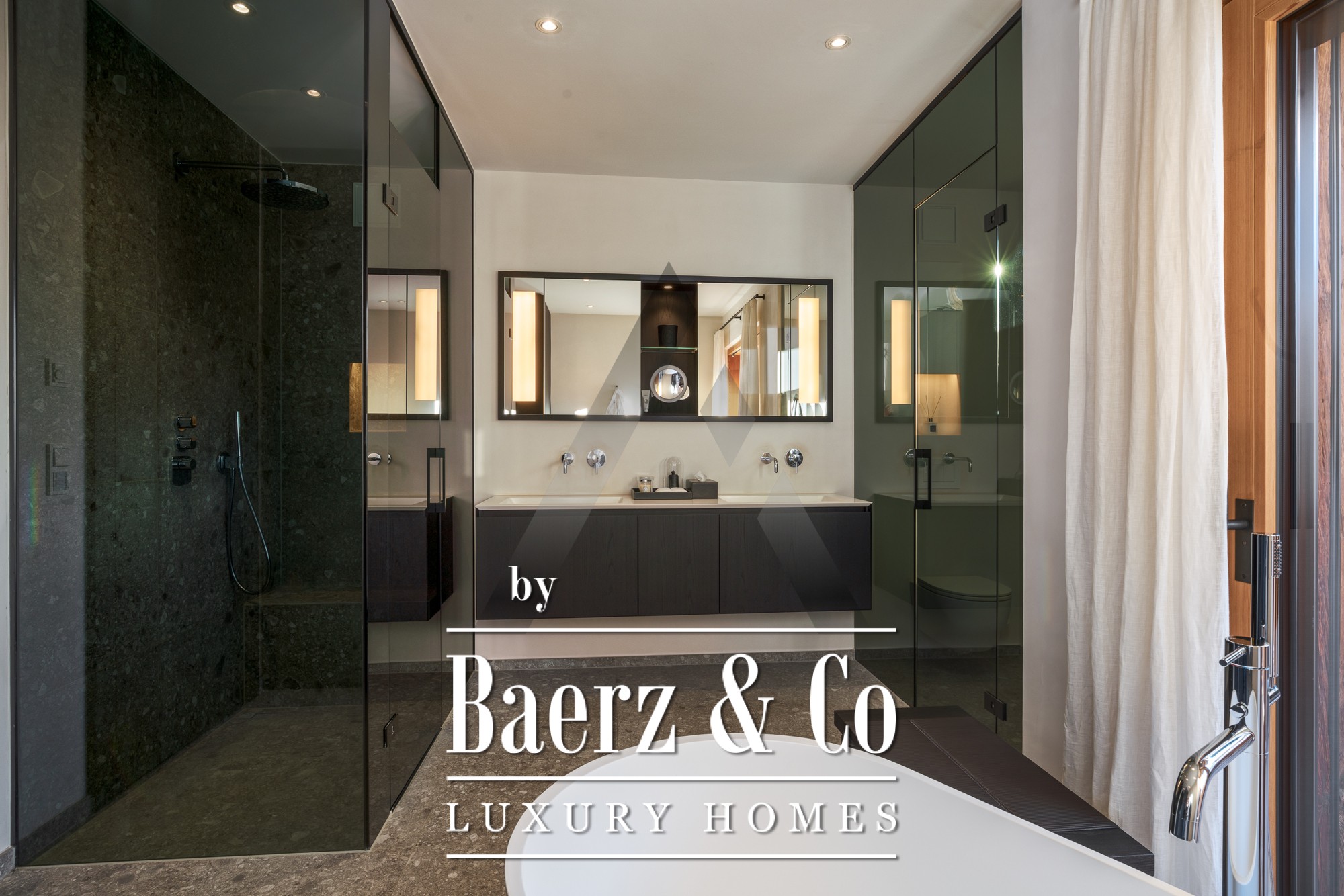 Na uwagę zasługują detale: designerskie oświetlenie Occhio, ogrzewanie geotermalne, klimatyzacja i winda. Garaż na dwa samochody oraz miejsce postojowe na zewnątrz gwarantują miejsce zarówno dla samochodów, jak i sprzętu do aktywności alpejskich. Całość obejmuje indywidualnie zaprojektowane elementy wykończenia i meble renomowanego projektanta.