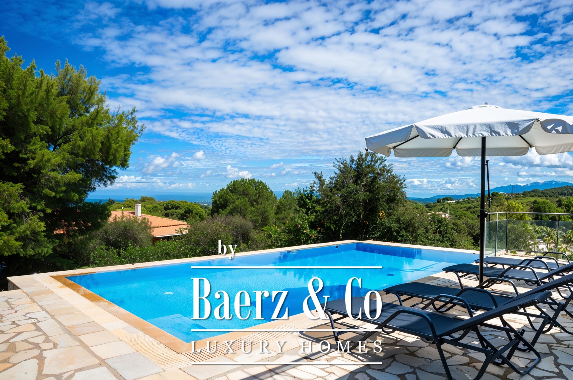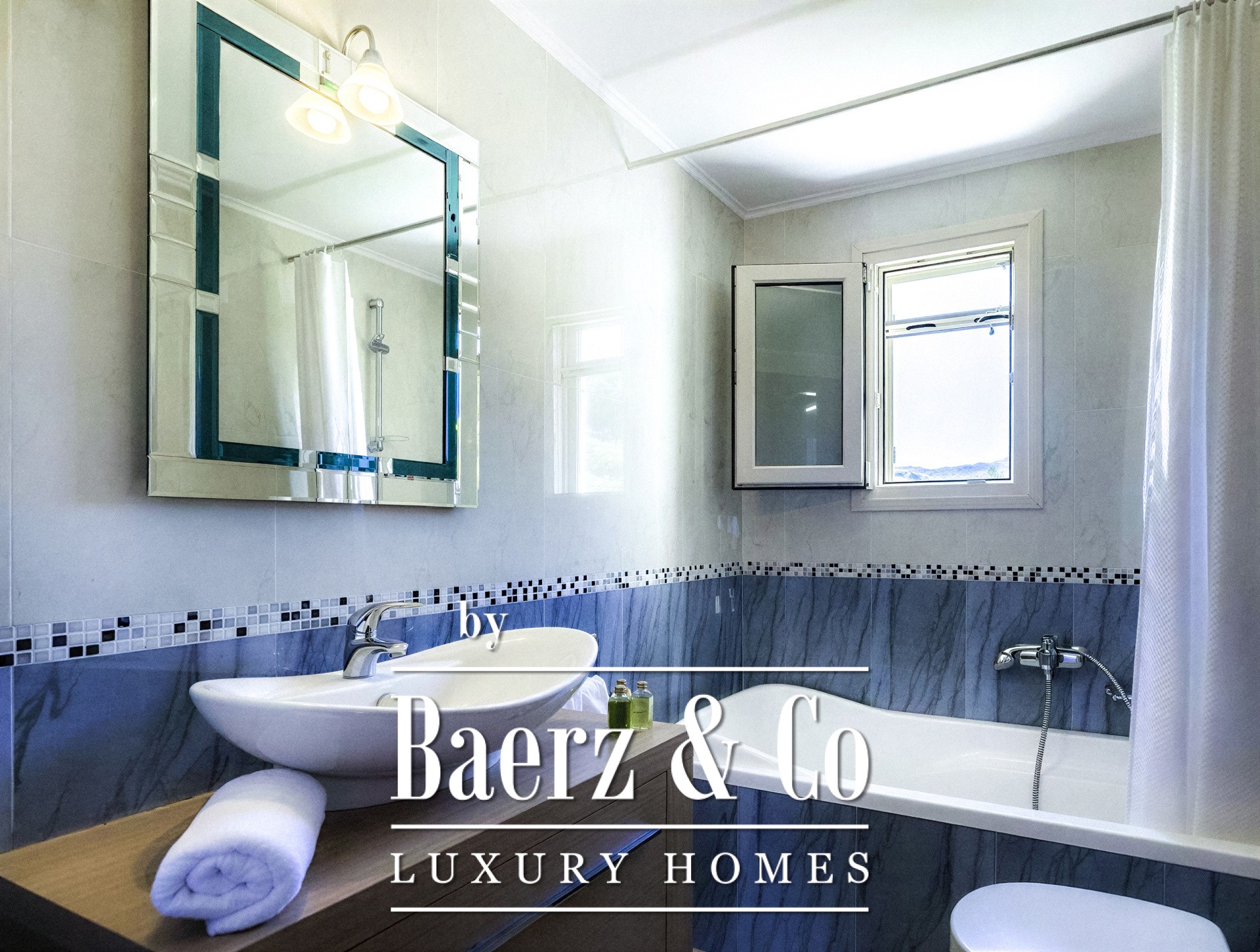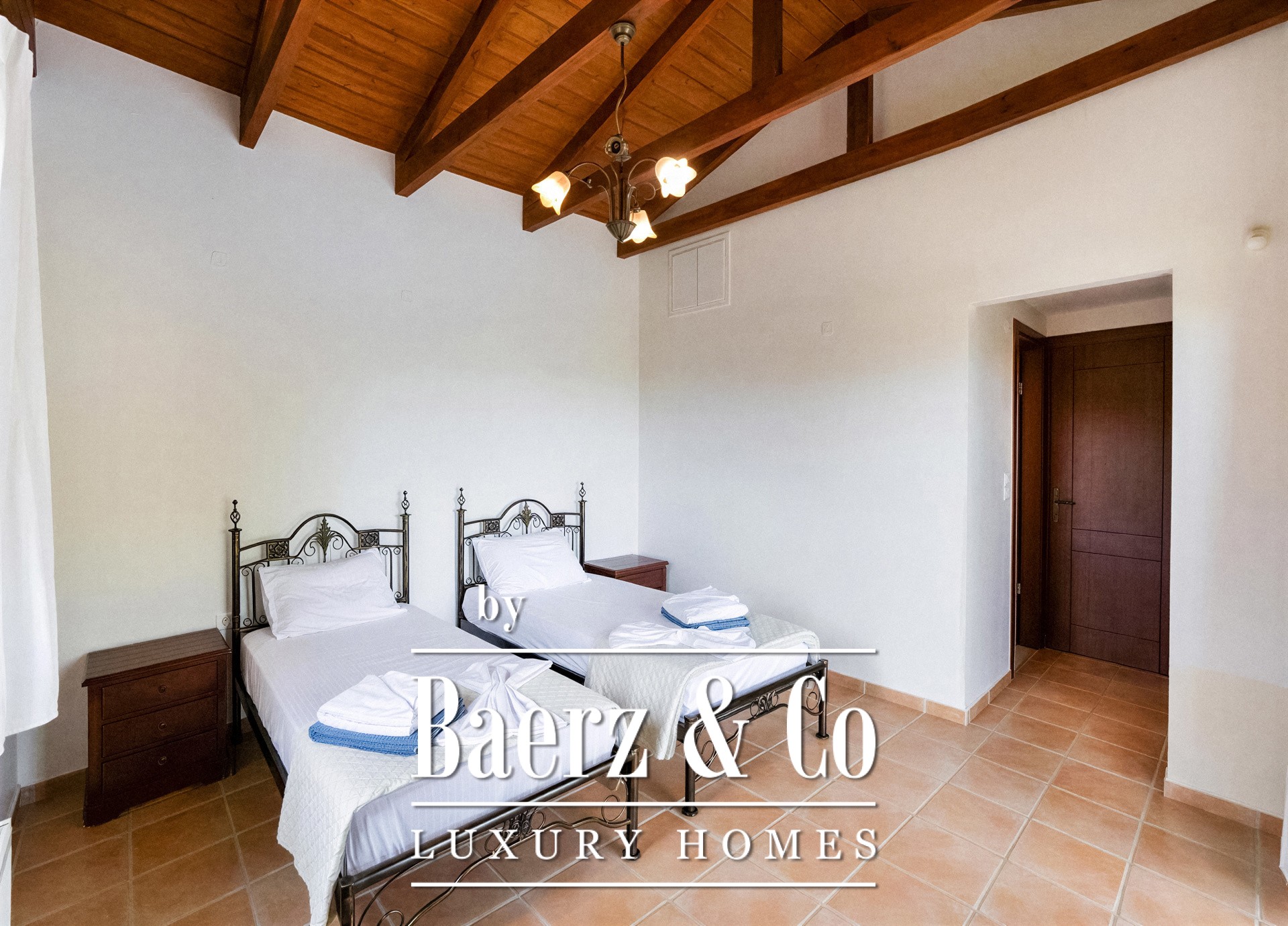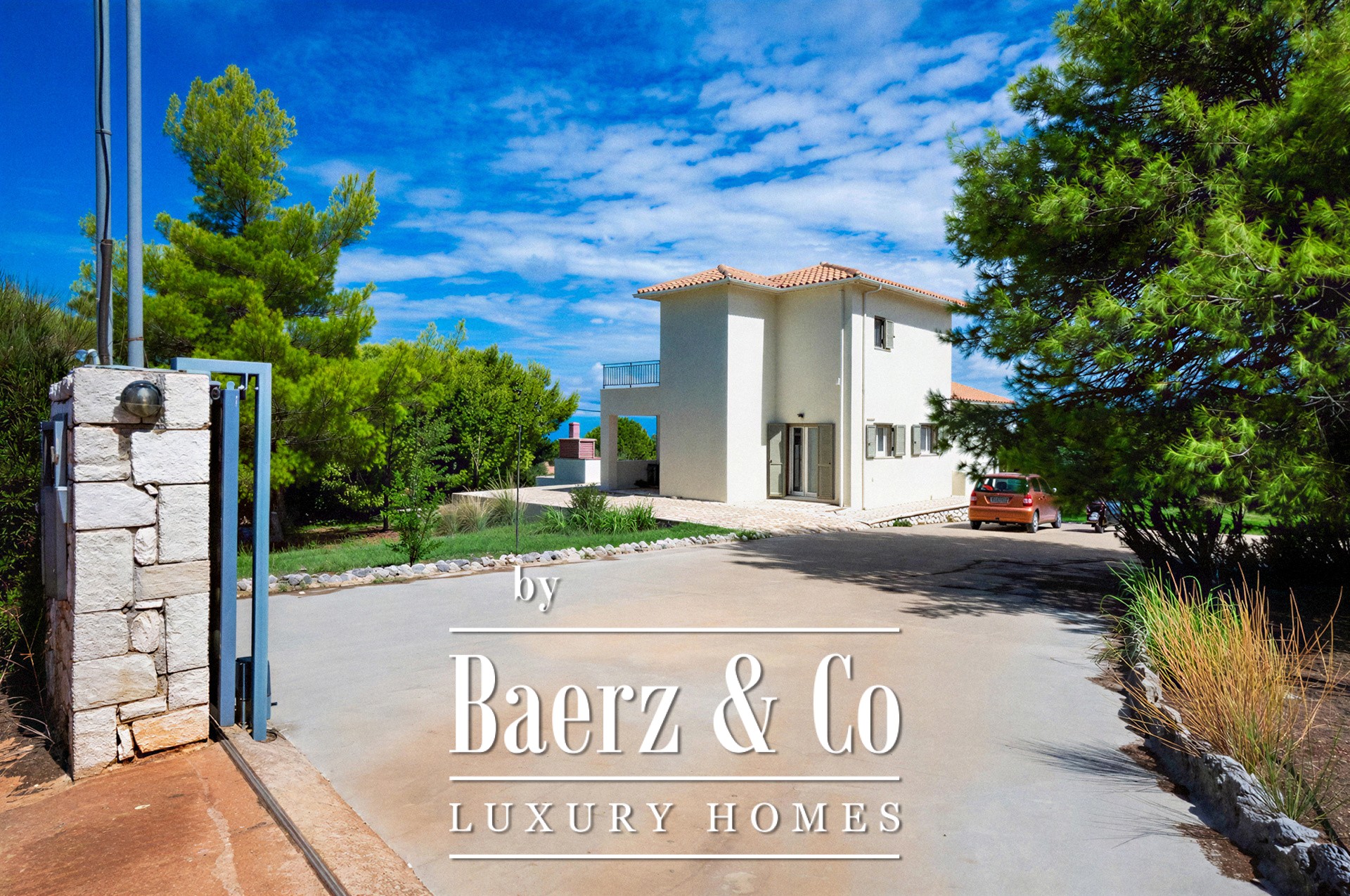 Na zewnątrz rozciągają się starannie zagospodarowane ogrody, drzewa oliwne, rozległe trawniki oraz dwa prywatne baseny typu infinity po 32 m² każdy, z wydzielonymi strefami grillowymi i utwardzonymi tarasami. Nieruchomość dysponuje sześcioma miejscami parkingowymi i znajduje się w doskonałym stanie technicznym, stanowiąc wyjątkową propozycję na prywatną rezydencję wakacyjną, inwestycję na rynku najmu krótkoterminowego lub jako droga do uzyskania Golden Visa.