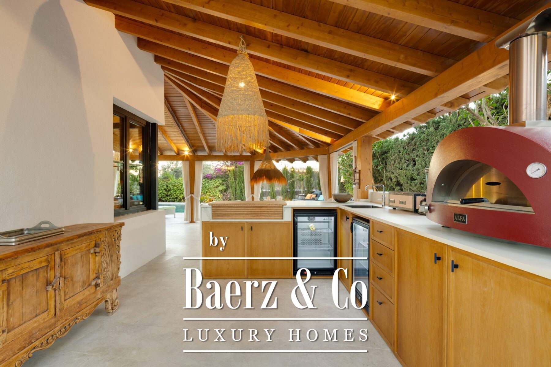 Salon z kominkiem stanowi centrum domu, otwierając się na reprezentacyjną jadalnię oraz nowoczesną, w pełni wyposażoną kuchnię. Willa zapewnia prywatność i niezależność gościom lub członkom rodziny dzięki oddzielnemu apartamentowi z własnym wejściem i kuchnią, umożliwiając swobodę wyboru między integracją a kameralnością. Na zewnątrz prywatny basen otaczają zadbane ogrody, a kuchnia na świeżym powietrzu i grill pozwalają na swobodne przyjmowanie gości. Green do gry w golfa zachęca do spokojnego relaksu, podkreślając bliskość do renomowanych pól golfowych Guadalmina.