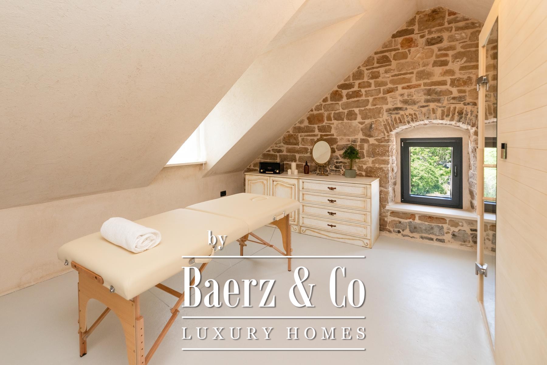 Na poddaszu czeka prywatna strefa spa z sauną, jacuzzi i miejscem do masażu, oferując atmosferę odprężenia i osobistego dobrostanu. Ten kamienny dom w Pučišća stanowi autentyczną ostoję na wybrzeżu Brač, harmonijnie łącząc dziedzictwo, współczesny styl życia i powściągliwe wysublimowanie.