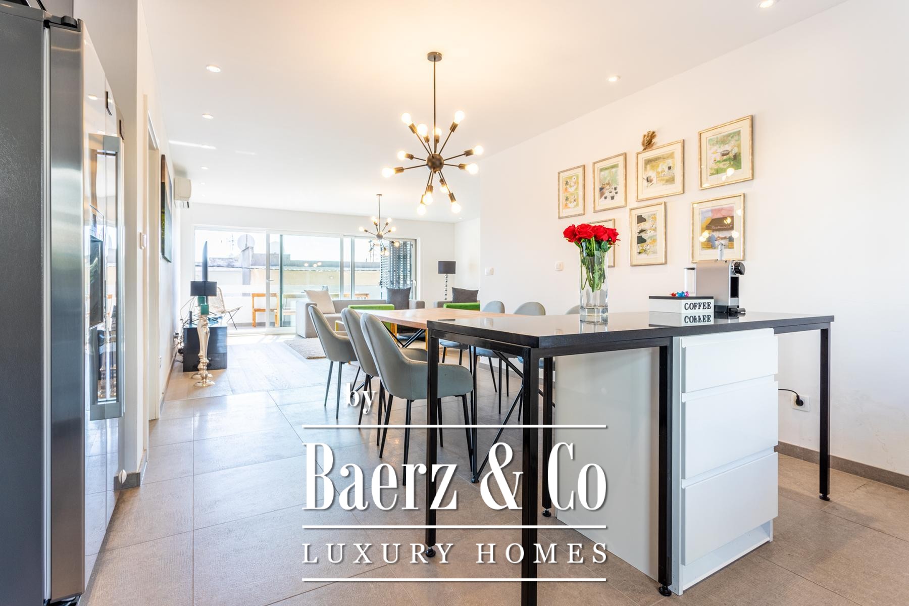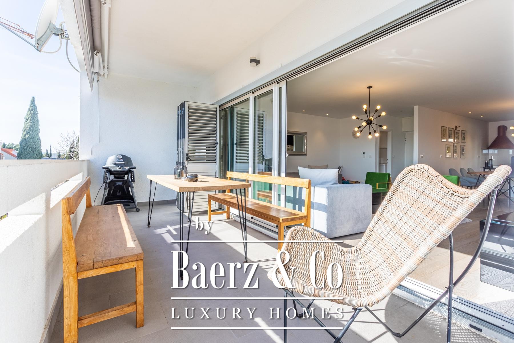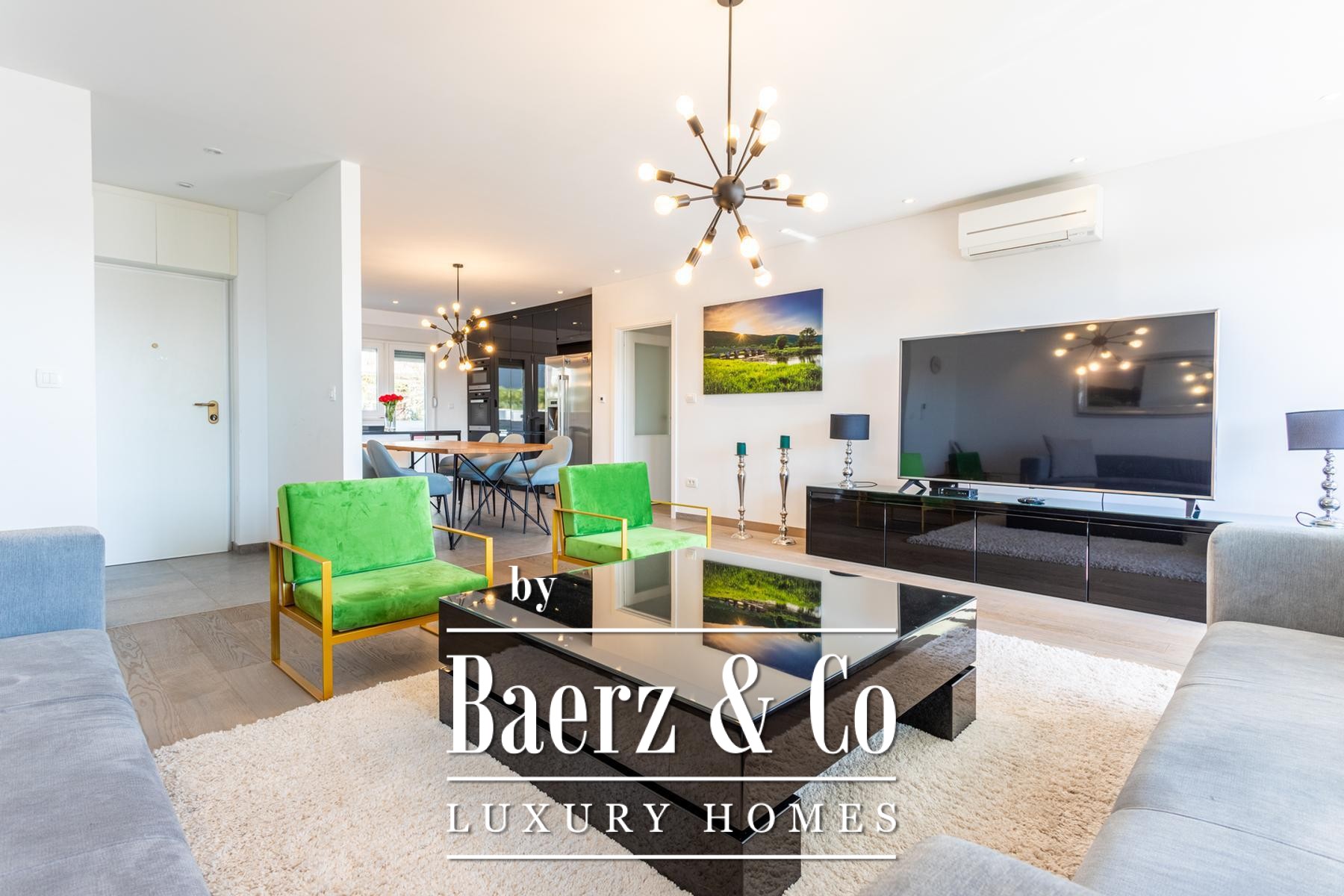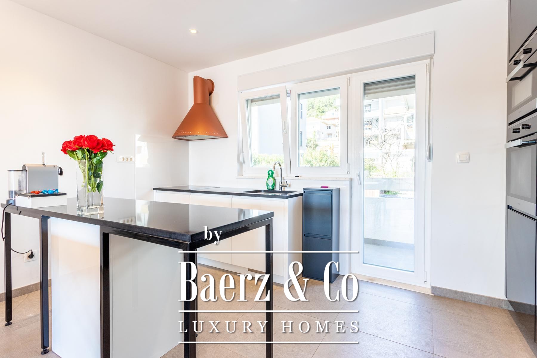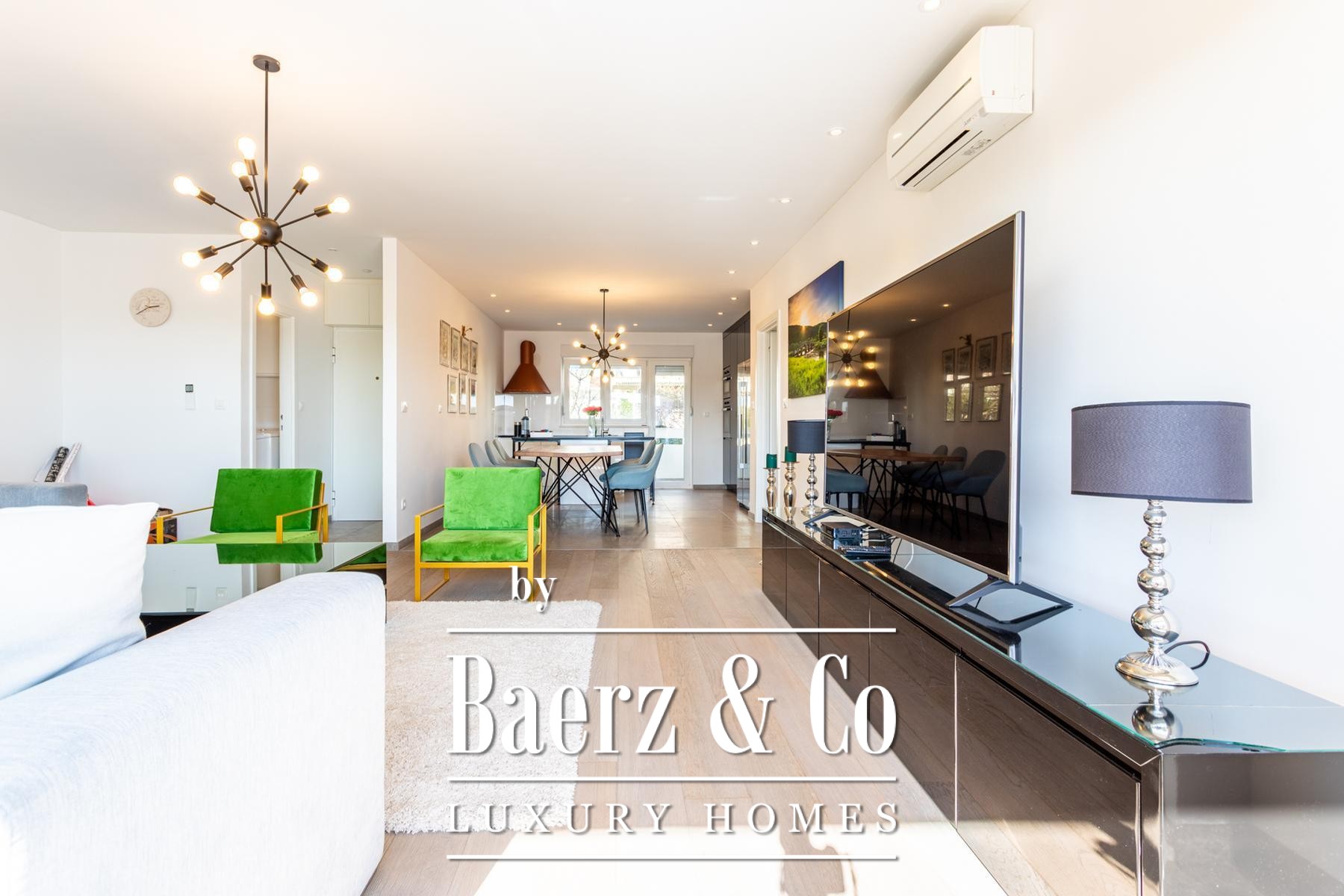 Wnętrze, w pełni odnowione i stylowo wykończone, wyróżnia się ponadczasową jakością i przemyślanym designem. Przestronne balkony oraz tarasy o łącznej powierzchni 50 m² od strony wschodniej i południowej zapewniają dużo naturalnego światła oraz częściowy widok na morze. Otwarta strefa dzienna płynnie łączy kuchnię, wyposażoną w urządzenia Miele i Bosch, jadalnię i salon, wszystkie z bezpośrednim wyjściem na taras, co sprzyja komfortowemu połączeniu życia wewnątrz i na zewnątrz.