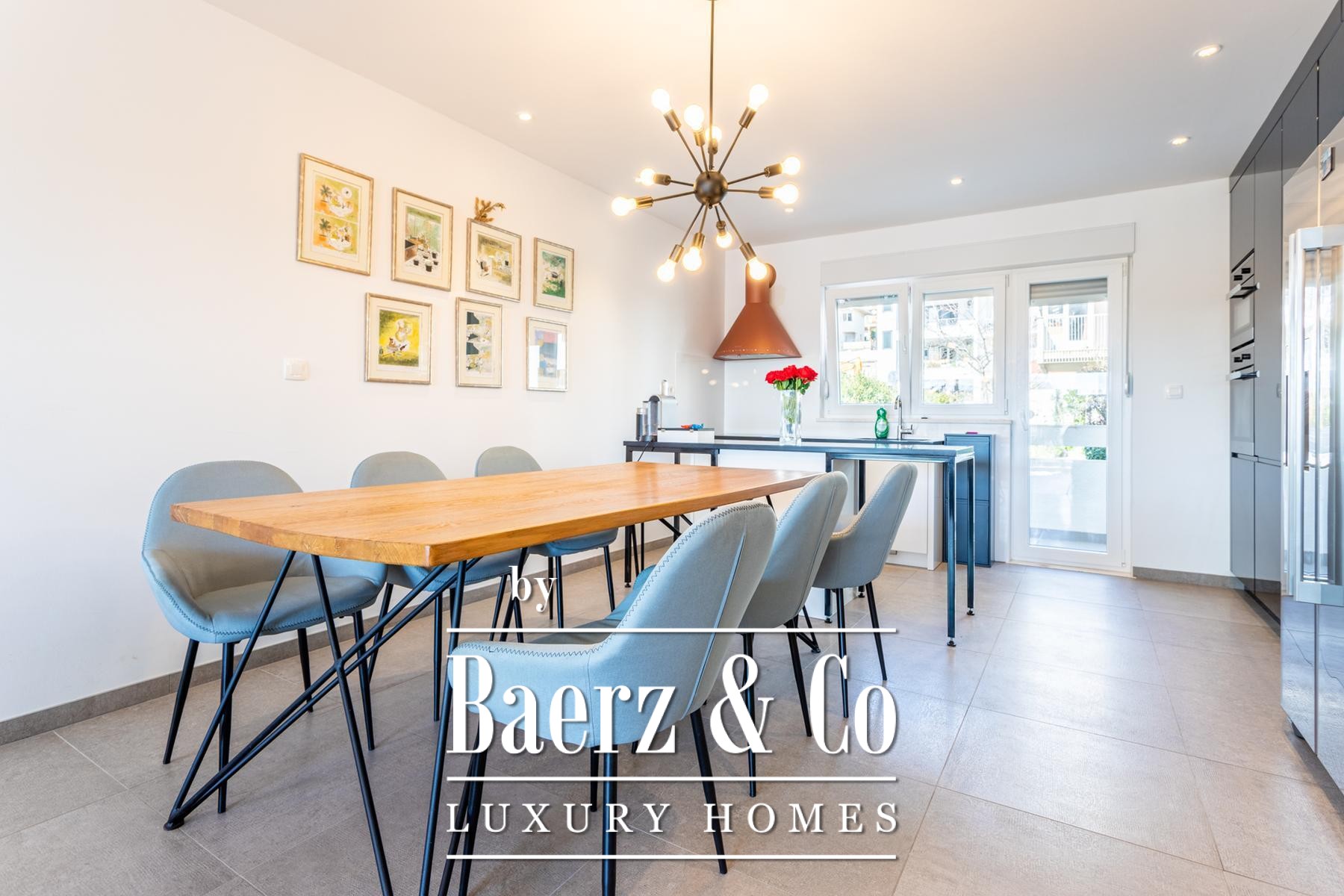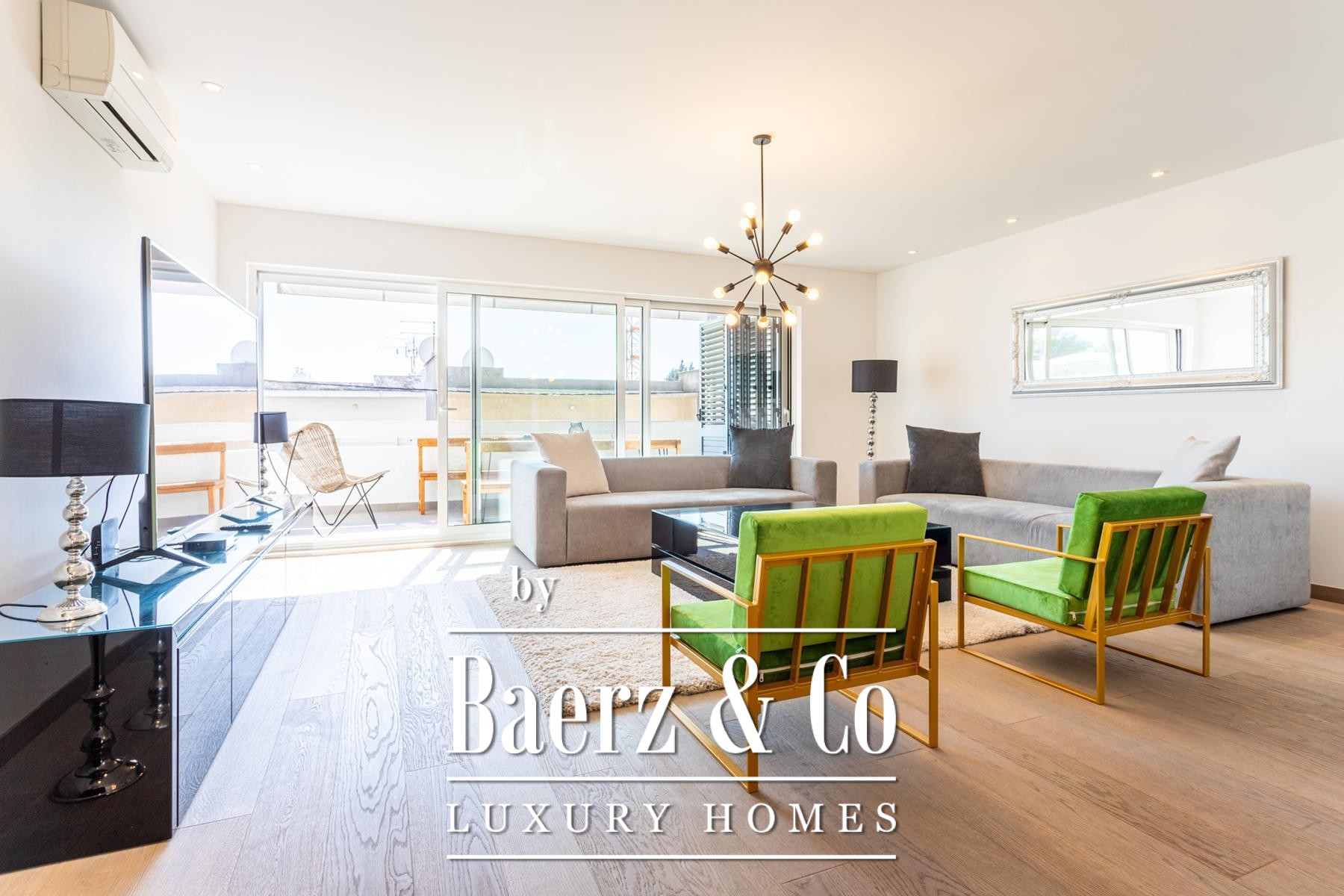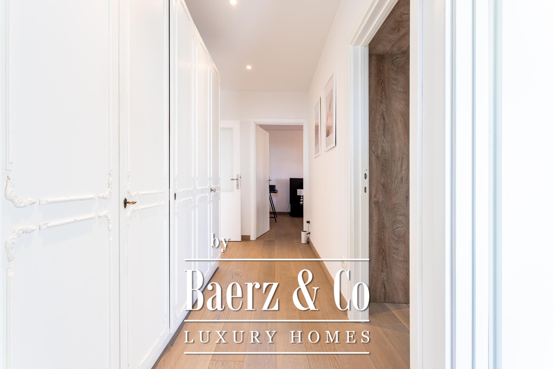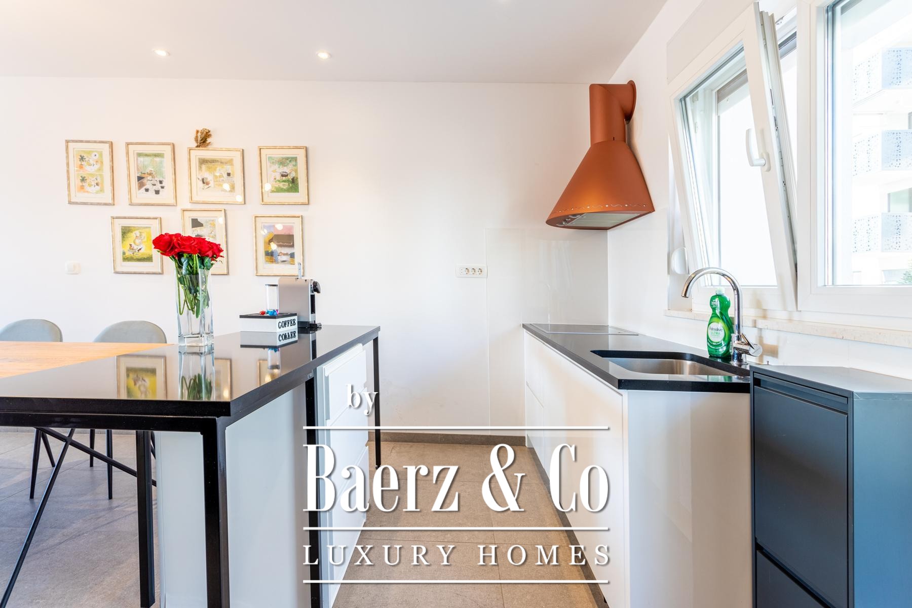 Wnętrze, w pełni odnowione i stylowo wykończone, wyróżnia się ponadczasową jakością i przemyślanym designem. Przestronne balkony oraz tarasy o łącznej powierzchni 50 m² od strony wschodniej i południowej zapewniają dużo naturalnego światła oraz częściowy widok na morze. Otwarta strefa dzienna płynnie łączy kuchnię, wyposażoną w urządzenia Miele i Bosch, jadalnię i salon, wszystkie z bezpośrednim wyjściem na taras, co sprzyja komfortowemu połączeniu życia wewnątrz i na zewnątrz.