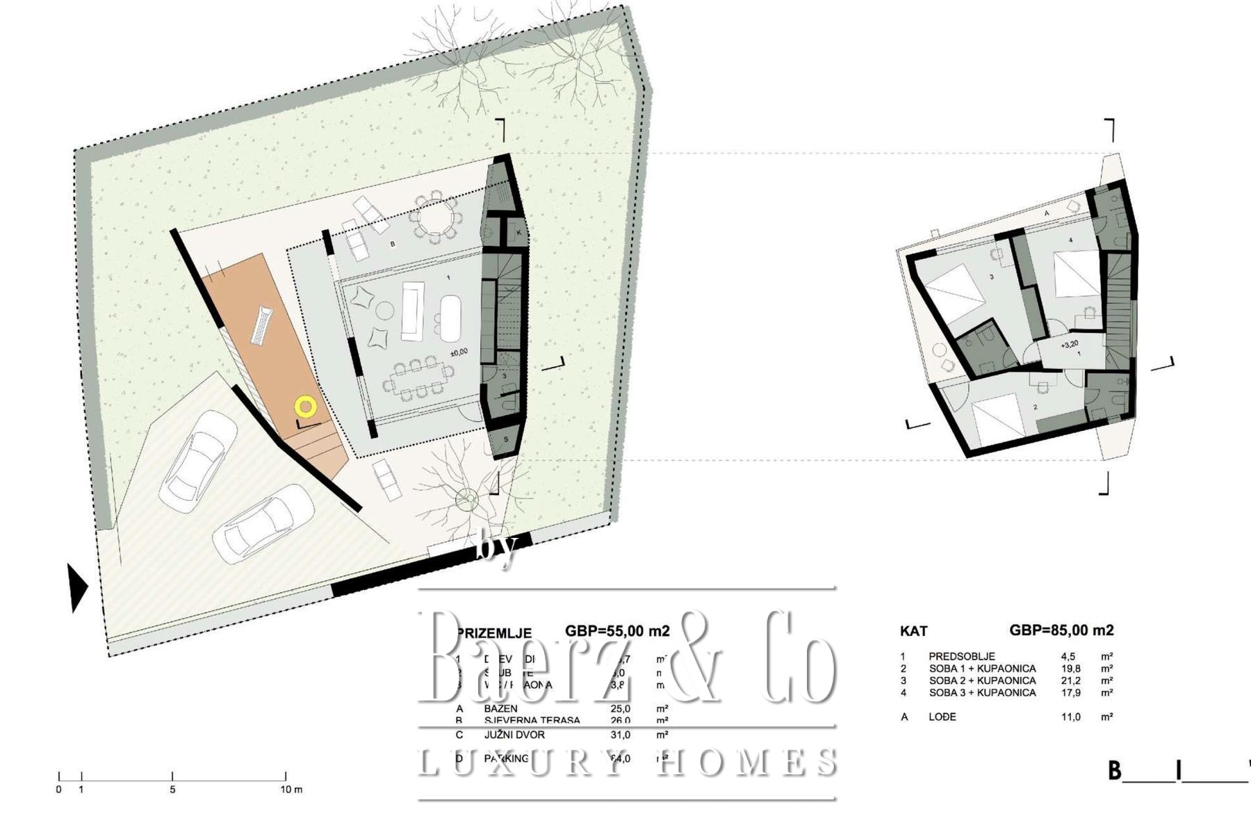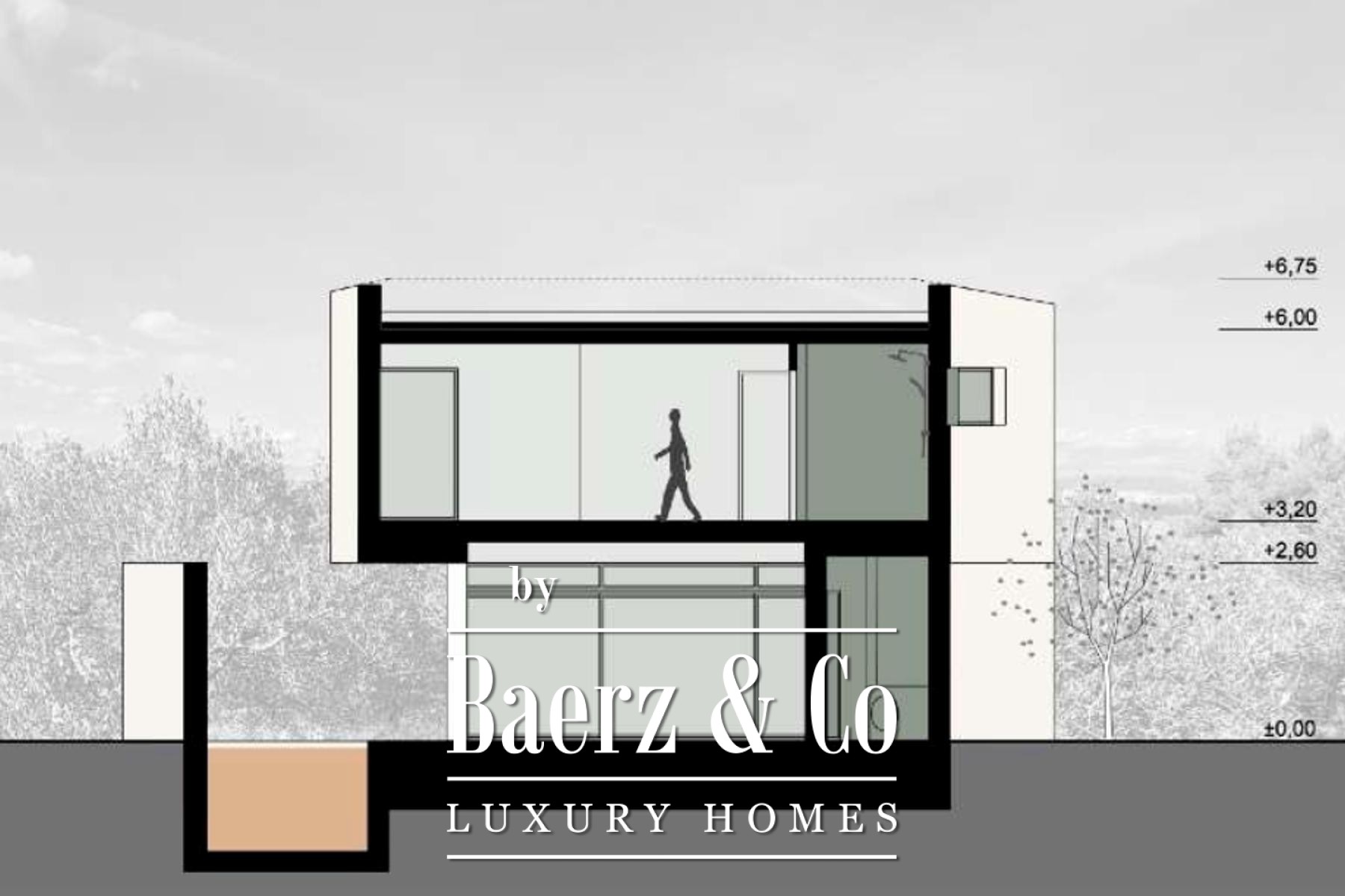 Na piętrze trzy sypialnie mają własne łazienki i dostęp do loggii skierowanej na otwarty widok morza. Na zewnątrz rozpościera się ogród w stylu śródziemnomorskim, miejsce na grilla, przestronne tarasy, balkony oraz kilka miejsc parkingowych dyskretnie rozmieszczonych od zachodniej strony działki o powierzchni 286 m².