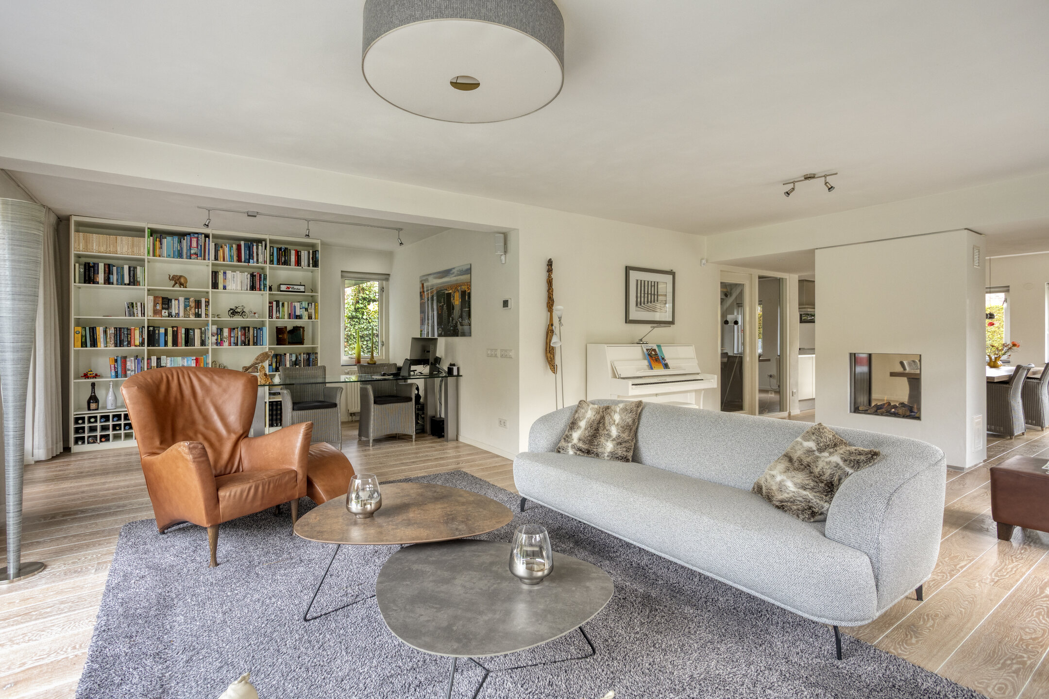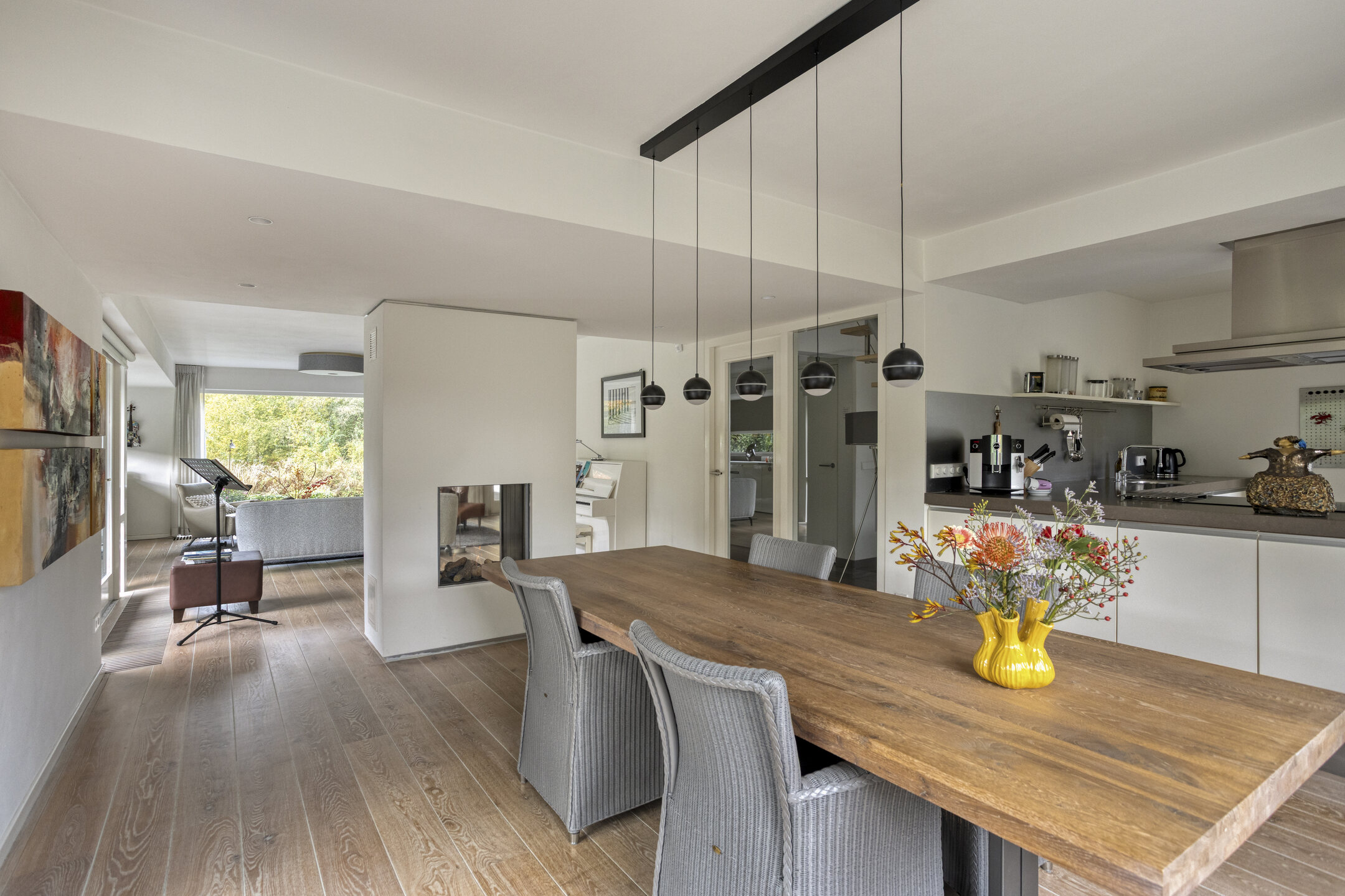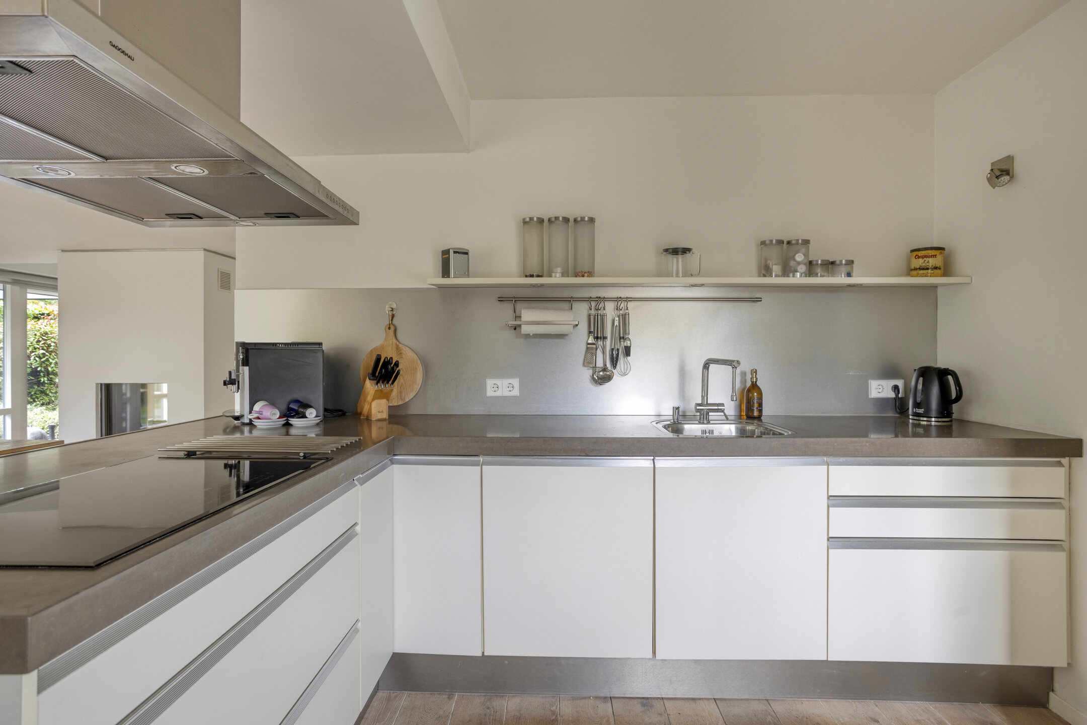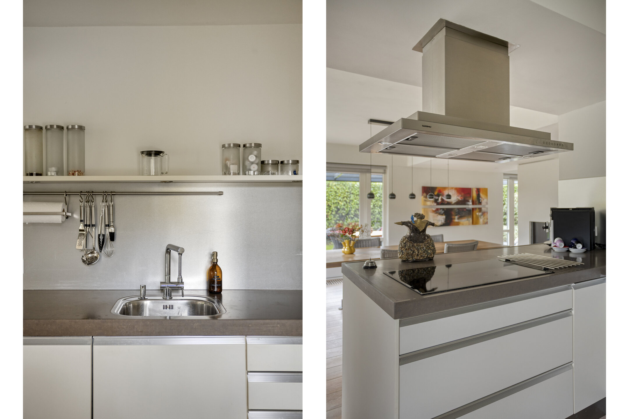À chegada, um hall espaçoso abre-se para pisos de carvalho e portas de vidro de linhas puras. A sala de estar e a cozinha em open space são divididas por uma lareira Bellfire de dupla face, conferindo ao espaço um calor silencioso. A cozinha de luxo, equipada com eletrodomésticos topo de gama e bancada em pedra azul belga, proporciona funcionalidade e distinção na vivência diária. A fachada posterior, marcada por envidraçados generosos, enquadra o jardim e a paisagem protegida de Egmonderhout ao fundo.