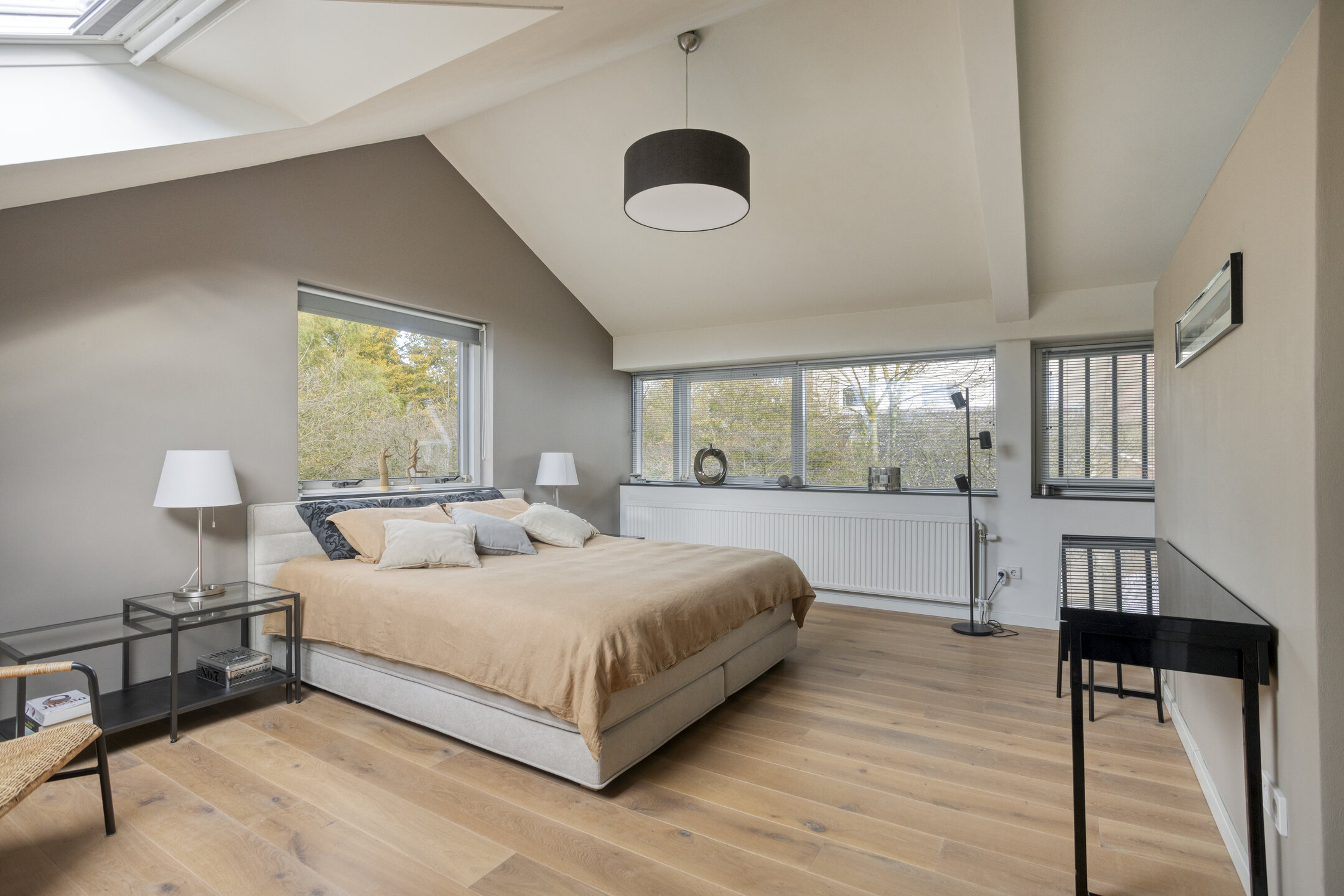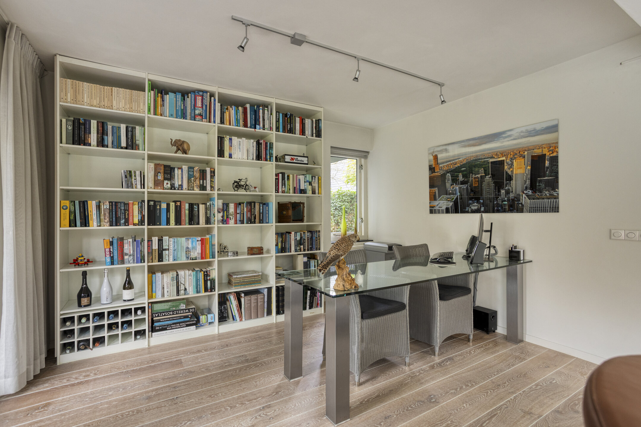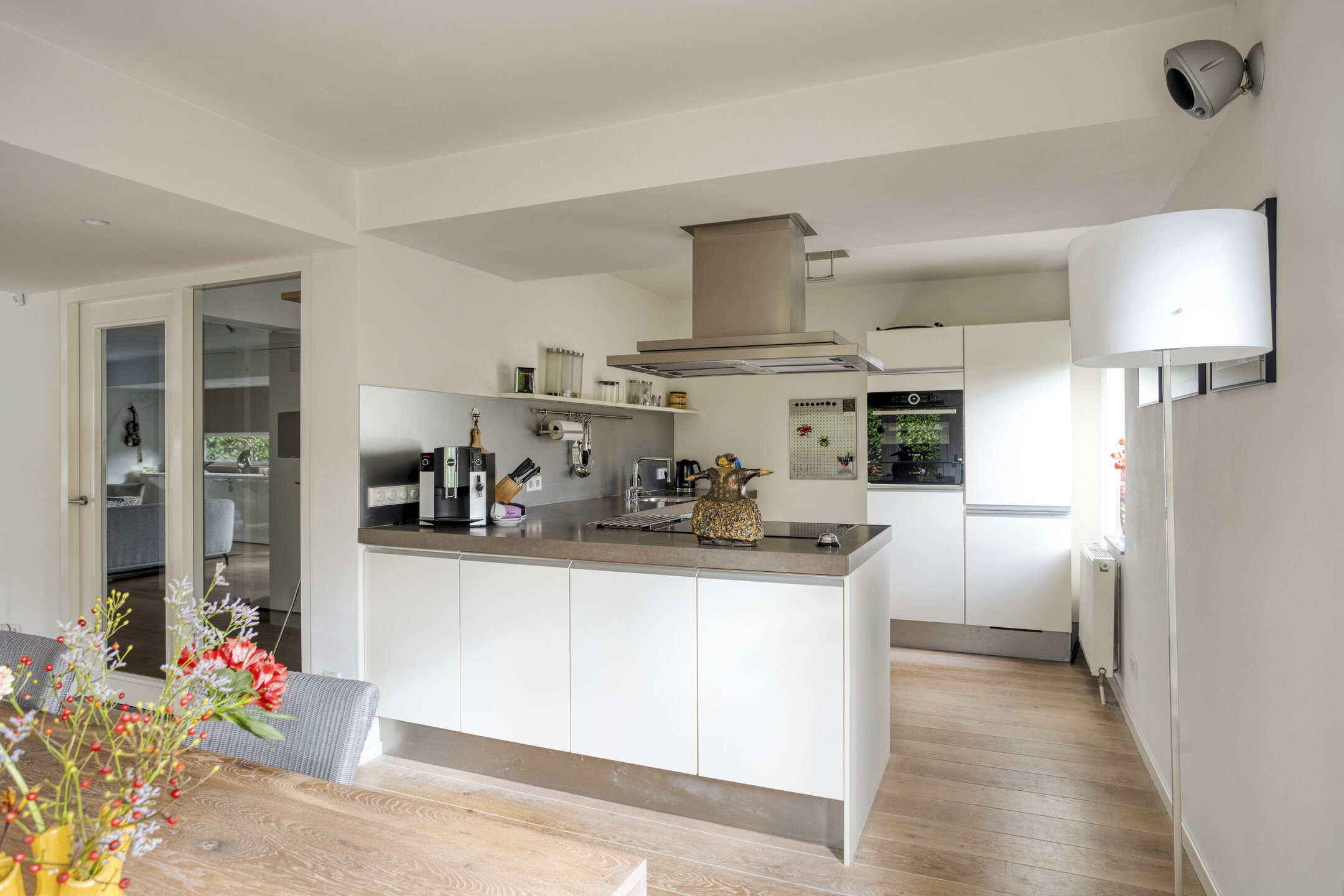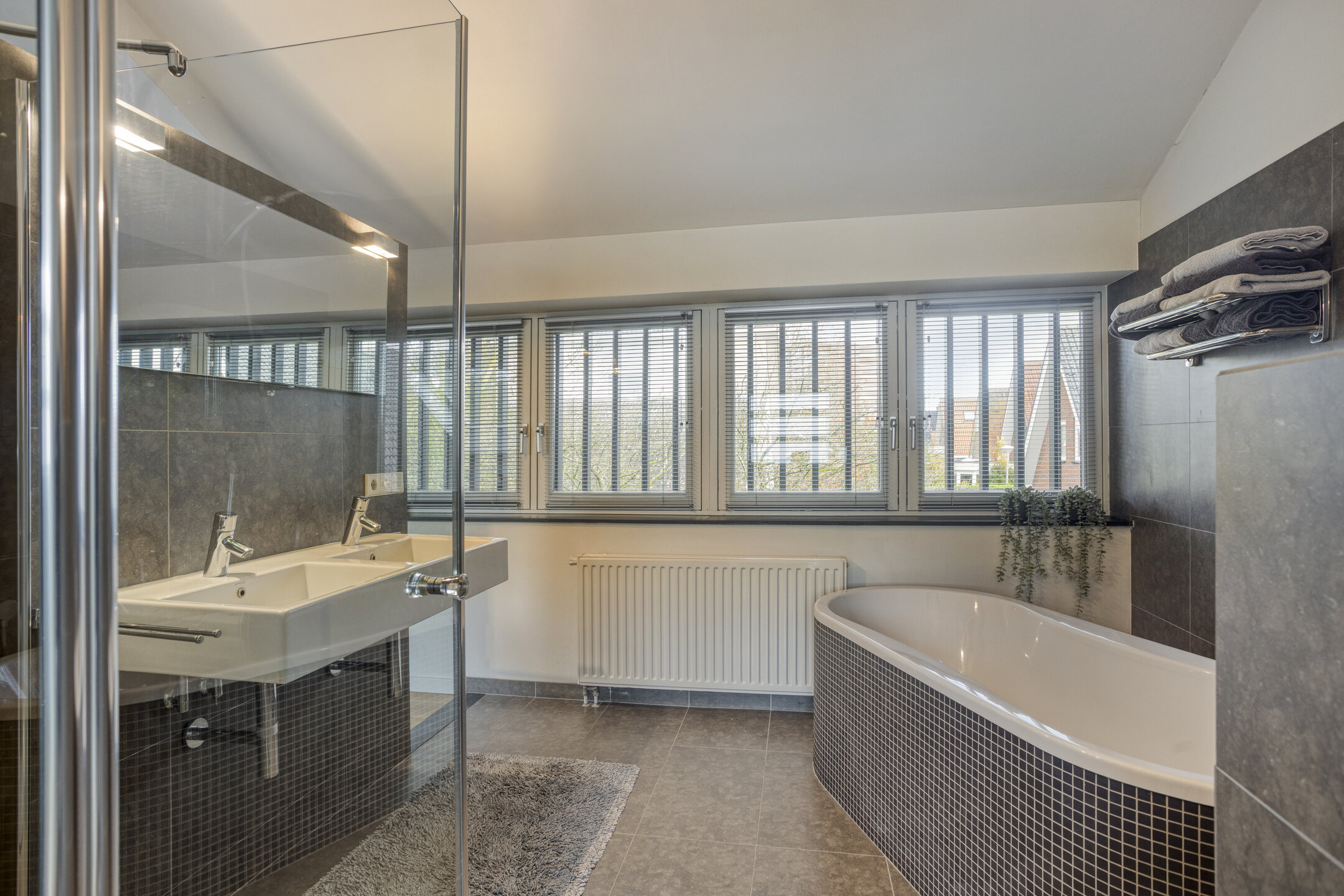 À chegada, um hall espaçoso abre-se para pisos de carvalho e portas de vidro de linhas puras. A sala de estar e a cozinha em open space são divididas por uma lareira Bellfire de dupla face, conferindo ao espaço um calor silencioso. A cozinha de luxo, equipada com eletrodomésticos topo de gama e bancada em pedra azul belga, proporciona funcionalidade e distinção na vivência diária. A fachada posterior, marcada por envidraçados generosos, enquadra o jardim e a paisagem protegida de Egmonderhout ao fundo.
