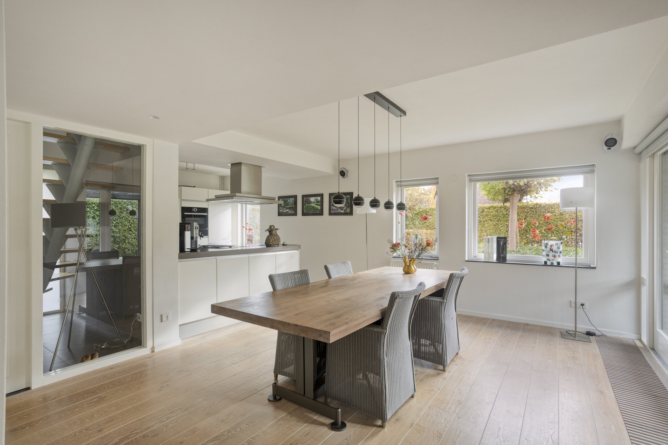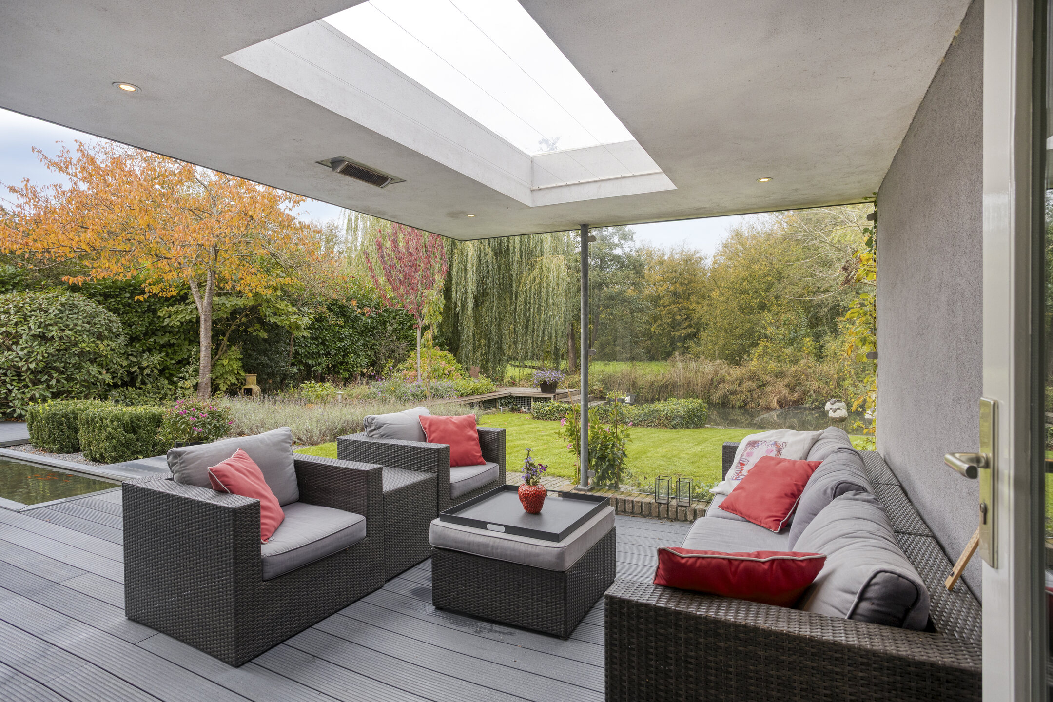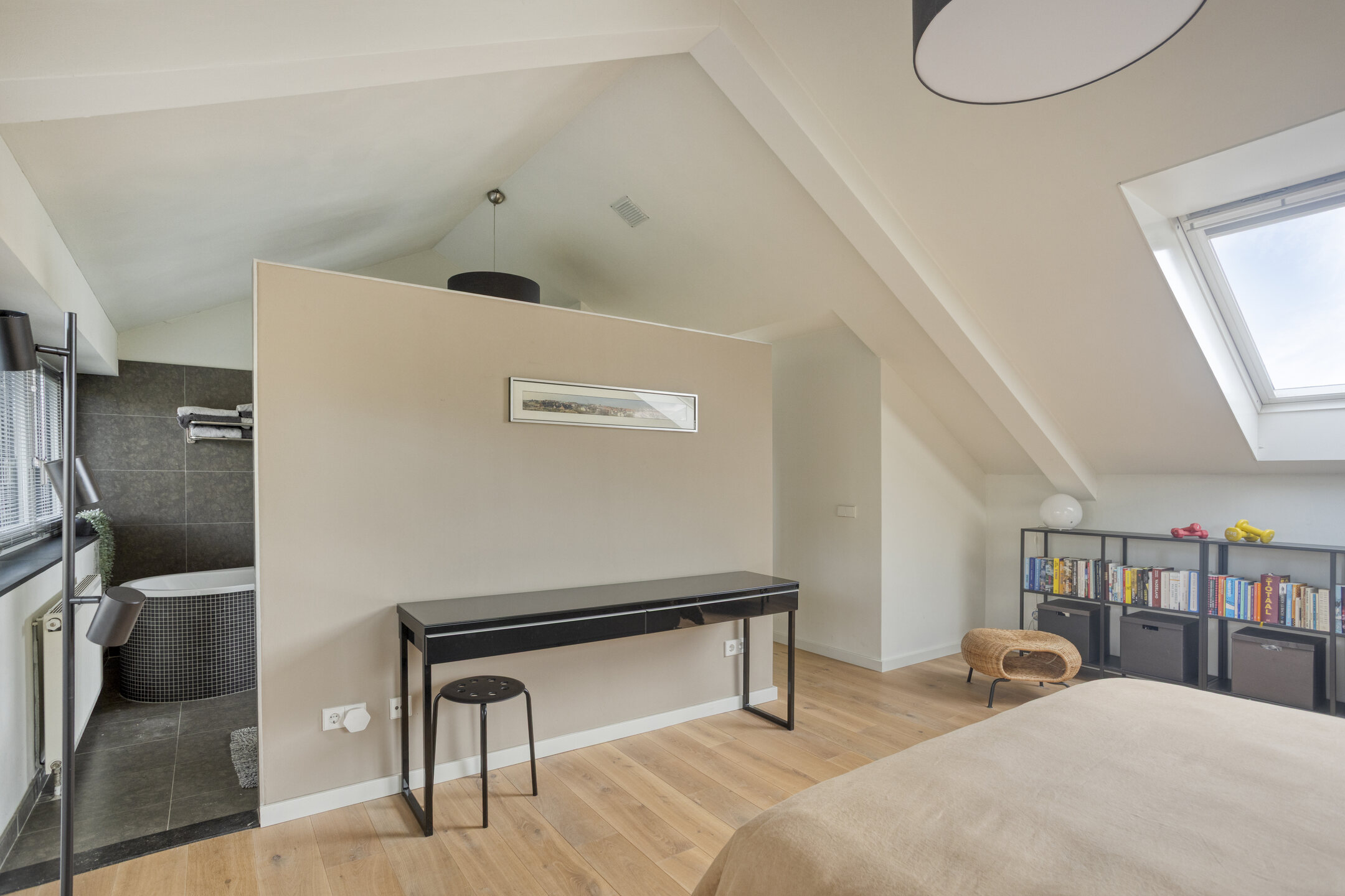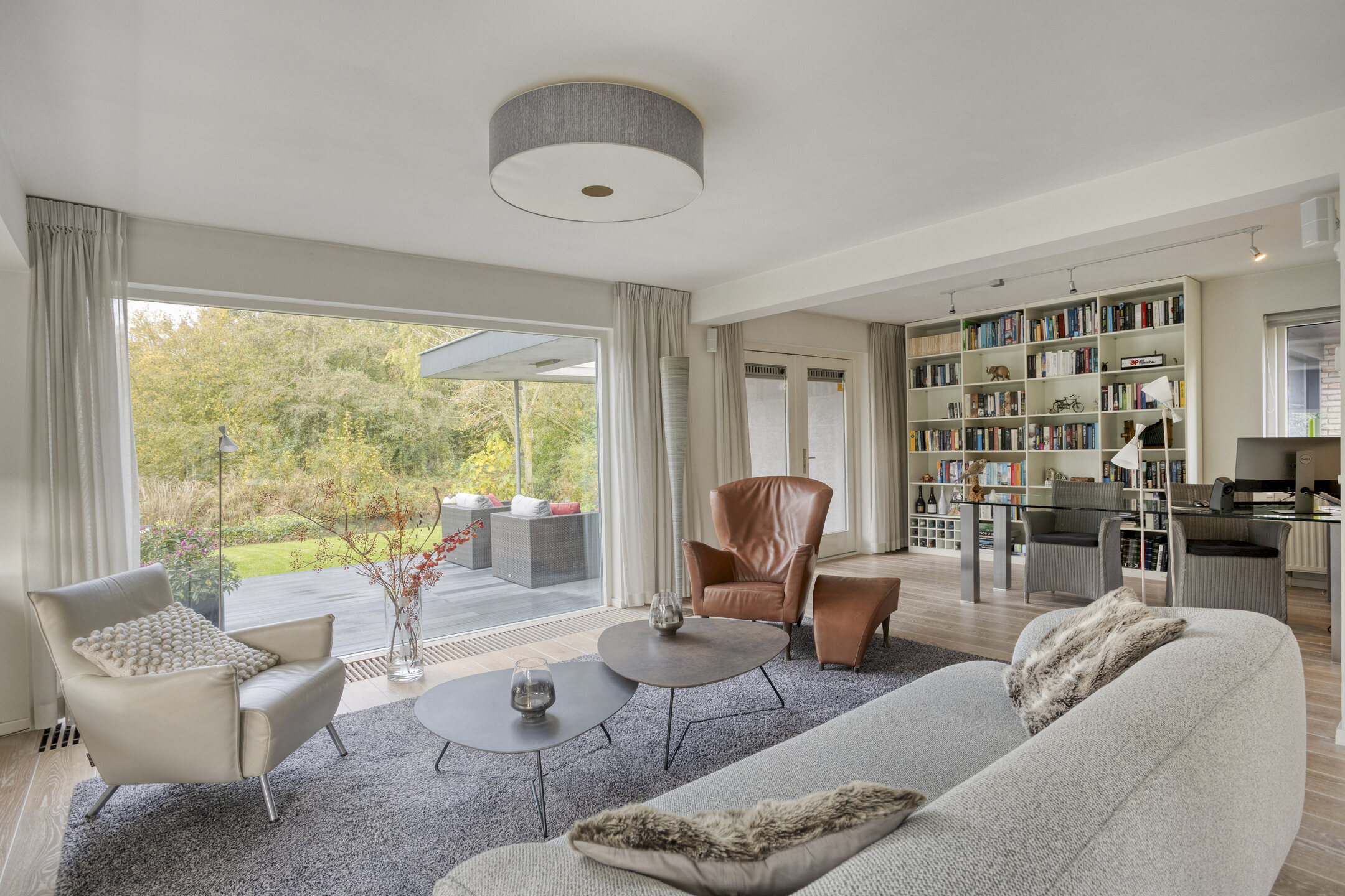 À chegada, um hall espaçoso abre-se para pisos de carvalho e portas de vidro de linhas puras. A sala de estar e a cozinha em open space são divididas por uma lareira Bellfire de dupla face, conferindo ao espaço um calor silencioso. A cozinha de luxo, equipada com eletrodomésticos topo de gama e bancada em pedra azul belga, proporciona funcionalidade e distinção na vivência diária. A fachada posterior, marcada por envidraçados generosos, enquadra o jardim e a paisagem protegida de Egmonderhout ao fundo.