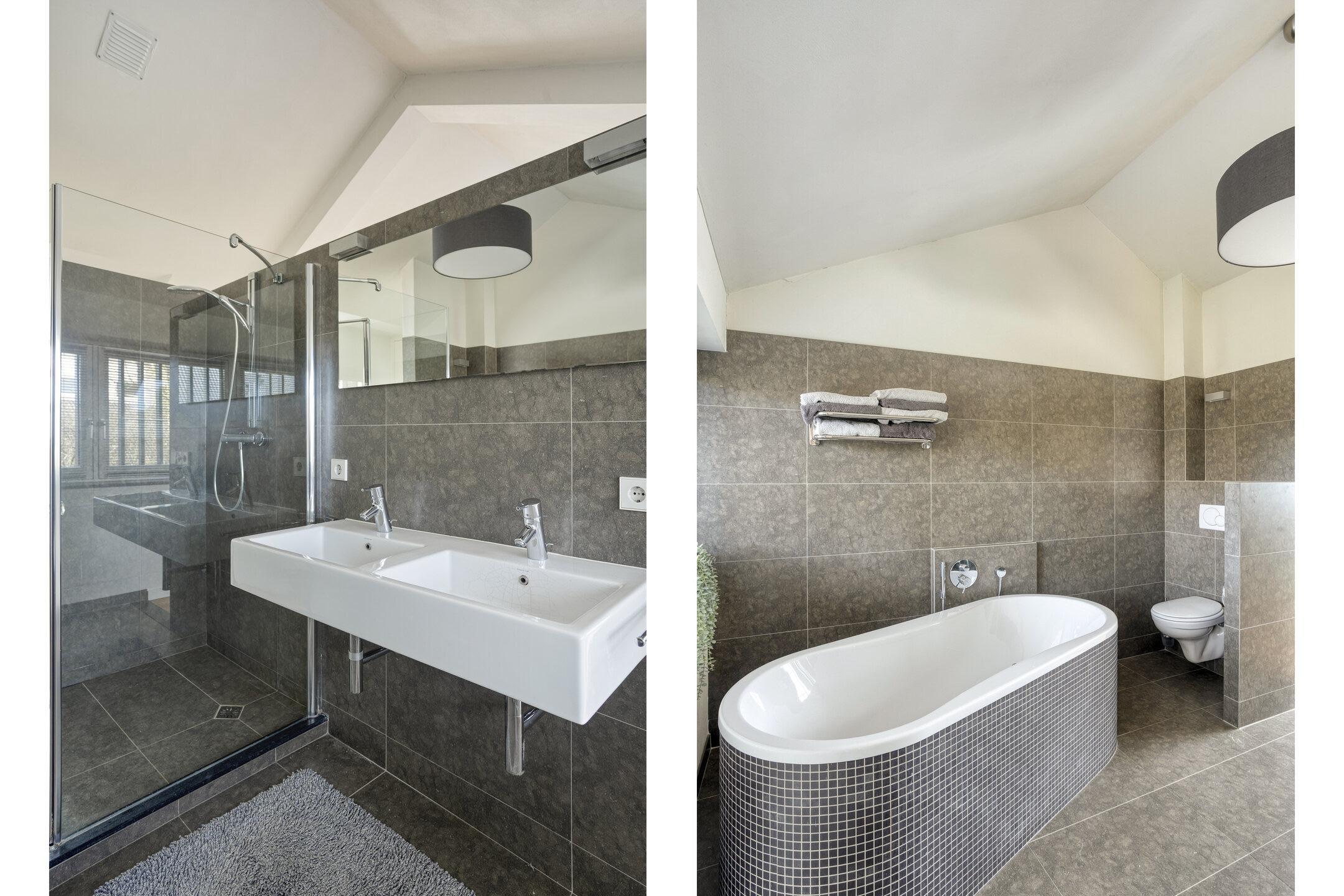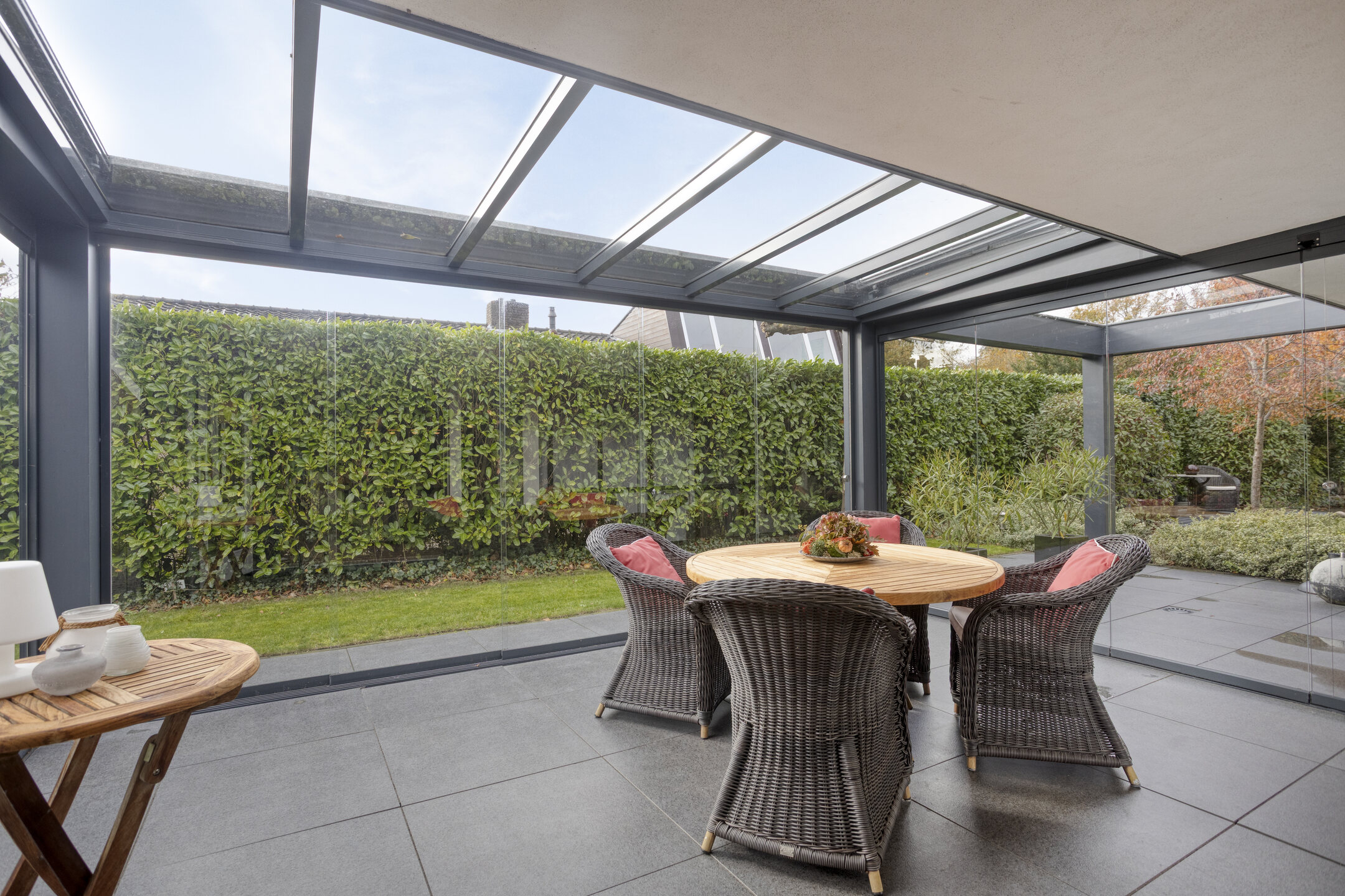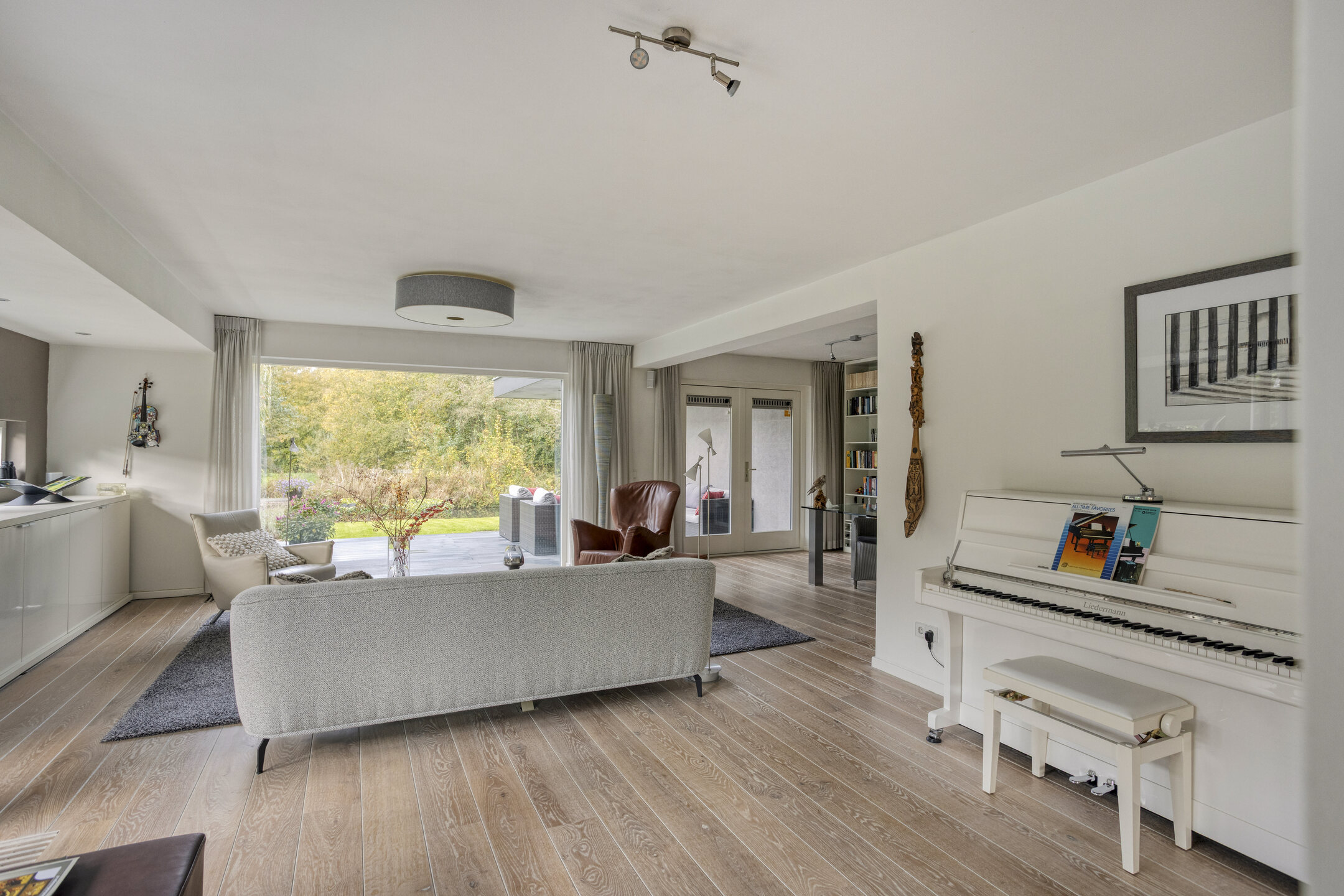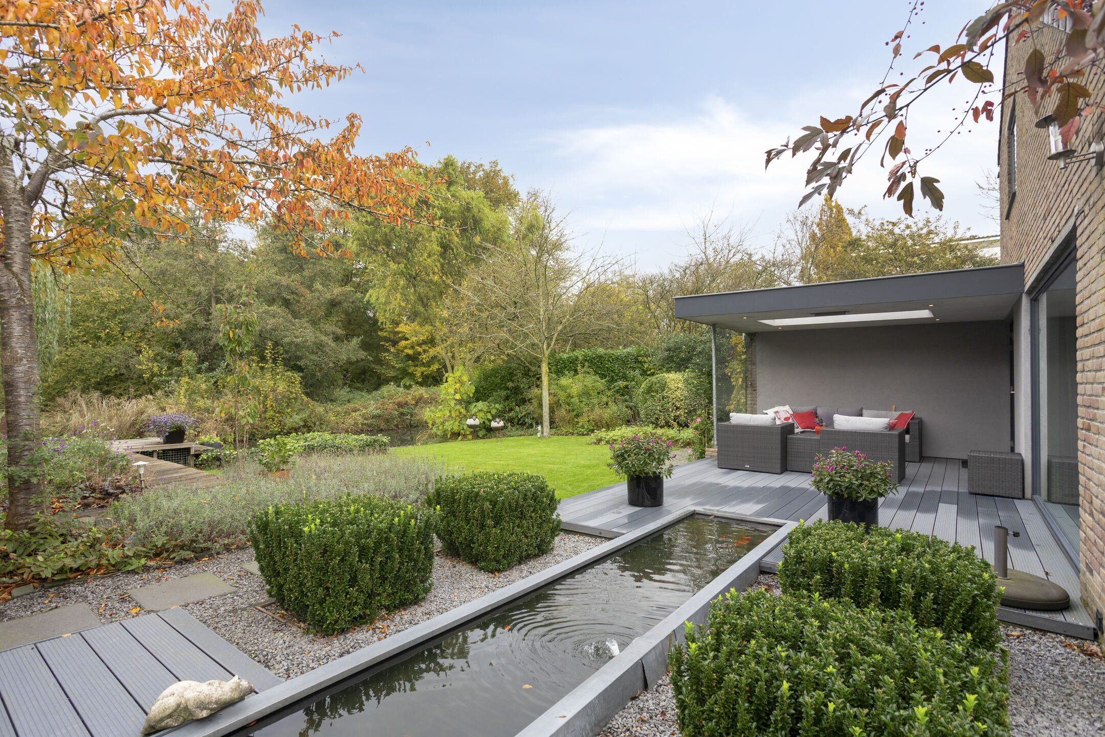 À chegada, um hall espaçoso abre-se para pisos de carvalho e portas de vidro de linhas puras. A sala de estar e a cozinha em open space são divididas por uma lareira Bellfire de dupla face, conferindo ao espaço um calor silencioso. A cozinha de luxo, equipada com eletrodomésticos topo de gama e bancada em pedra azul belga, proporciona funcionalidade e distinção na vivência diária. A fachada posterior, marcada por envidraçados generosos, enquadra o jardim e a paisagem protegida de Egmonderhout ao fundo.
