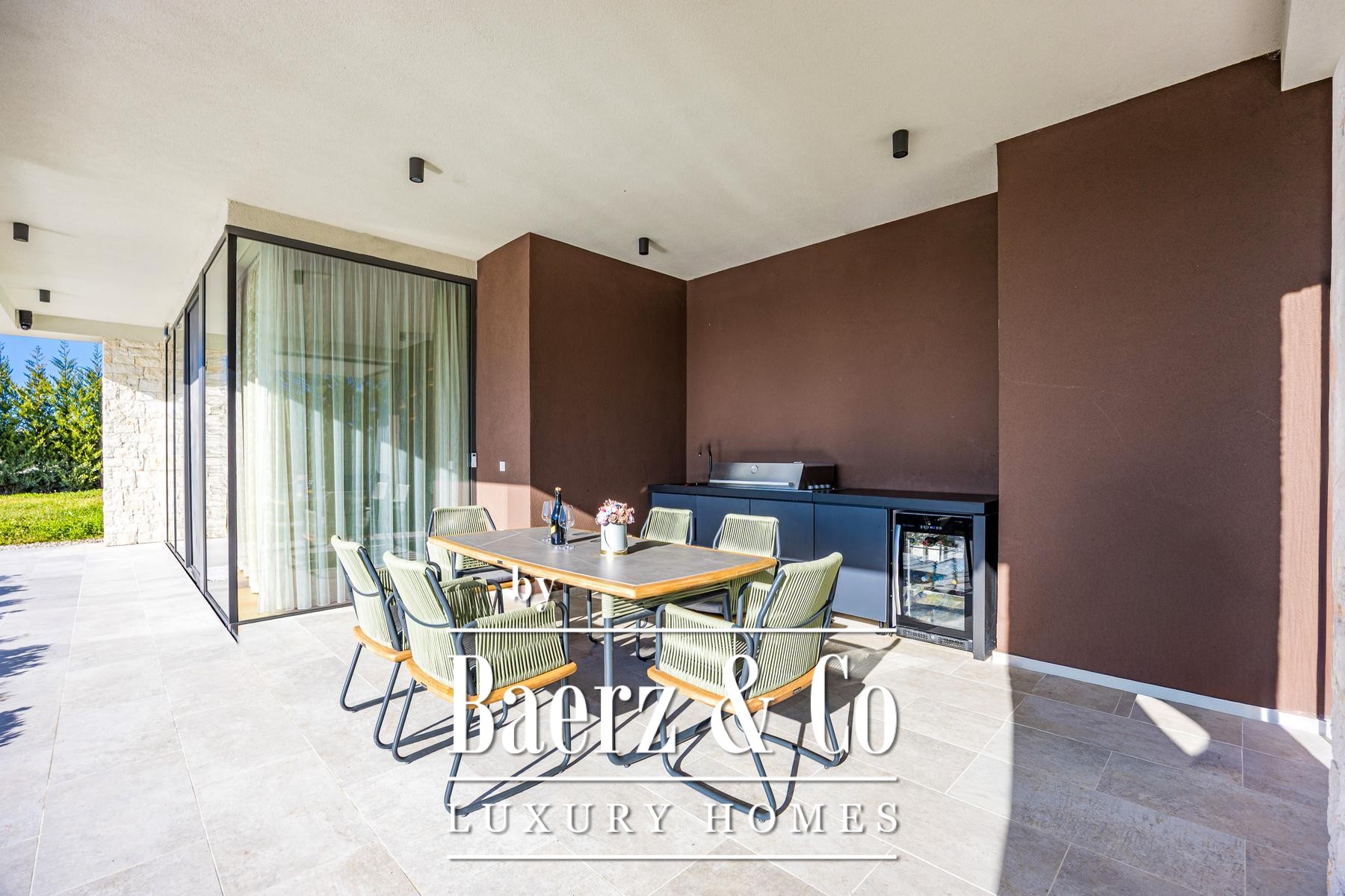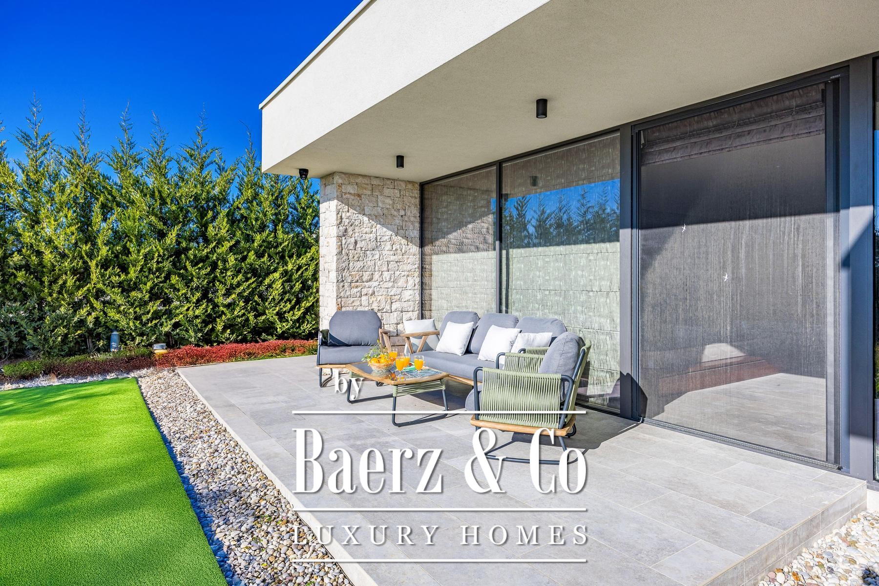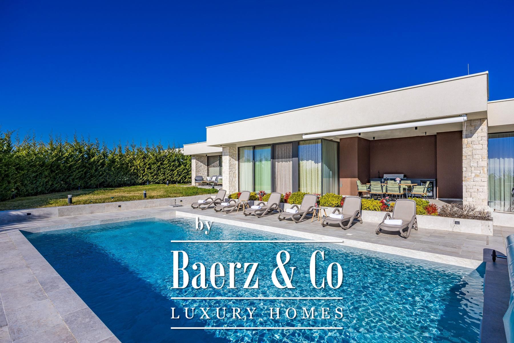 A Villa Brtonigla recebe-o no coração da Ístria, onde o design contemporâneo se encontra com o luxo discreto. Esta moradia em Brtonigla, distribuída por 341 m² de espaço habitacional refinado, foi criada para quem procura elegância e serenidade. Os terraços da propriedade oferecem vistas panorâmicas para o mar, enquanto grandes paredes de vidro conectam interiores luminosos a um jardim meticulosamente ajardinado de 760 m².
