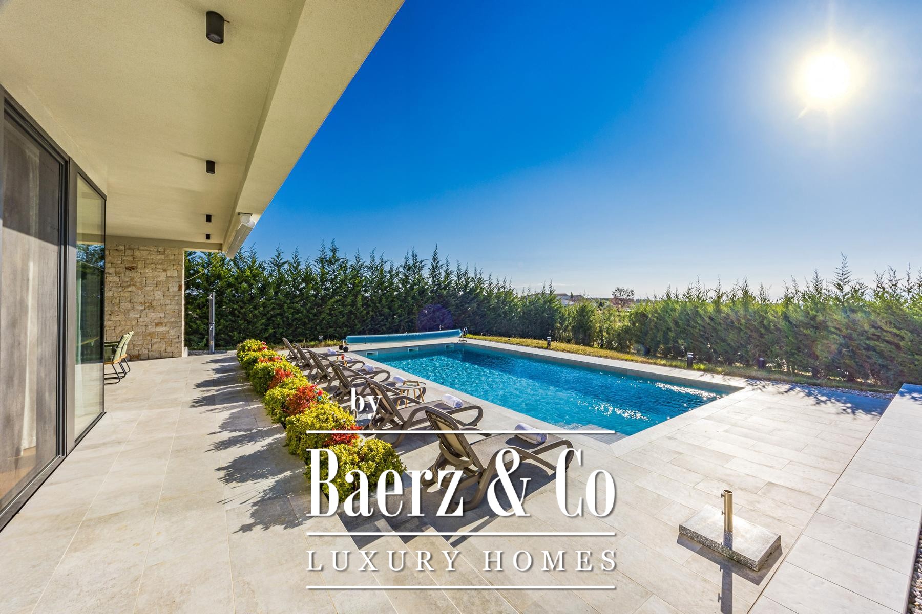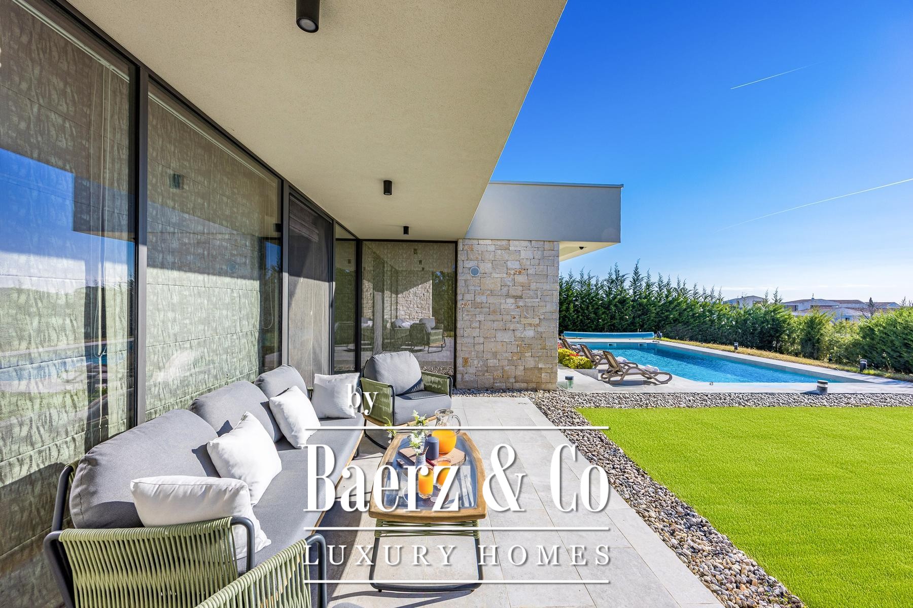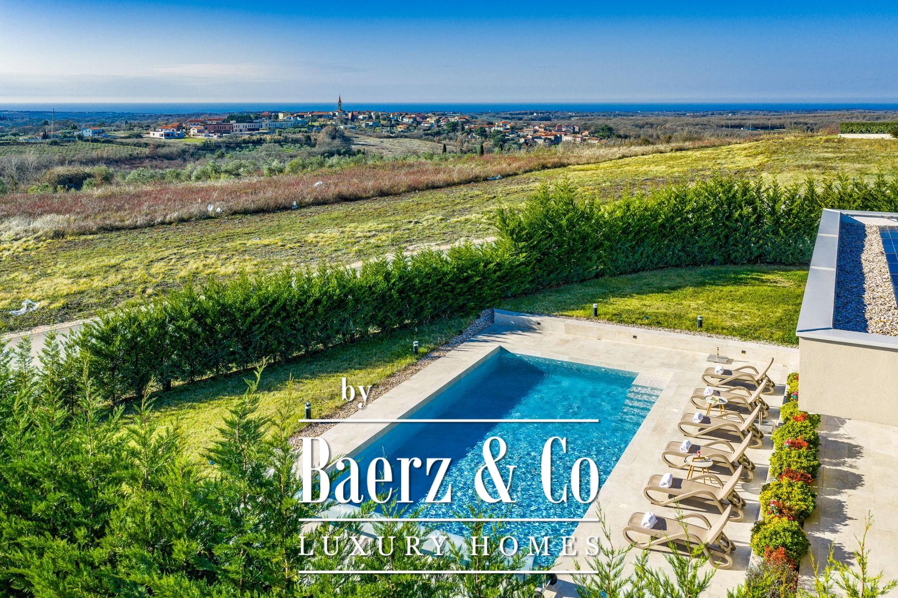 A Villa Brtonigla recebe-o no coração da Ístria, onde o design contemporâneo se encontra com o luxo discreto. Esta moradia em Brtonigla, distribuída por 341 m² de espaço habitacional refinado, foi criada para quem procura elegância e serenidade. Os terraços da propriedade oferecem vistas panorâmicas para o mar, enquanto grandes paredes de vidro conectam interiores luminosos a um jardim meticulosamente ajardinado de 760 m².