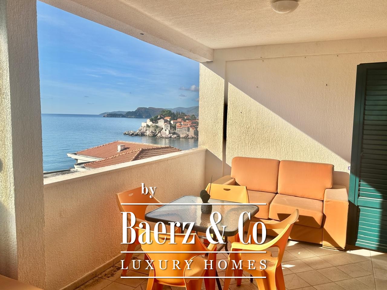 O apartamento duplex Sveti Stefan recebe-o com uma rara combinação de vistas panorâmicas para o mar e para a serra, numa localização invejável junto ao Adriático. Esta residência de 142 m² ocupa o terceiro andar de um edifício de três pisos, a apenas 50 metros da praia e a uma curta caminhada do famoso parque Milocer e da praia da Rainha. Com acesso direto à estrada principal, o local oferece um ritmo harmonioso entre natureza e facilidade de acesso.