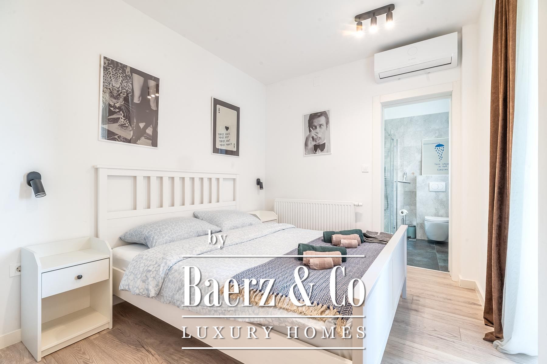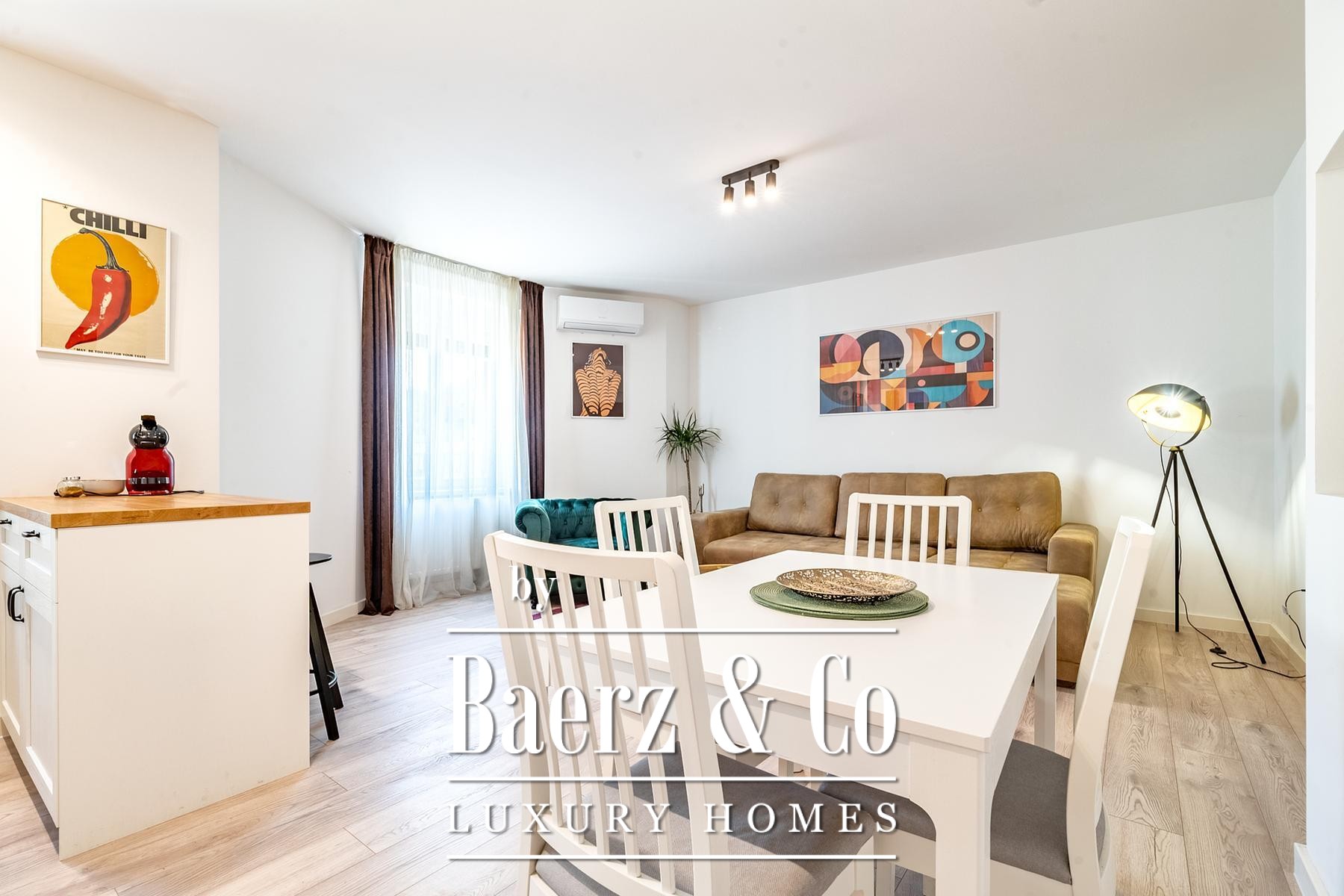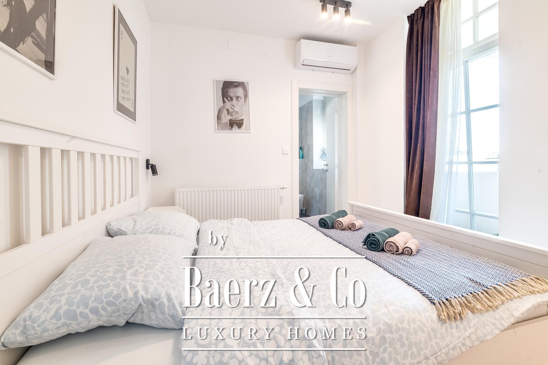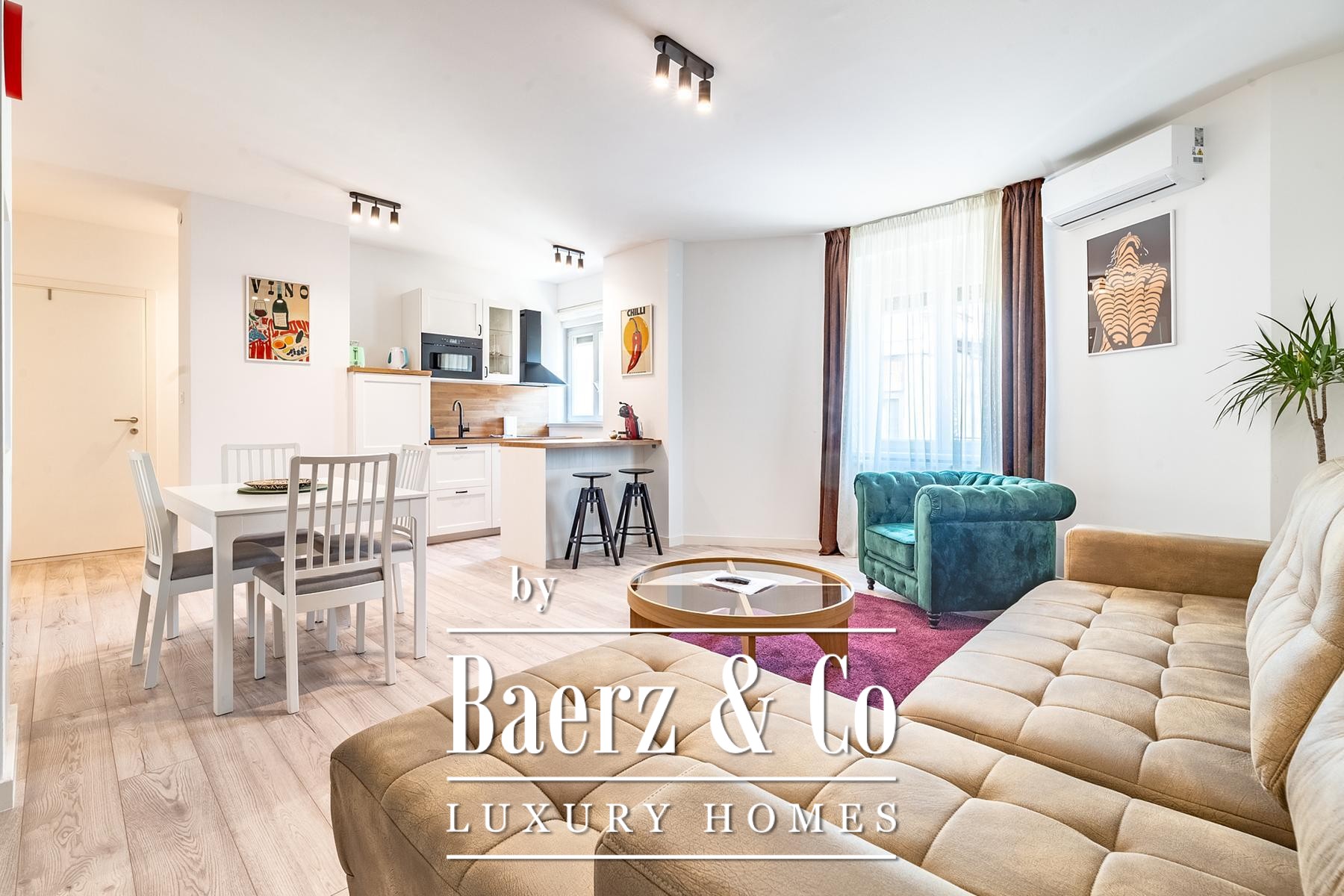 O apartamento principal possui uma área de 55 m² com sala de estar em conceito aberto, cozinha, área de jantar, quarto, pequena varanda coberta e duas casas de banho. Ao lado, um apartamento de 45 m² e outro de 40 m² contam cada um com sala de estar aberta, cozinha, quartos separados e casas de banho. Todos os interiores são totalmente climatizados, equipados para estadias de curta e longa duração, acabados com novos pisos laminados e de cerâmica.