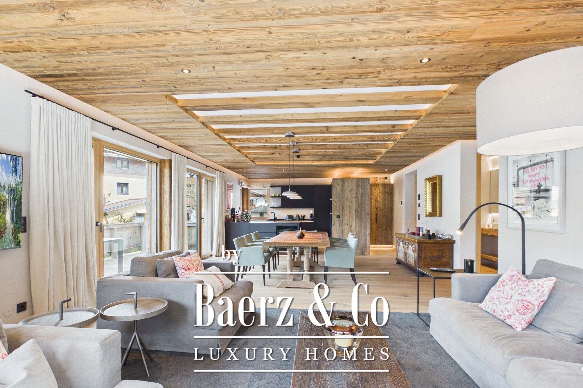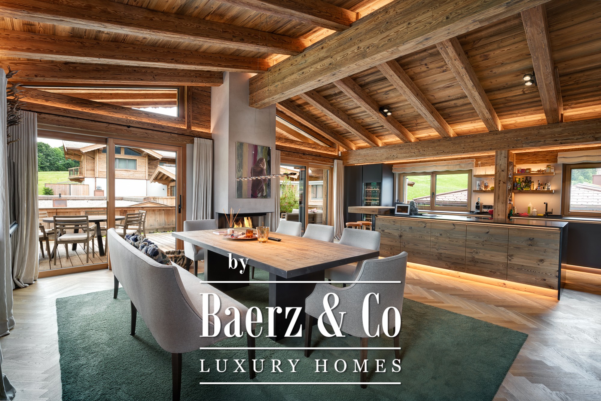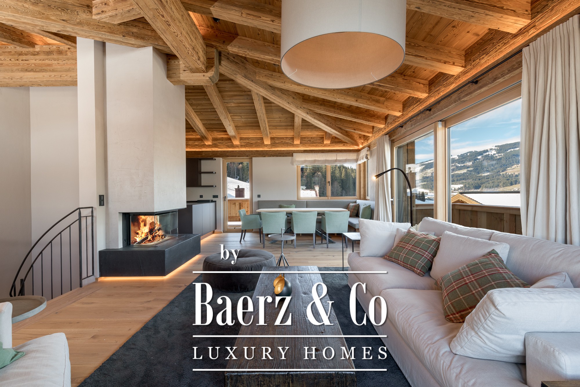 O piso superior revela uma área de estar, refeições e cozinha de conceito aberto, destacada por uma lareira, cozinha planeada, soalho em carvalho em espinha e vigas expostas de madeira recuperada. O terraço-varanda de 45 m² banha os interiores em luz natural, emoldurando o panorama alpino.