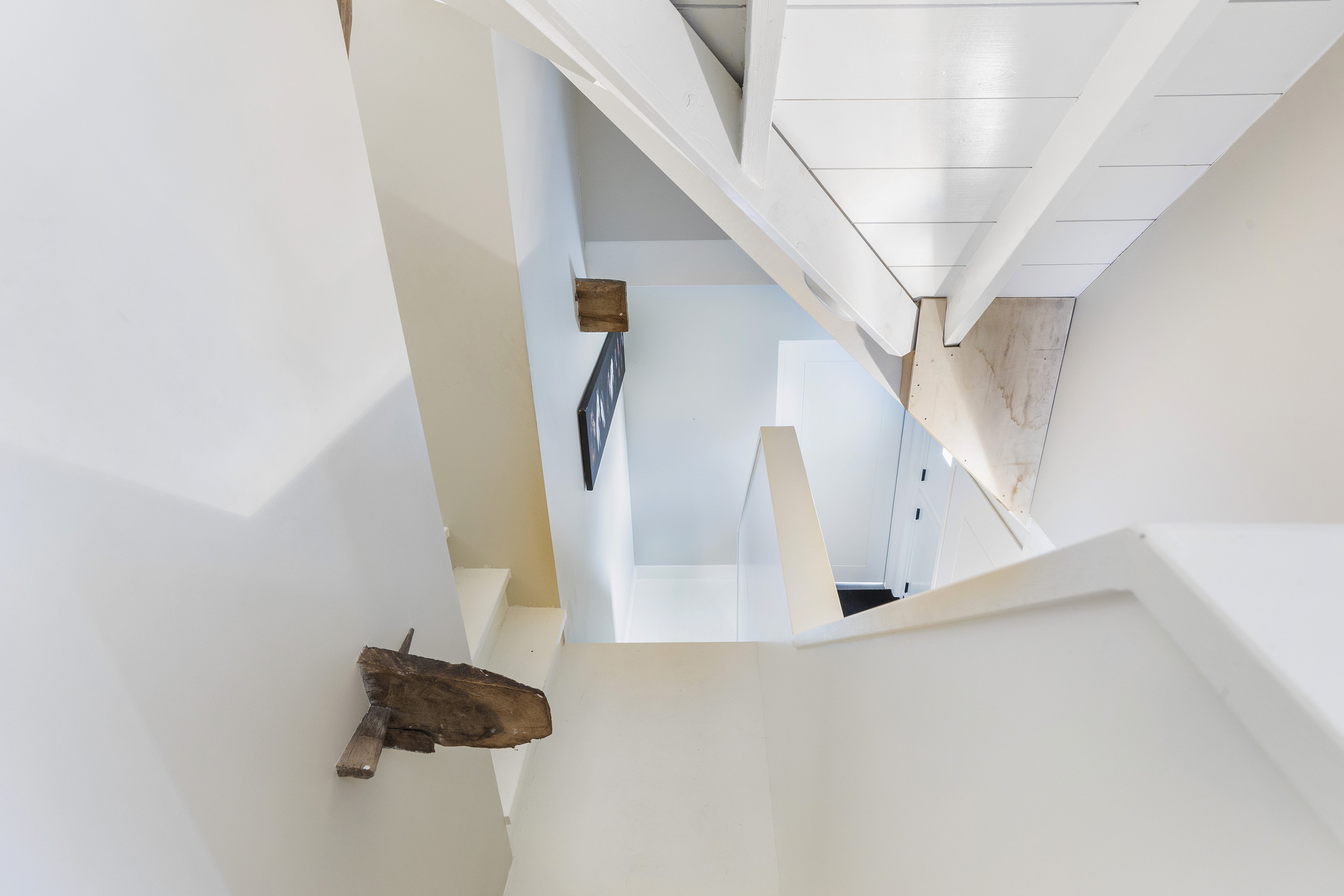 No interior, o hall de entrada generoso define um tom de simplicidade sofisticada. A cozinha com zona de refeições, envidraçada em três frentes, com teto abobadado e vigas expostas, é o centro da casa. Portas duplas abrem-se para a varanda e jardim, onde a paisagem rural se revela. A sala de estar prolonga esta ligação luminosa e contínua ao exterior, complementada por vigas de teto pintadas de branco, elementos construtivos robustos e piso em betão polido. Diferentes zonas de estar compõem um espaço versátil, ancorado por um fogão a lenha.