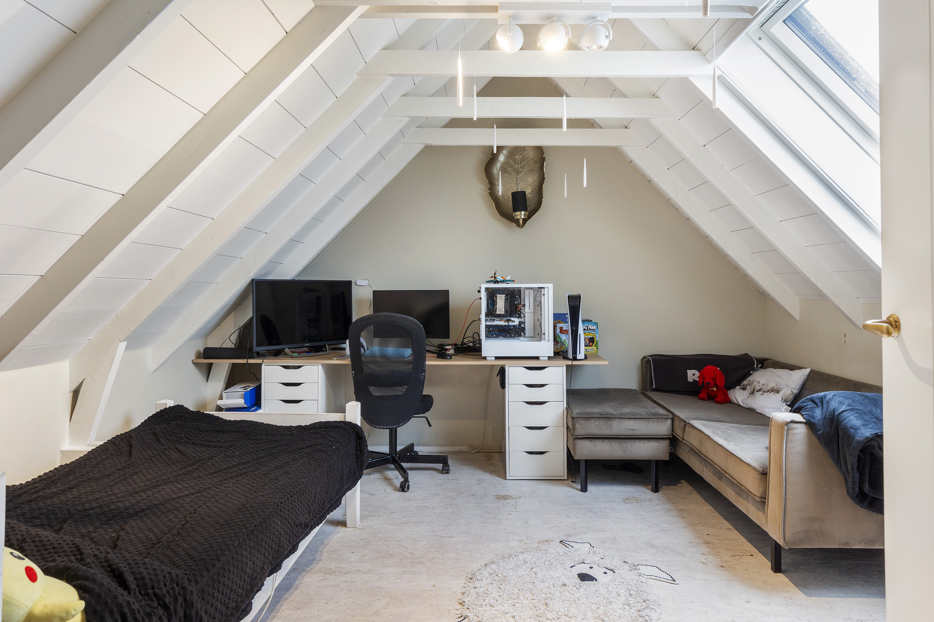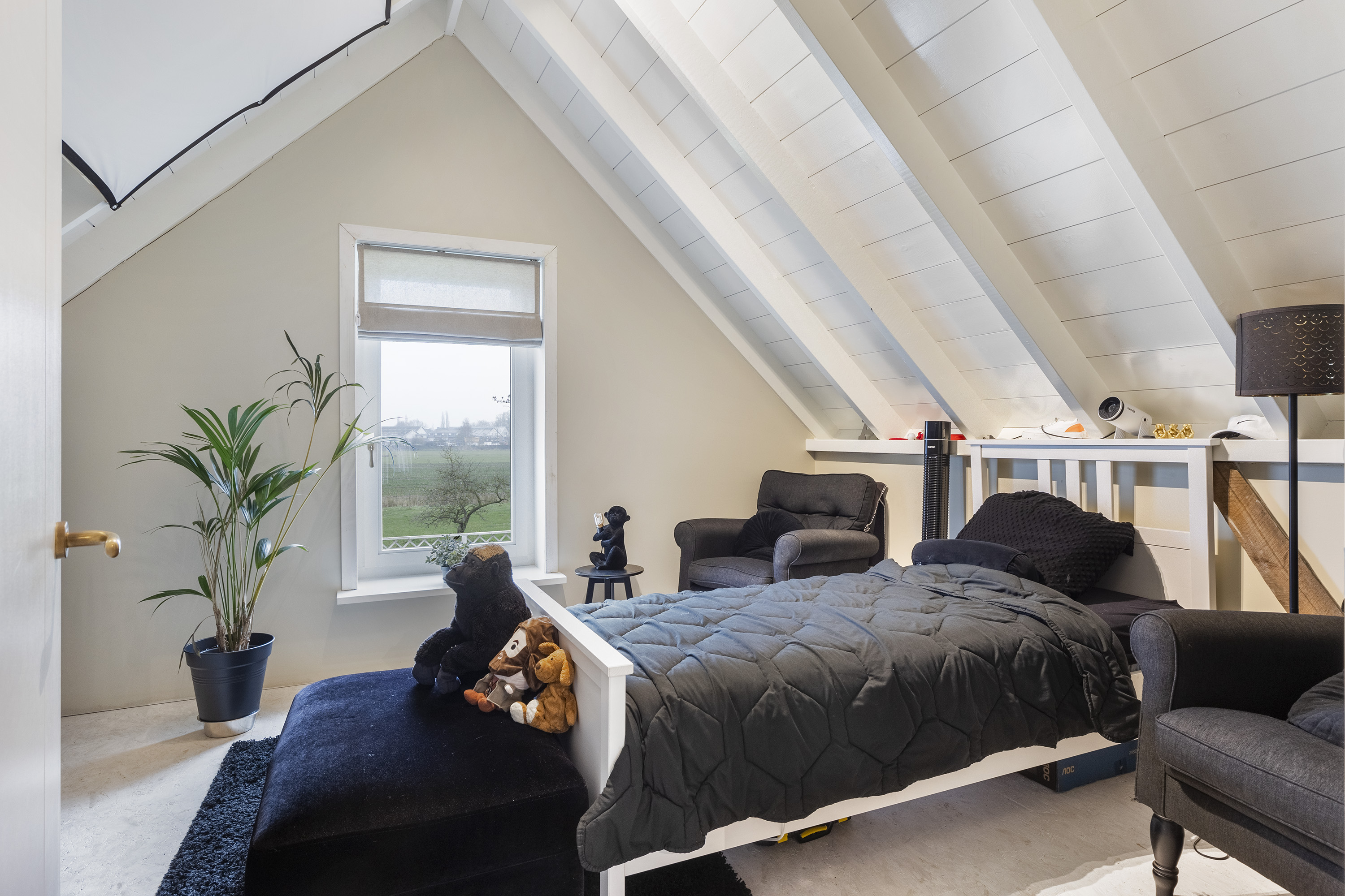O quarto principal no rés do chão dispõe de área de vestir aberta e casa de banho moderna, com duche walk-in e acabamentos contemporâneos. No piso superior, três quartos adicionais oferecem opções habitacionais flexíveis, com tetos abobadados e vistas para o campo. Características práticas incluem aquecimento parcial por piso radiante, aquecimento elétrico, isolamento avançado e ventilação natural.