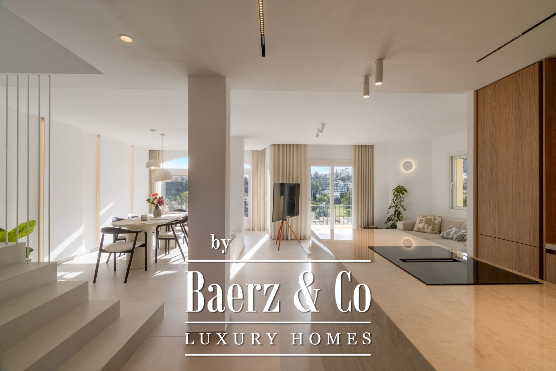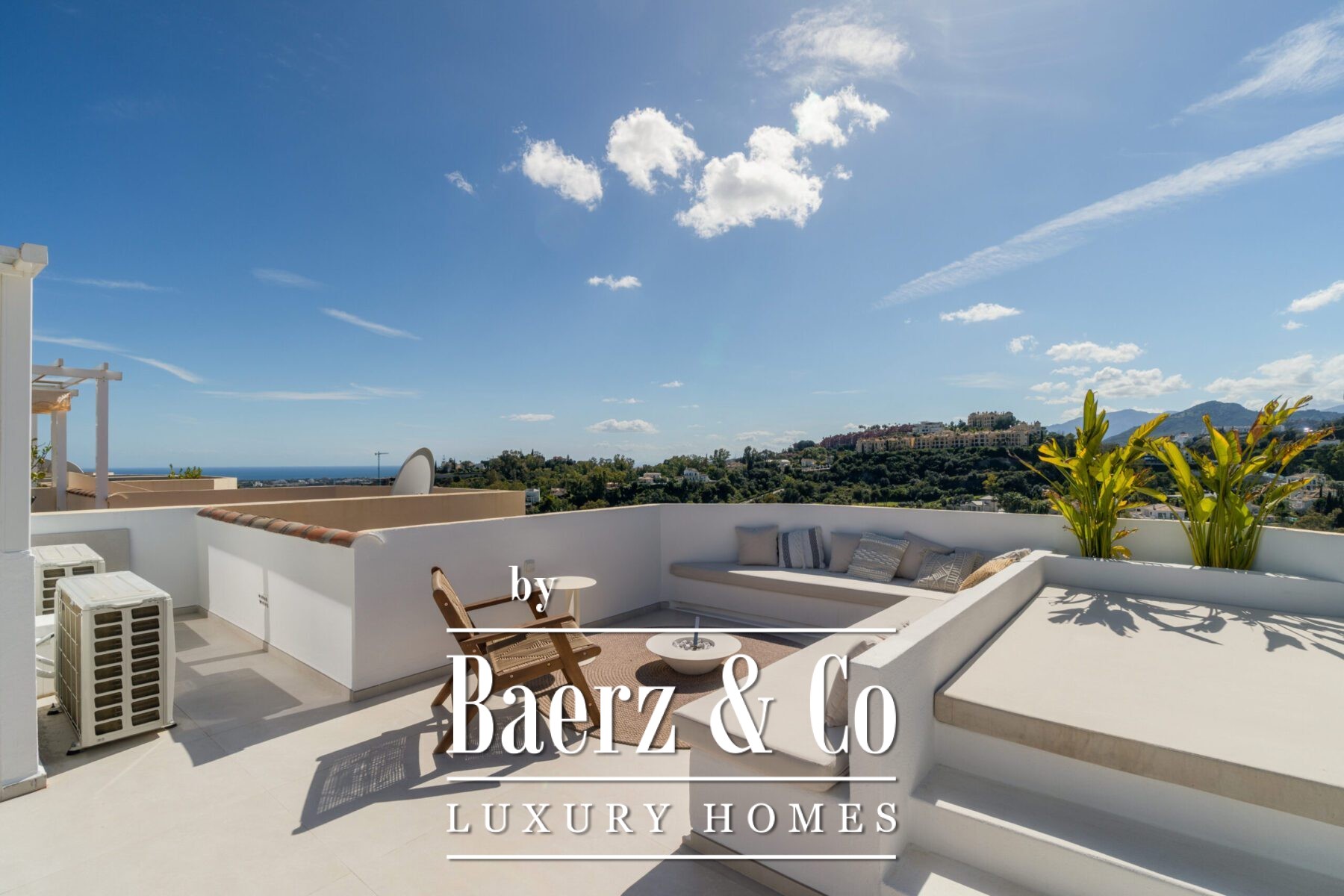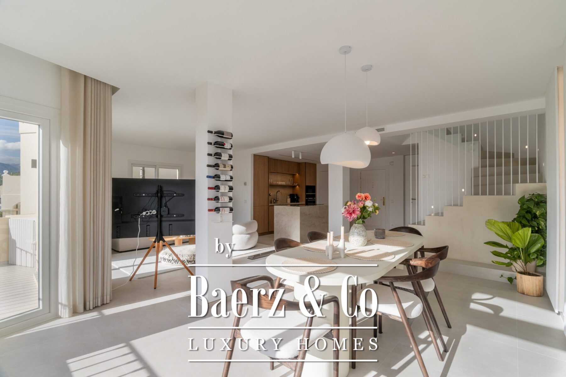 Esta penthouse duplex em Benahavís é um exemplo de vida elevada, com 200 m² de espaço cuidadosamente distribuído e uma posição privilegiada dentro de um condomínio fechado e seguro. O piso principal é aberto e fluido, integrando cozinha, sala de jantar e sala de estar, com acesso direto a uma varanda privativa. Janelas de vidro duplo permitem a entrada de luz natural e emolduram vistas sobre o Mar Mediterrâneo e as montanhas circundantes.