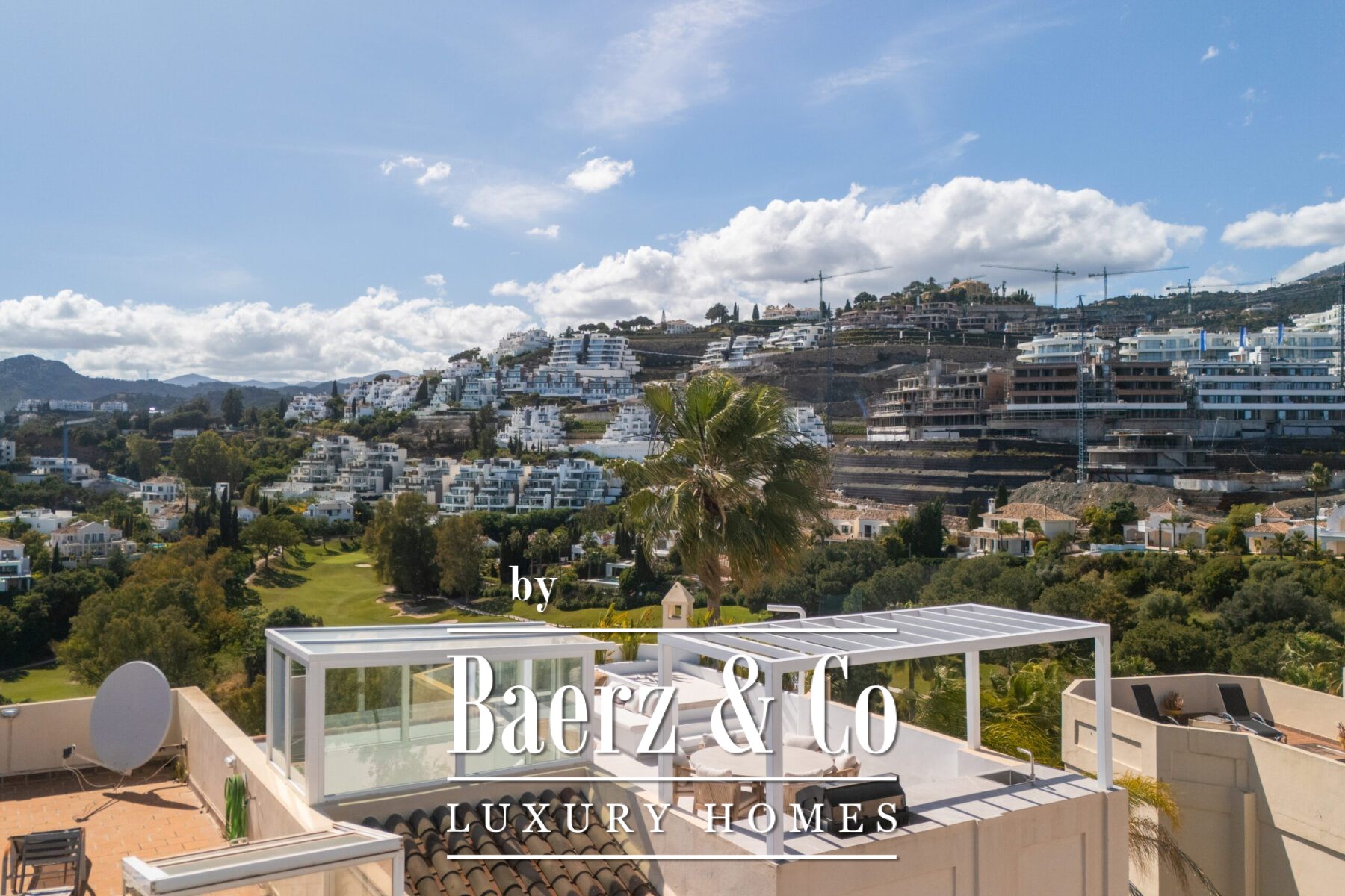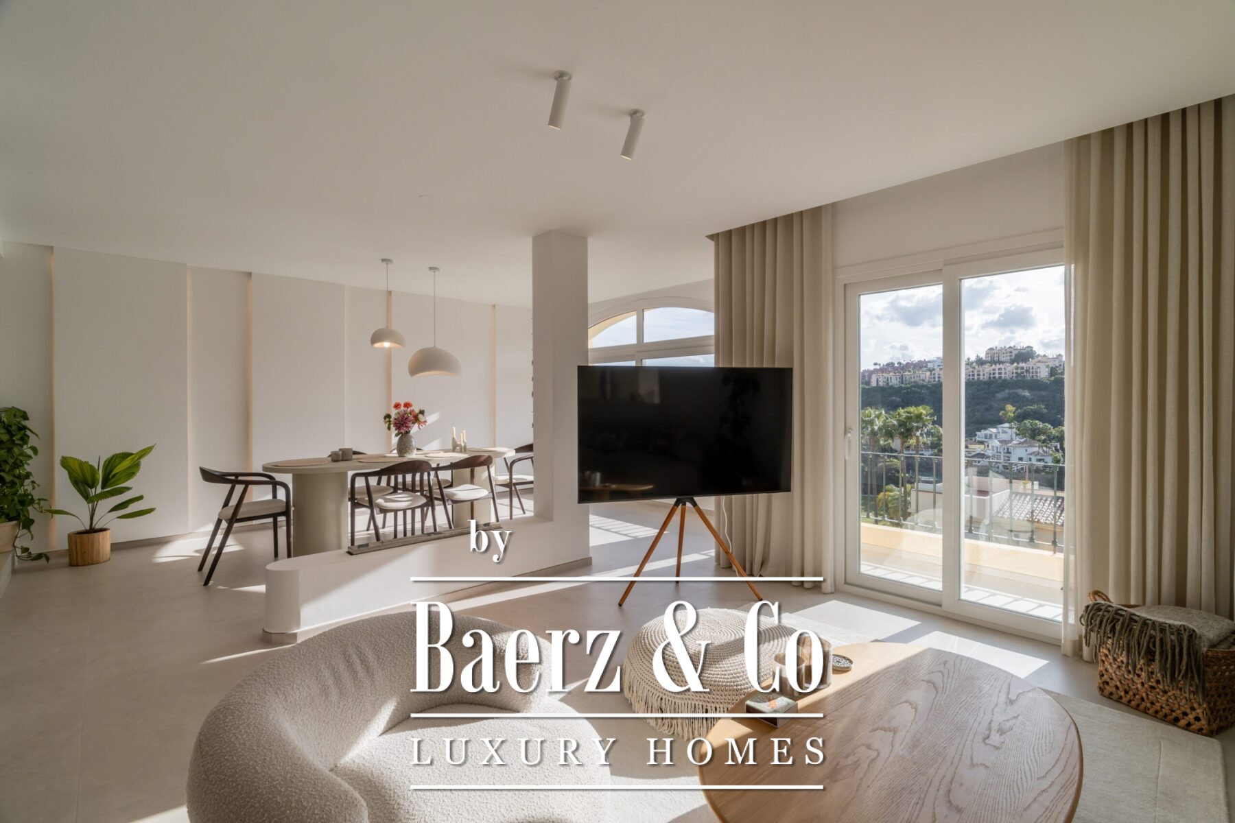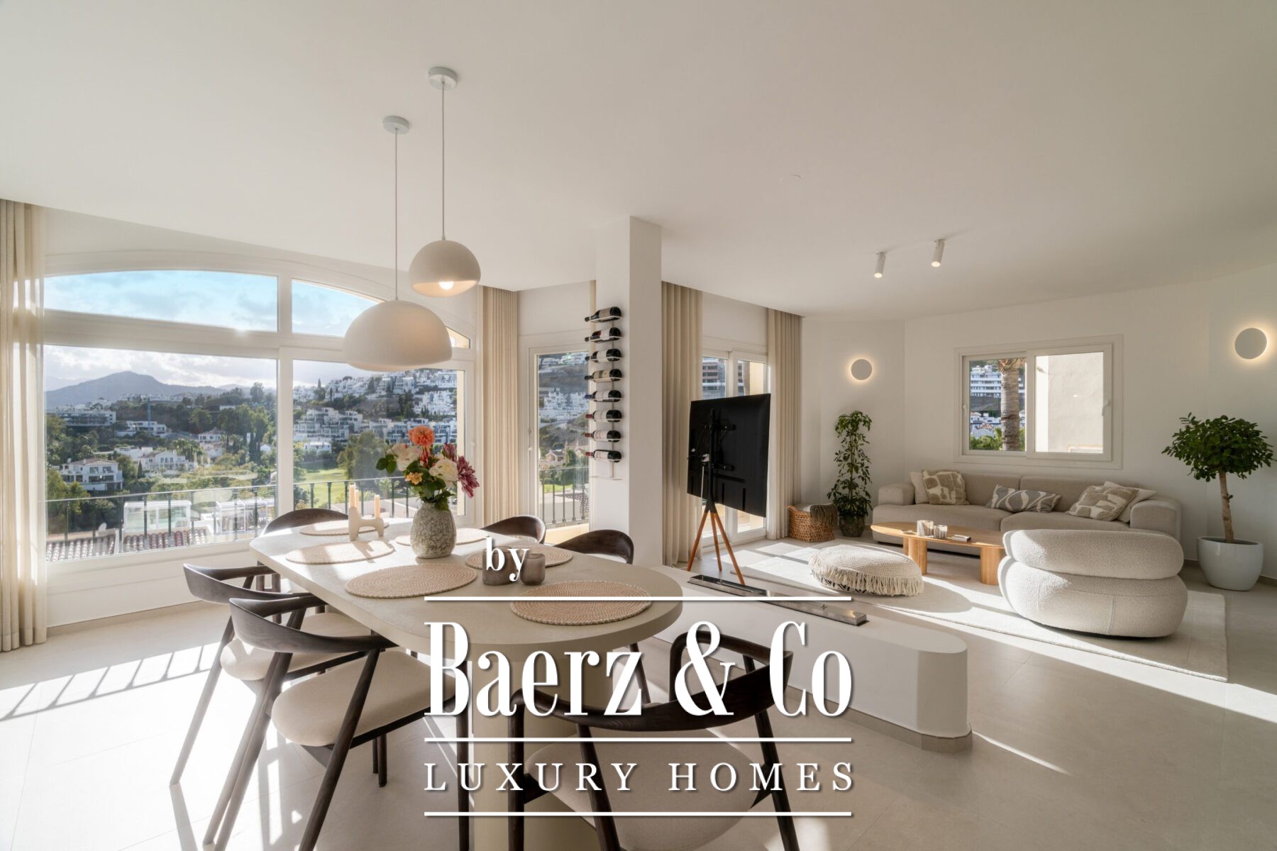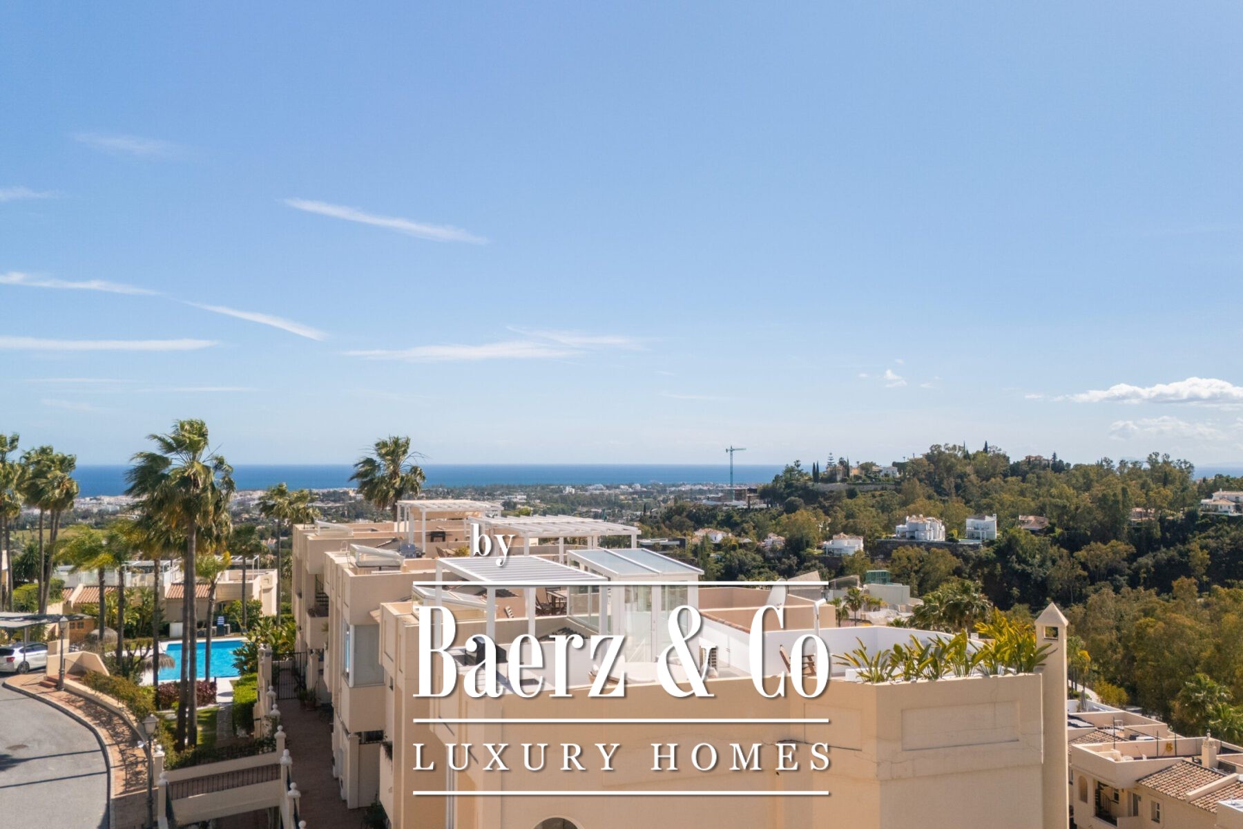 Esta penthouse duplex em Benahavís é um exemplo de vida elevada, com 200 m² de espaço cuidadosamente distribuído e uma posição privilegiada dentro de um condomínio fechado e seguro. O piso principal é aberto e fluido, integrando cozinha, sala de jantar e sala de estar, com acesso direto a uma varanda privativa. Janelas de vidro duplo permitem a entrada de luz natural e emolduram vistas sobre o Mar Mediterrâneo e as montanhas circundantes.