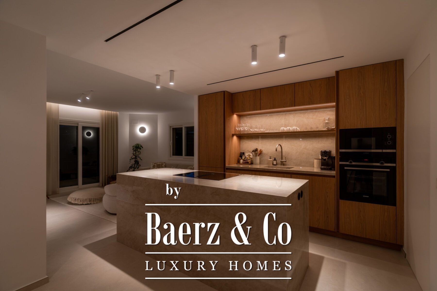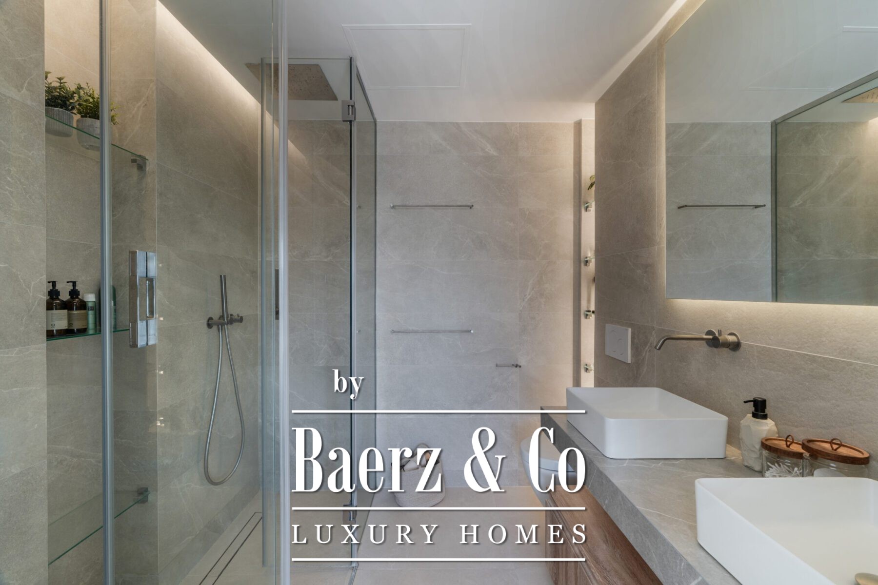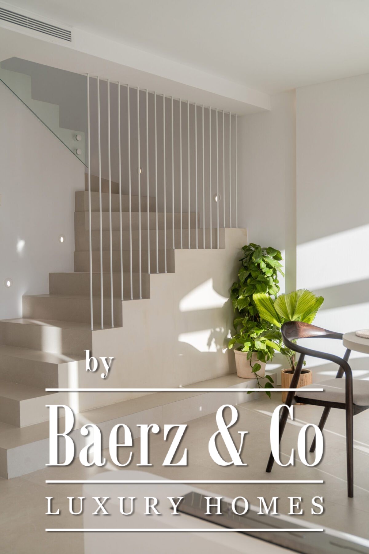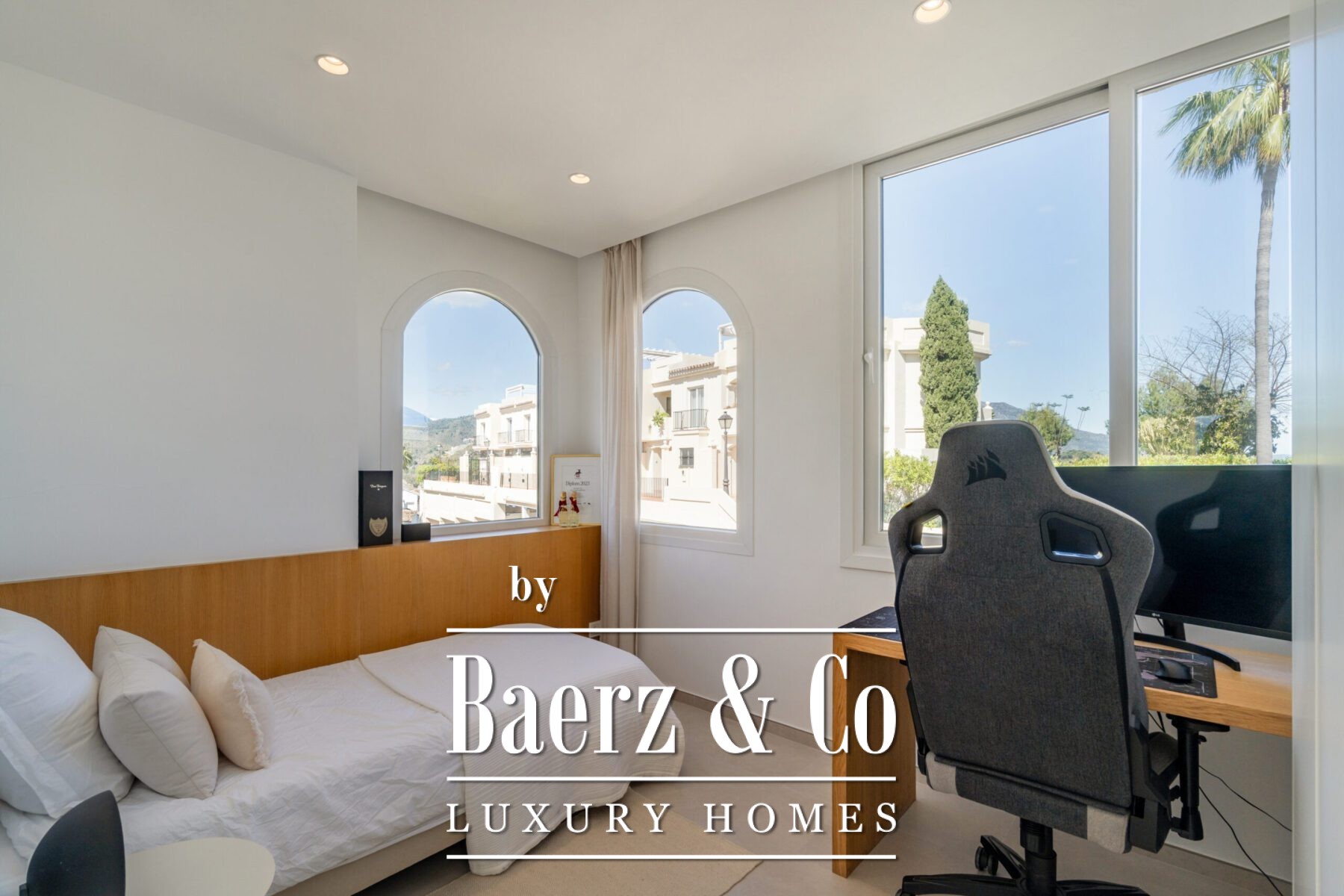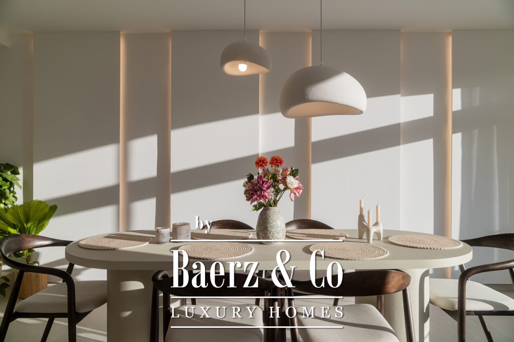 Distribuído por dois pisos amplos e um terraço superior, o apartamento dispõe de três quartos, incluindo uma suíte principal e uma casa de banho de visitas adicional para maior conforto. Um dos espaços foi convertido em escritório, enquanto os quartos do piso superior abrem-se diretamente para o terraço e para a paisagem envolvente. O terraço na cobertura oferece um ambiente íntimo, pensado para manhãs tranquilas ou noites com amigos, com uma área lounge e churrasqueira junto ao horizonte.