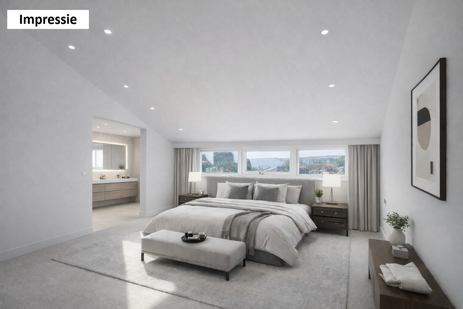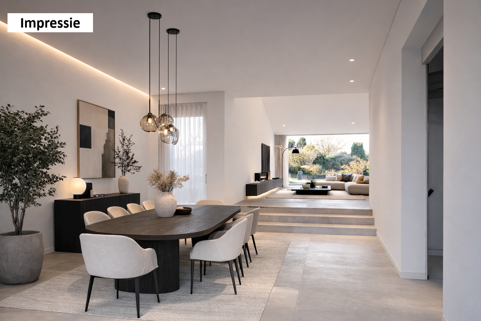 A residência dispõe de 215 m² de área habitacional, quatro quartos e três casas de banho. Uma garagem XL e uma cave multifuncional acrescentam praticidade ao quotidiano. A espaçosa sala de estar, com um singular mezanino e parede de janelas, privilegia a entrada de luz natural e estabelece uma ligação fluida aos jardins paisagísticos. A cozinha, equipada com móveis em U e eletrodomésticos embutidos, encontra-se junto à área de refeições, ambas com vista serenamente voltada para o jardim.