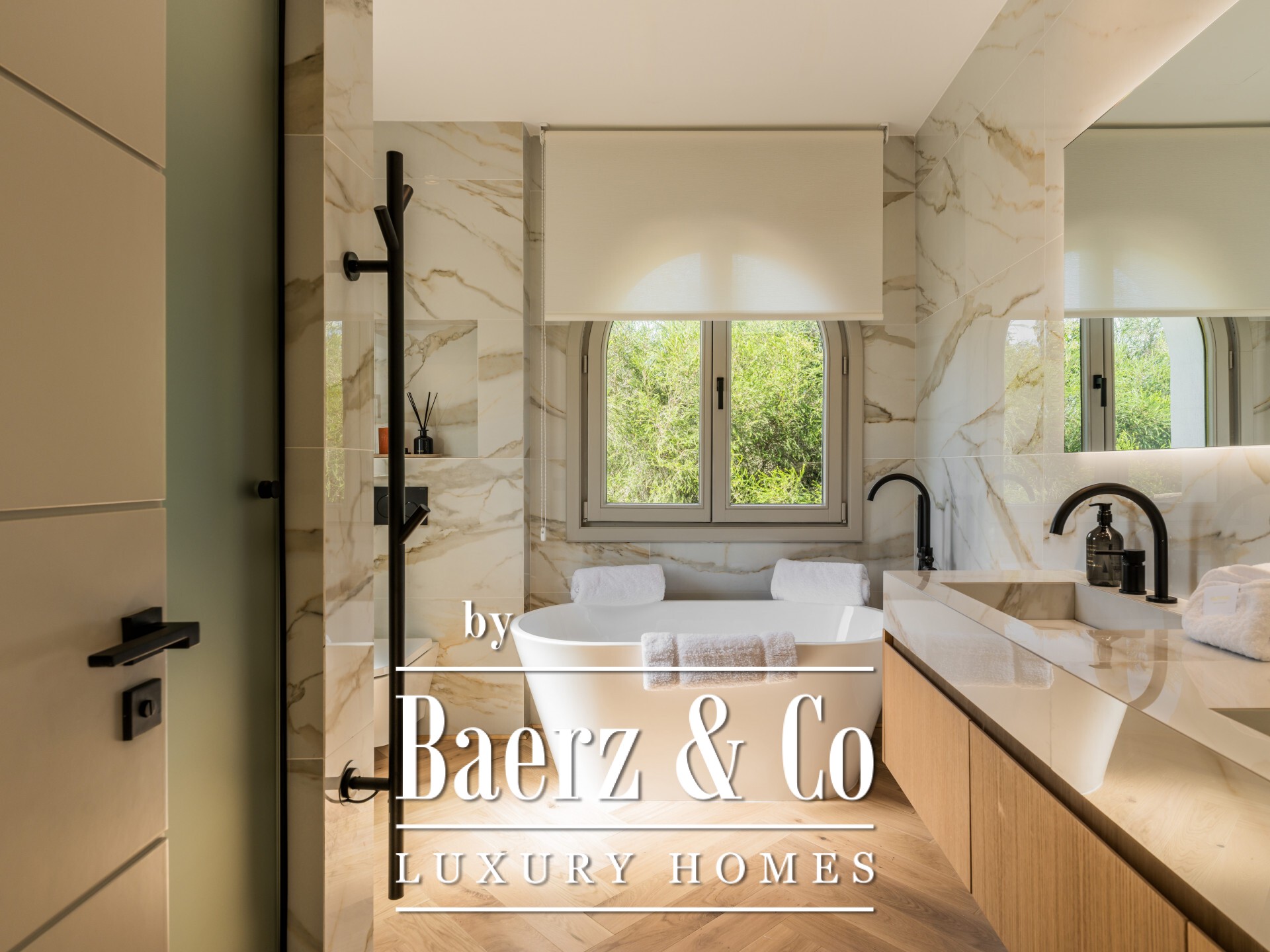 O piso do jardim dispõe de uma área versátil de lazer, incluindo sala de jogos, cinema, bar e mais quatro quartos, três deles com casas de banho privativas. Uma casa de apoio à piscina com dois andares e churrasqueira convida a momentos de lazer entre a sombra da vegetação ou na luz do entardecer. Por toda a villa, o chão radiante e o ar condicionado garantem conforto permanente; entre as comodidades incluem-se sauna, banho turco, piscina de água salgada, adega e segurança numa comunidade fechada.