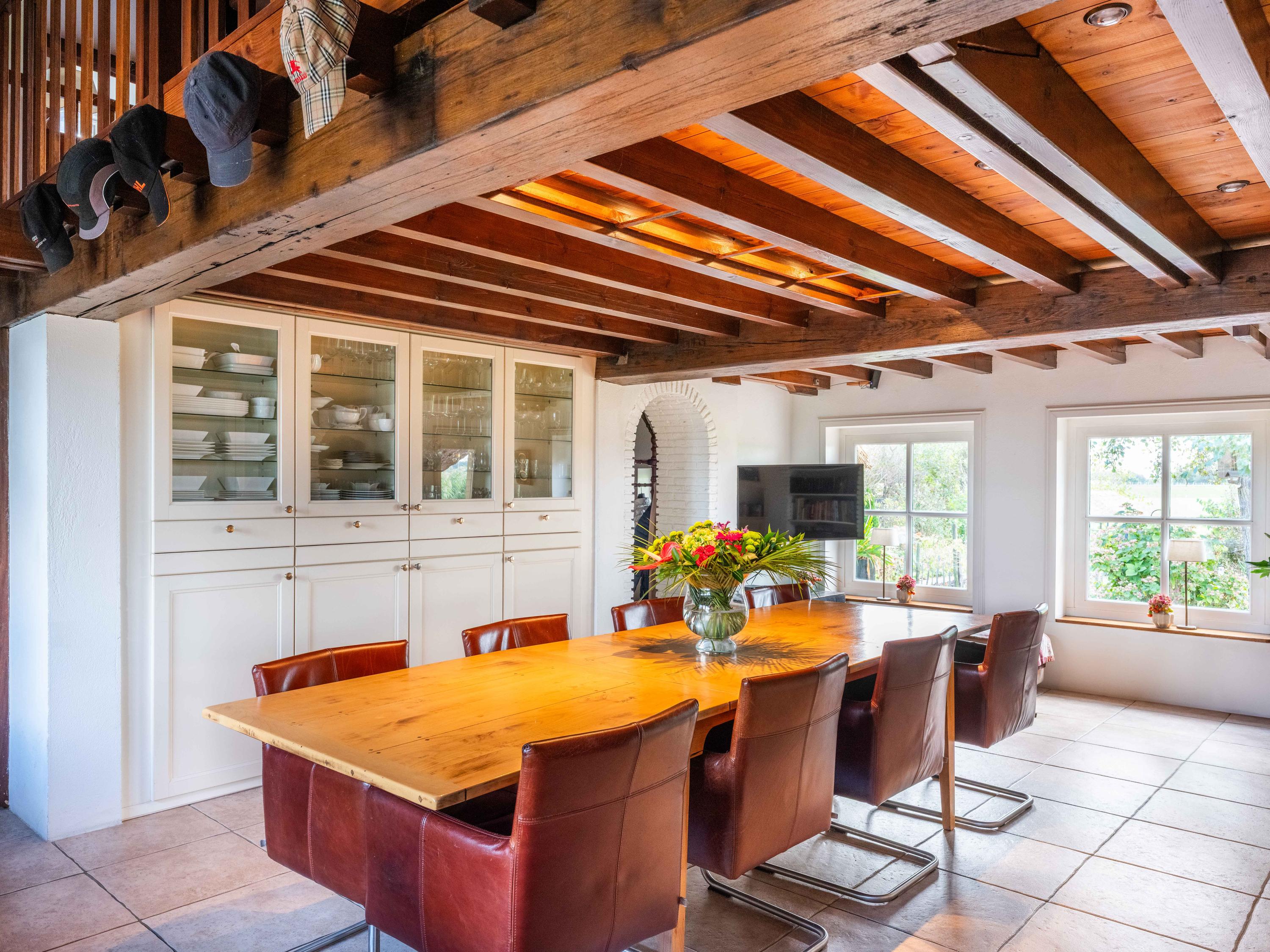 A residência de 224 m² combina o estilo campestre com o conforto contemporâneo. Totalmente isolada, classe energética A, aquecimento por piso radiante e telhado de colmo sintético garantem bem-estar durante todo o ano. A entrada revela um hall com bengaleiro e arrumos, que conduz a uma área de refeições cheia de luz e cozinha em plano aberto. Materiais autênticos—tetos com vigas, armários embutidos e fogão inglês—distinguem a espaçosa cozinha, acolhedora e funcional, que transita para uma ampla sala de estar iluminada, onde a luz natural evidencia a água e o jardim, com uma salamandra a lenha como ponto central.