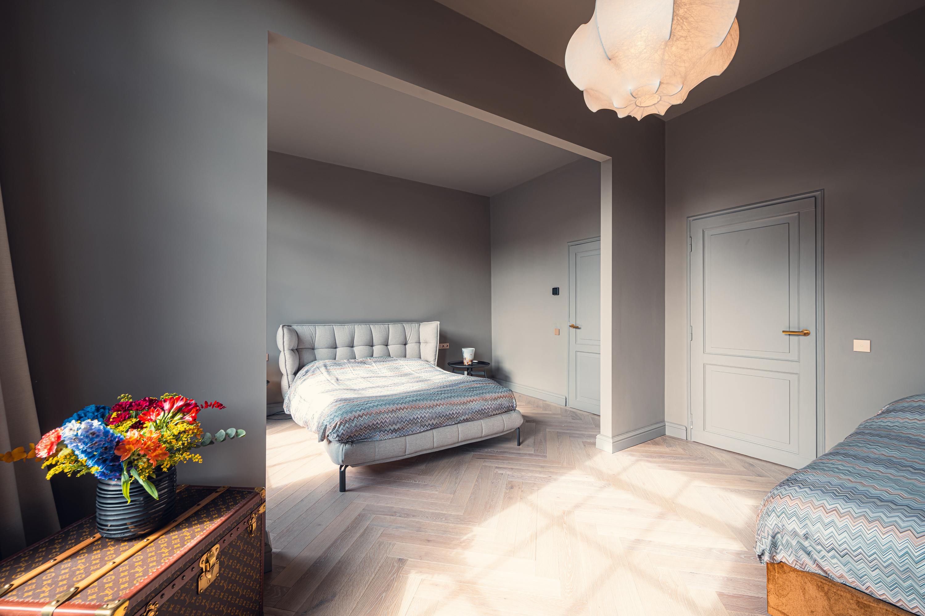 The spacious living room is a true showpiece. The classical stucco, decorative ceiling details, and an elegant ceiling rose give the room extra allure and warmth. At the center stands the (monumental) marble fireplace with open hearth, forming a stylish combination with the sleek, contemporary interior. The herringbone wooden floor with dark inlay emphasizes the length of the room and ties in beautifully with the refined wall finishes.