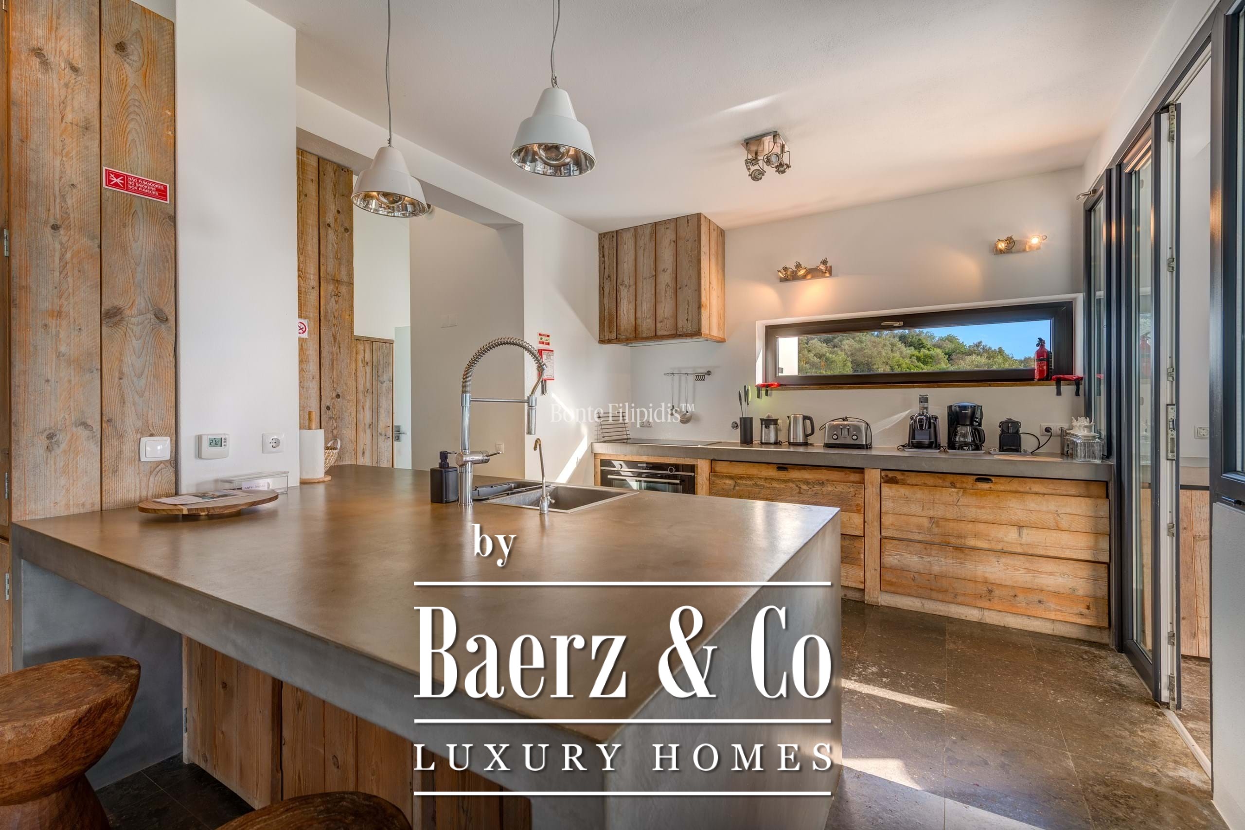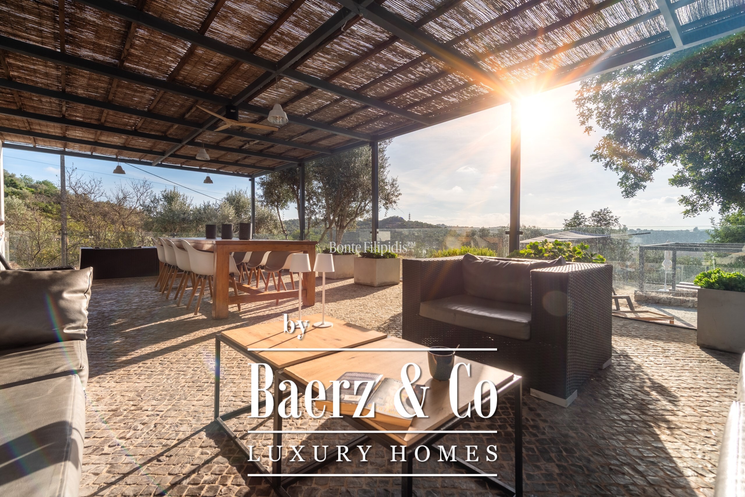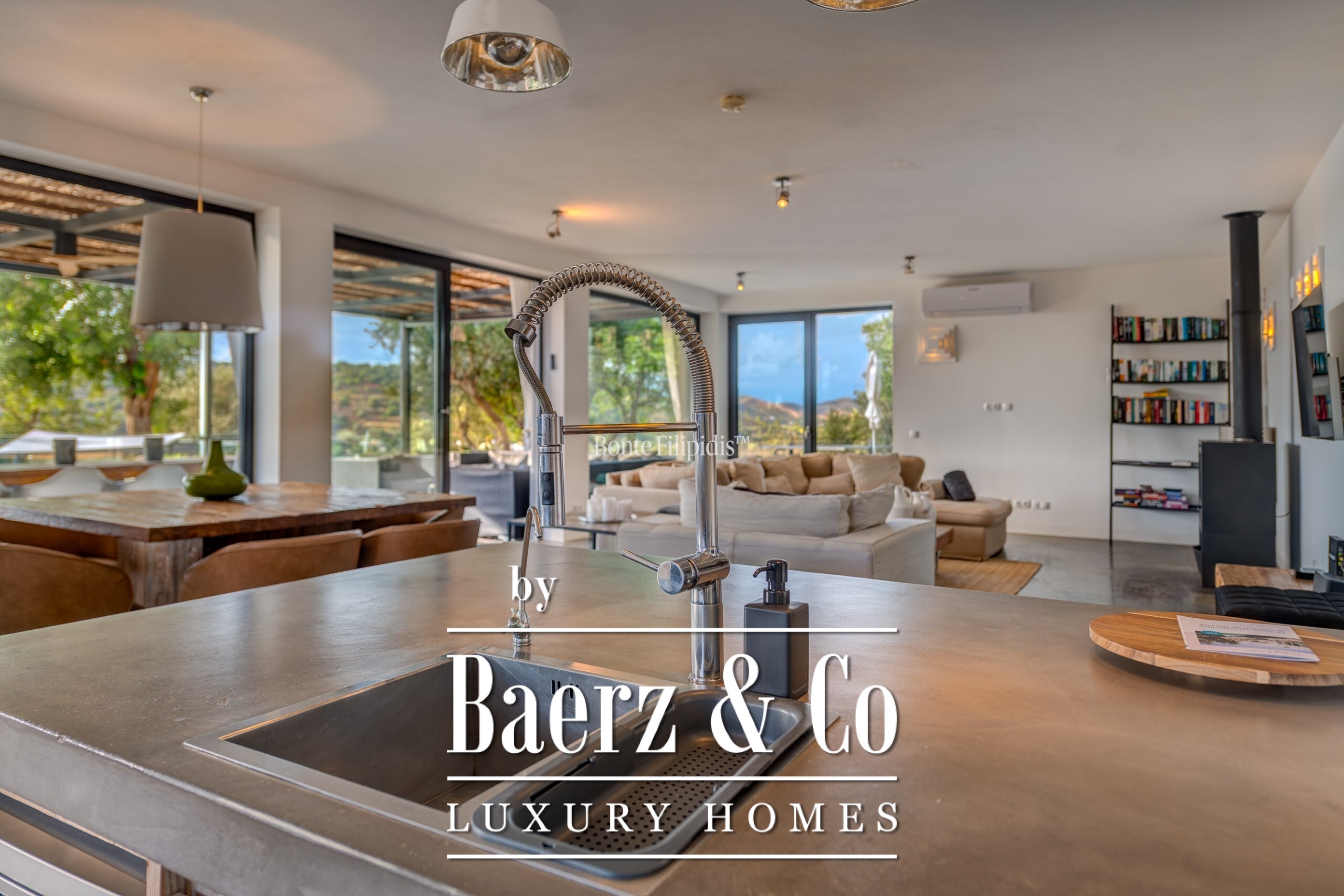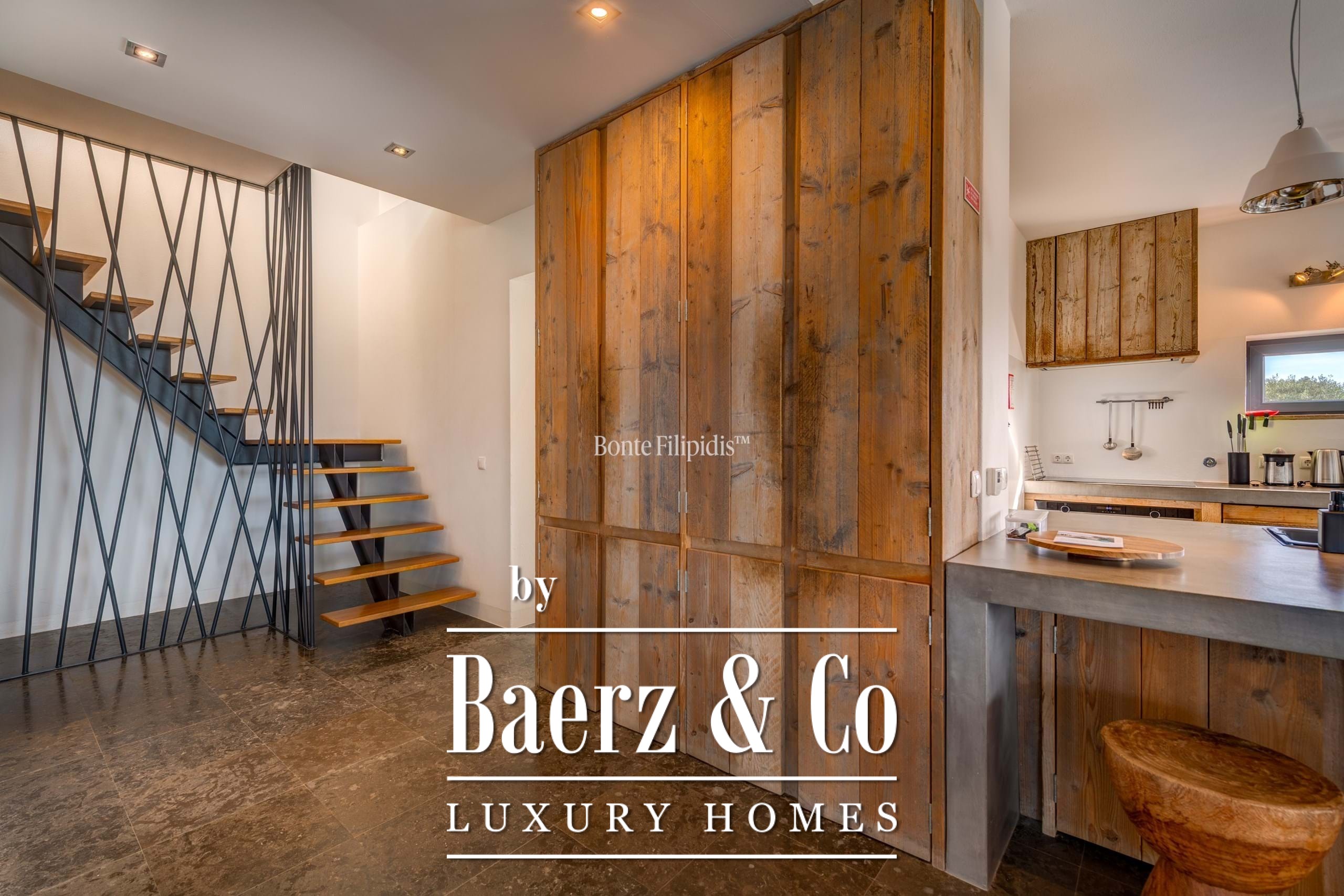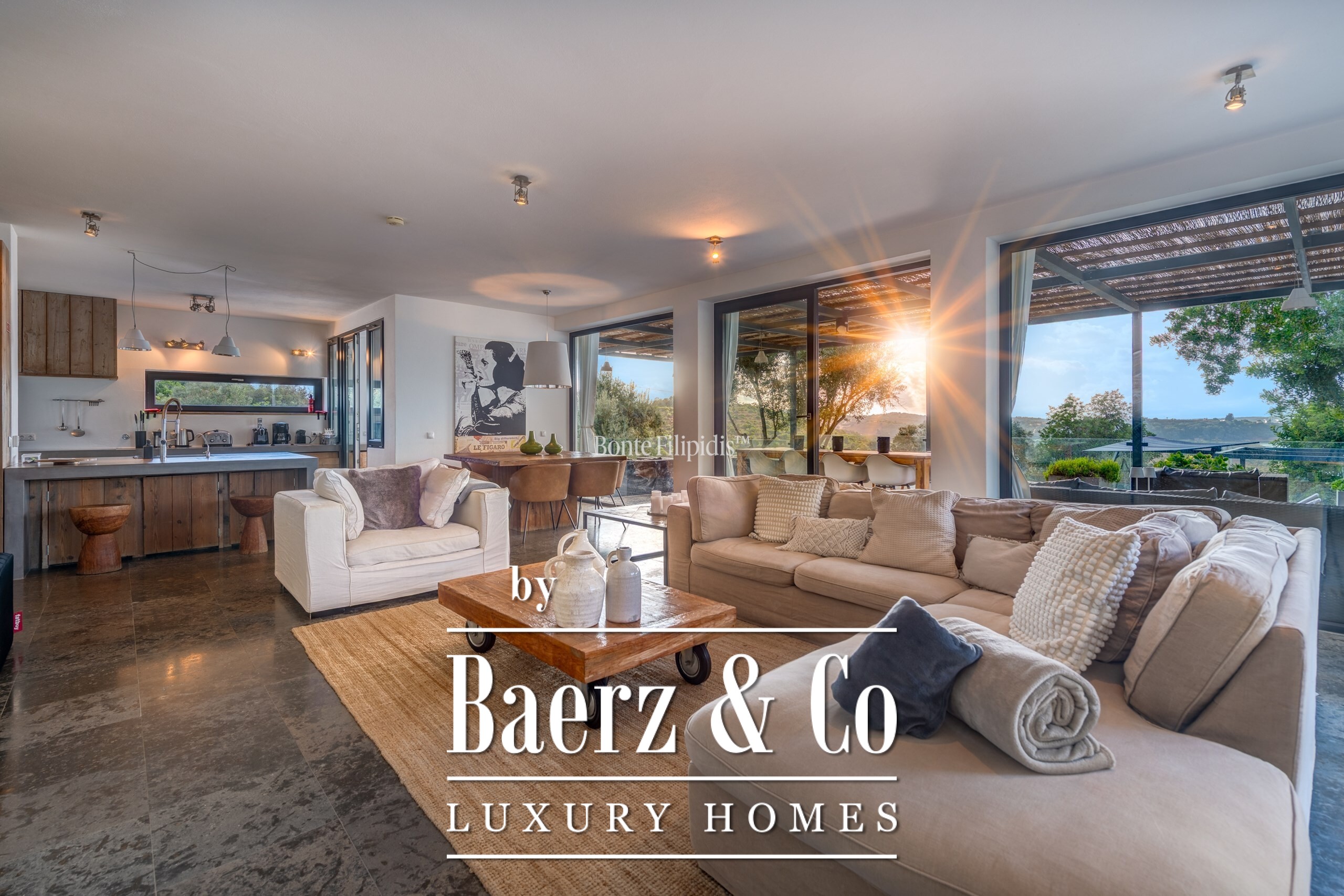Участок площадью 2 440 м² обрамляют зрелые оливковые рощи и виноградники; ландшафтный сад, частный бассейн и джакузи на шесть человек создают атмосферу уединённости и спокойствия. Концепция энергоэффективности доминирует: 48 панелей солнечных батарей, система тёплого пола и камин Salamander гарантируют комфорт в течение всего года. Полностью оборудованные кухни внутри и на улице подходят как для тихих утренних моментов, так и для дружеских встреч.