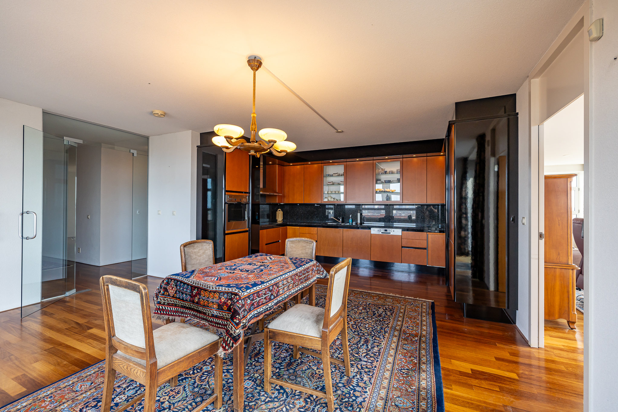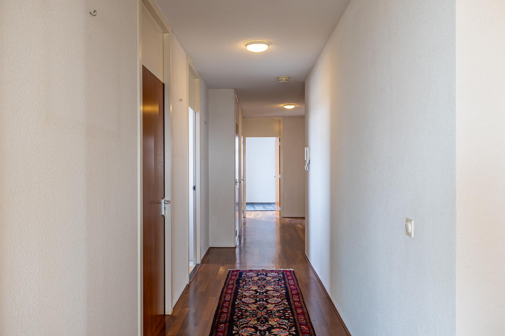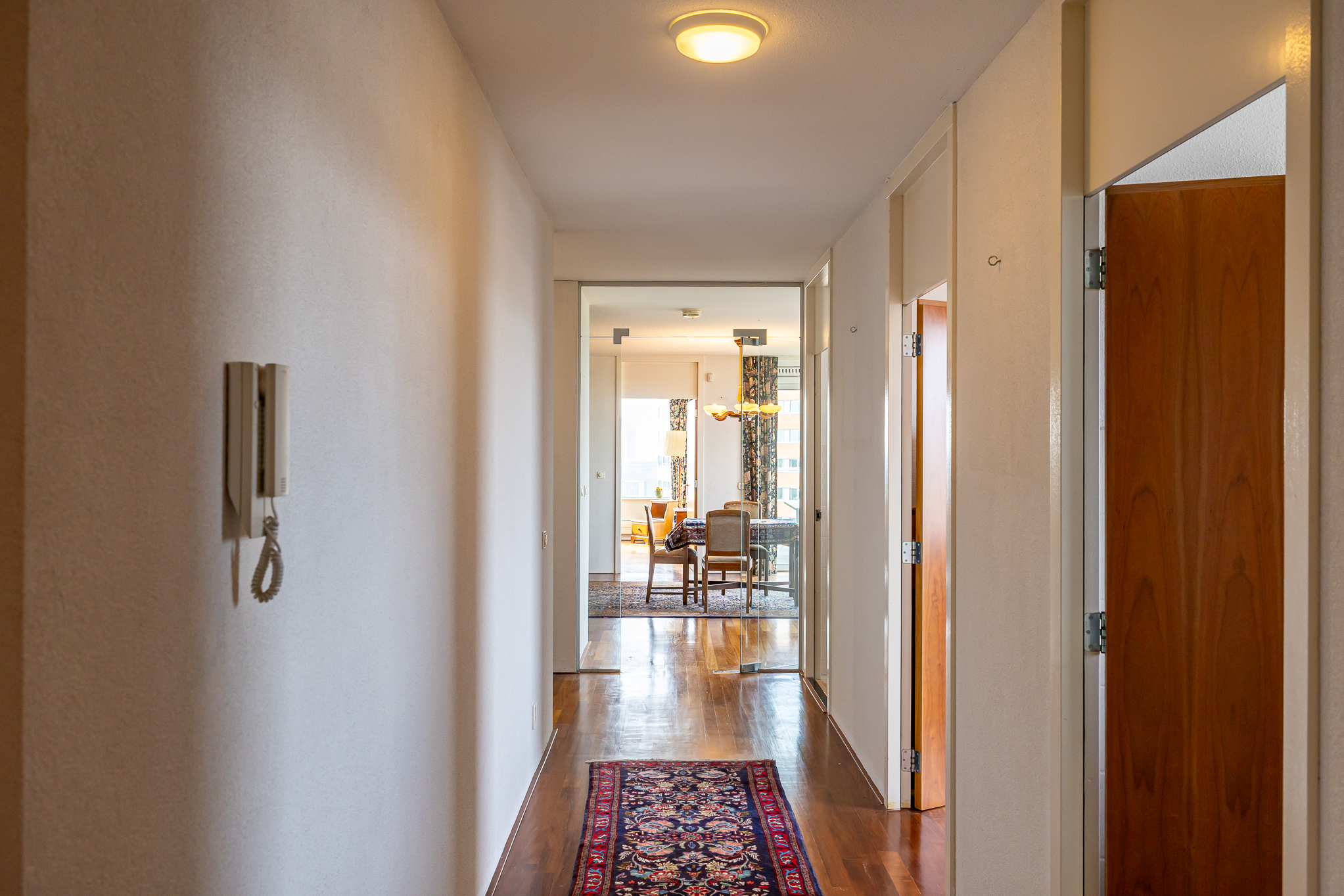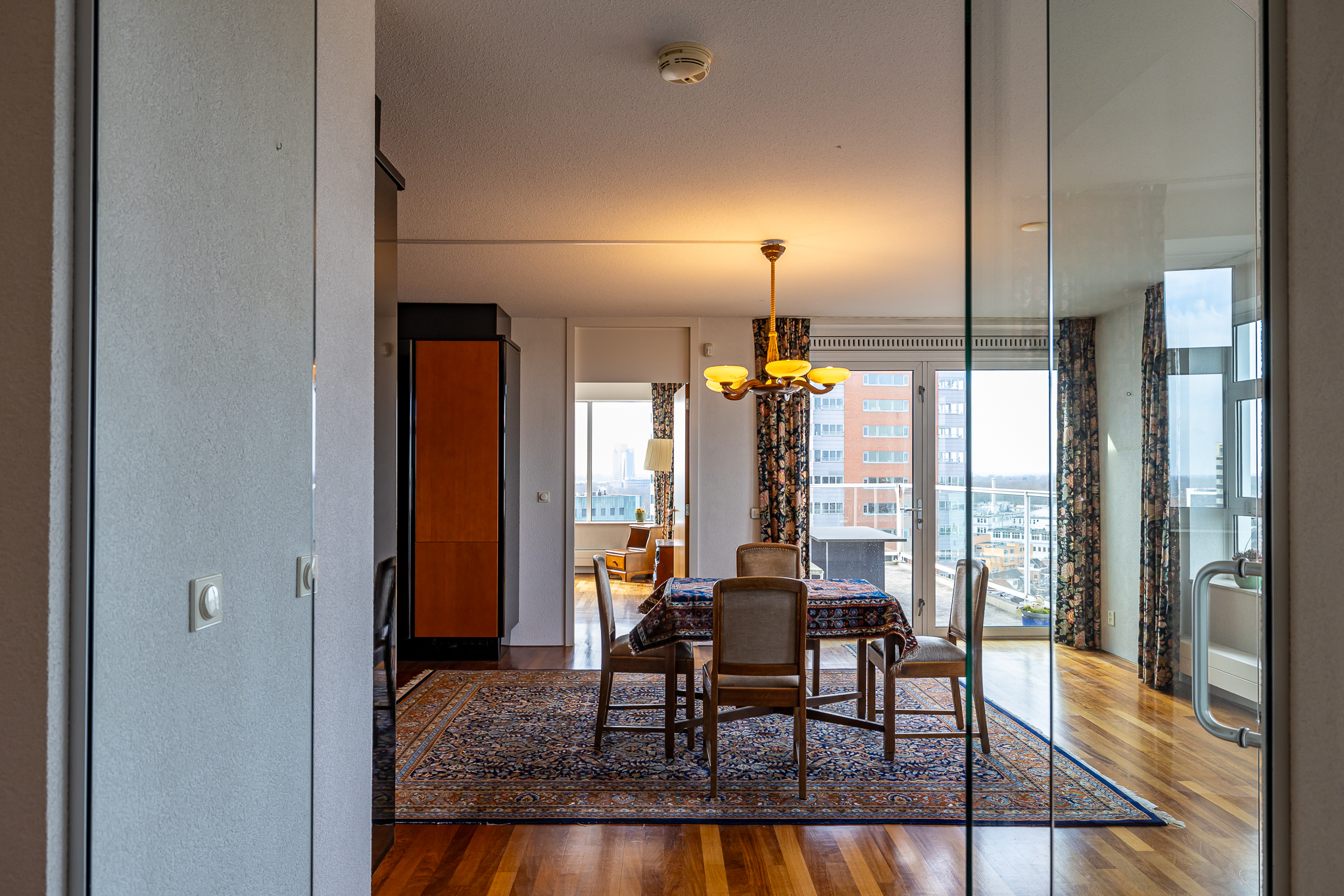 Элегантный вход ведет от центрального холла — с домофоном и лифтом — к вашему частному холлу на 12 этаже, где расположены два отдельных входа. Оба крыла пентхауса объединяются в освещённую главную гостиную и просторную столовую с кухней, а каждая часть имеет выход на две просторные террасы площадью примерно 18 м² каждая. Несколько спален имеют прямой выход на балкон по периметру, что позволяет наслаждаться солнцем и городскими пейзажами в любое время дня.