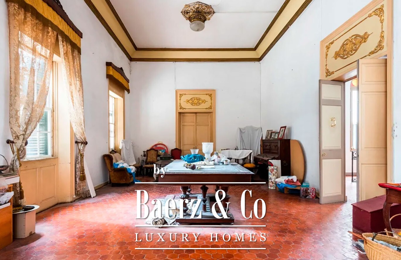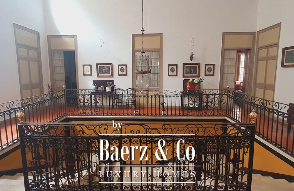 В центре дома возвышается величественная лестница, ведущая на первый этаж, куда свет проникает через почти восемьдесят окон, несколько из которых открываются на балконы с видом на старый город. Внутренние пространства впечатляют просторными залами с высокими потолками, портиками и ярко выраженными архитектурными деталями, формируя атмосферу, насыщенную историей и патиной времени. С верхнего уровня терраса открывает панорамные виды на Махон: вдали виднеется порт, крыши вековых зданий и знаковые ориентиры Менорки, включая гору Торо на горизонте.