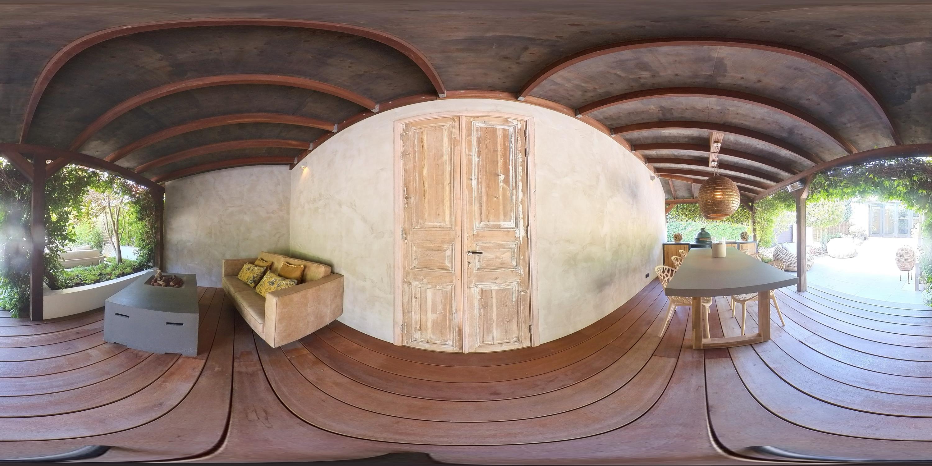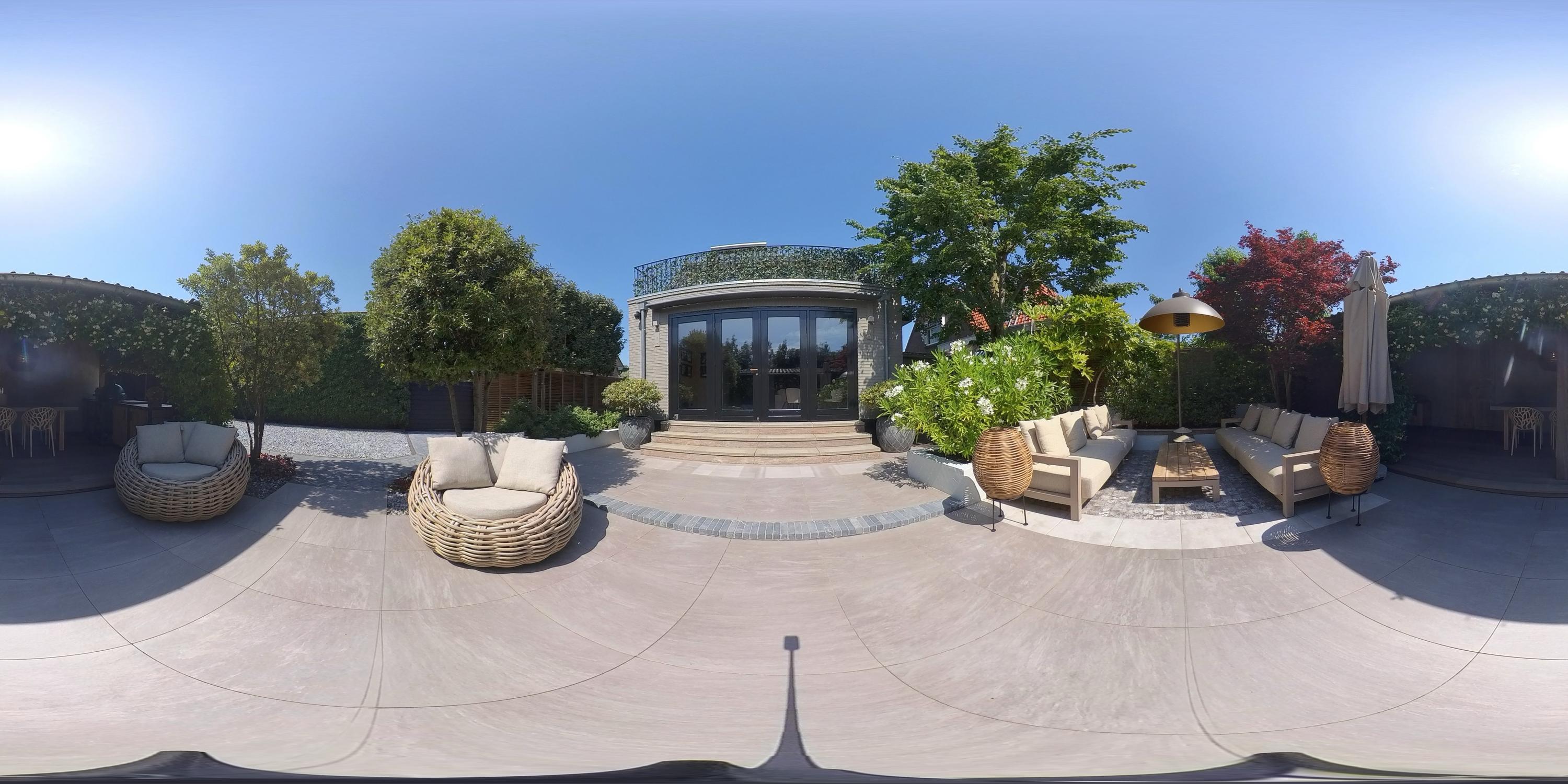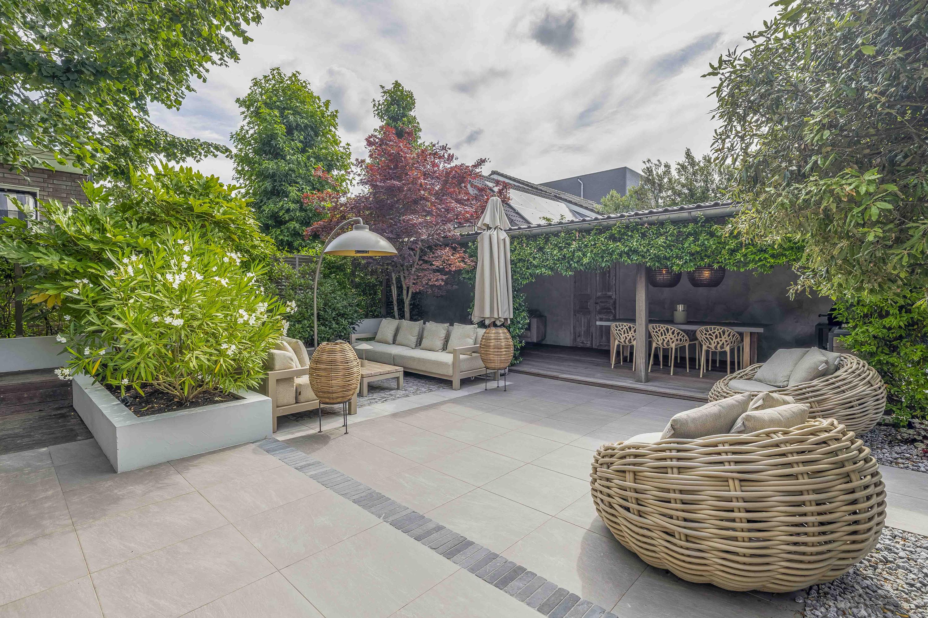 Achterin de tuin bevindt zich een stijlvolle overkapping met buitenkeuken en open haard – perfect voor ontspannen zomeravonden.