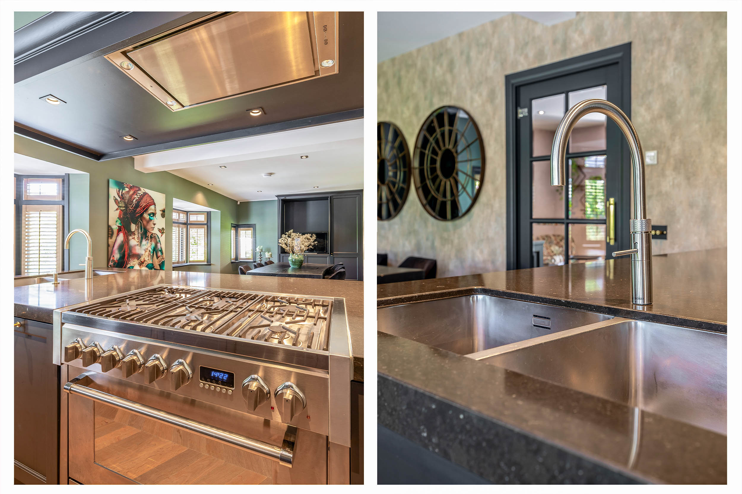 De keuken vormt het kloppend hart van de woning. Hier komen esthetiek en functionaliteit samen in een ruimte die uitnodigt tot koken, tafelen en samenzijn. De combinatie van verfijnde kleurstelling en zorgvuldig gekozen materialen geeft deze keuken een warme, exclusieve uitstraling. Niet alleen is het een volwaardige werkplek voor culinaire creativiteit, maar ook de ideale plek voor lange avonden met vrienden of familie. De open verbinding met de woonkamer onderstreept de samenhang van het interieur.