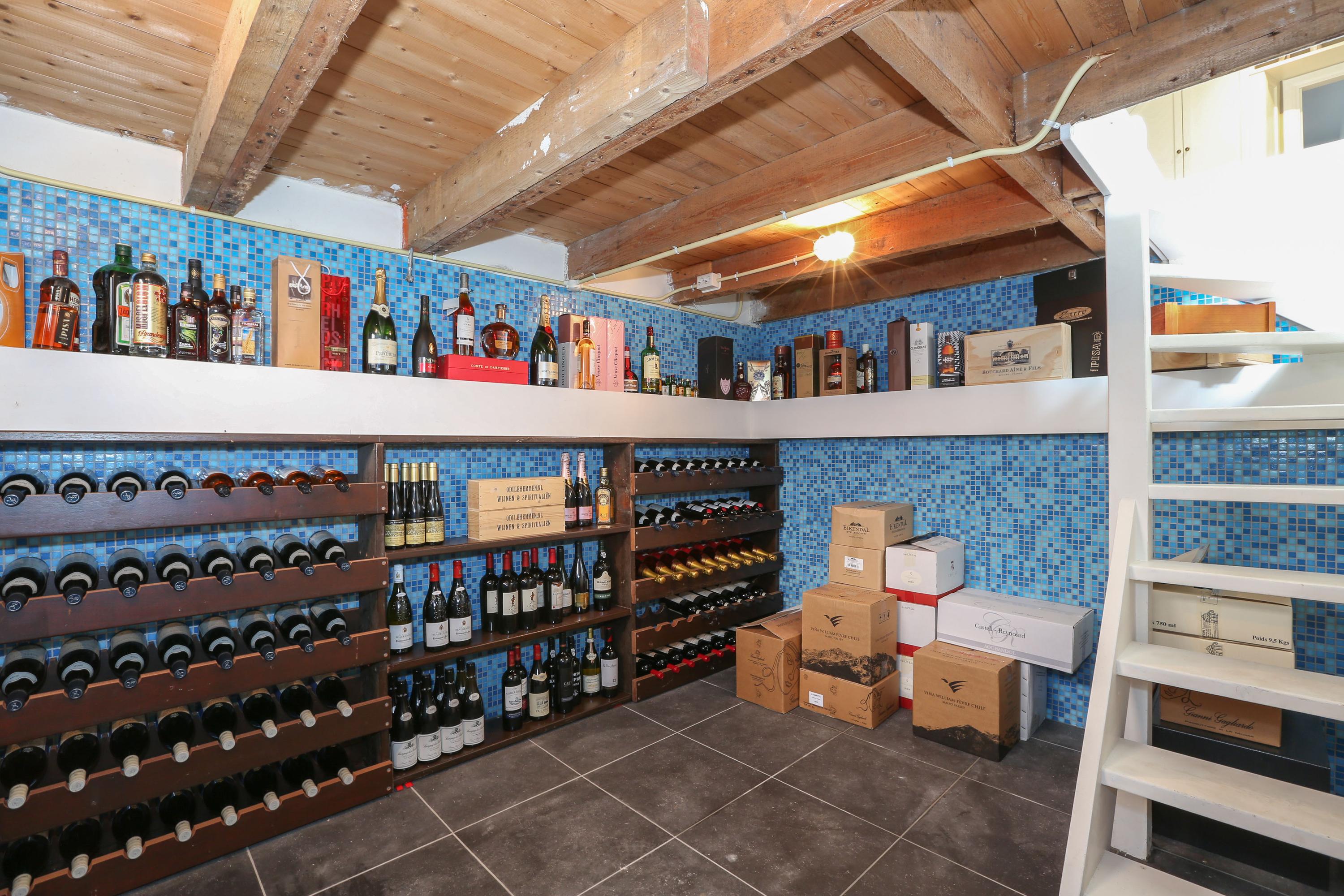 Uitgebouwde woonkamer met fraaie kastenwand, gashaard en openslaande deuren naar het onderheide terras. Toegang tot de wijnkelder