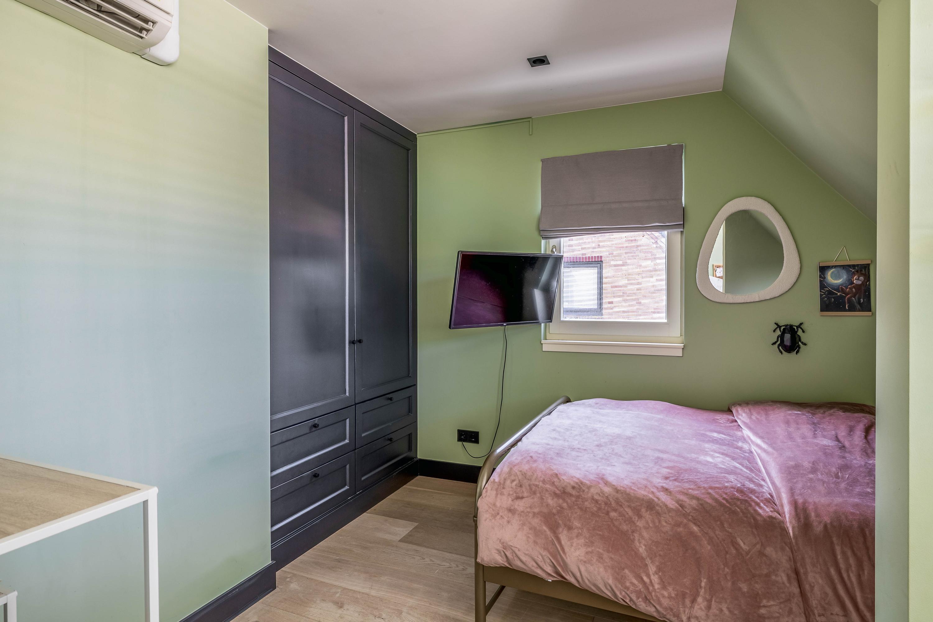 De riante woonkamer ademt rust en klasse dankzij een stijlvolle wandafwerking, een prachtige vloer in Hongaarse punt en openslaande deuren naar de tuin. De grote raampartijen zorgen voor een natuurlijke lichtinval, wat bijdraagt aan de warme, uitnodigende ambiance van het huis.