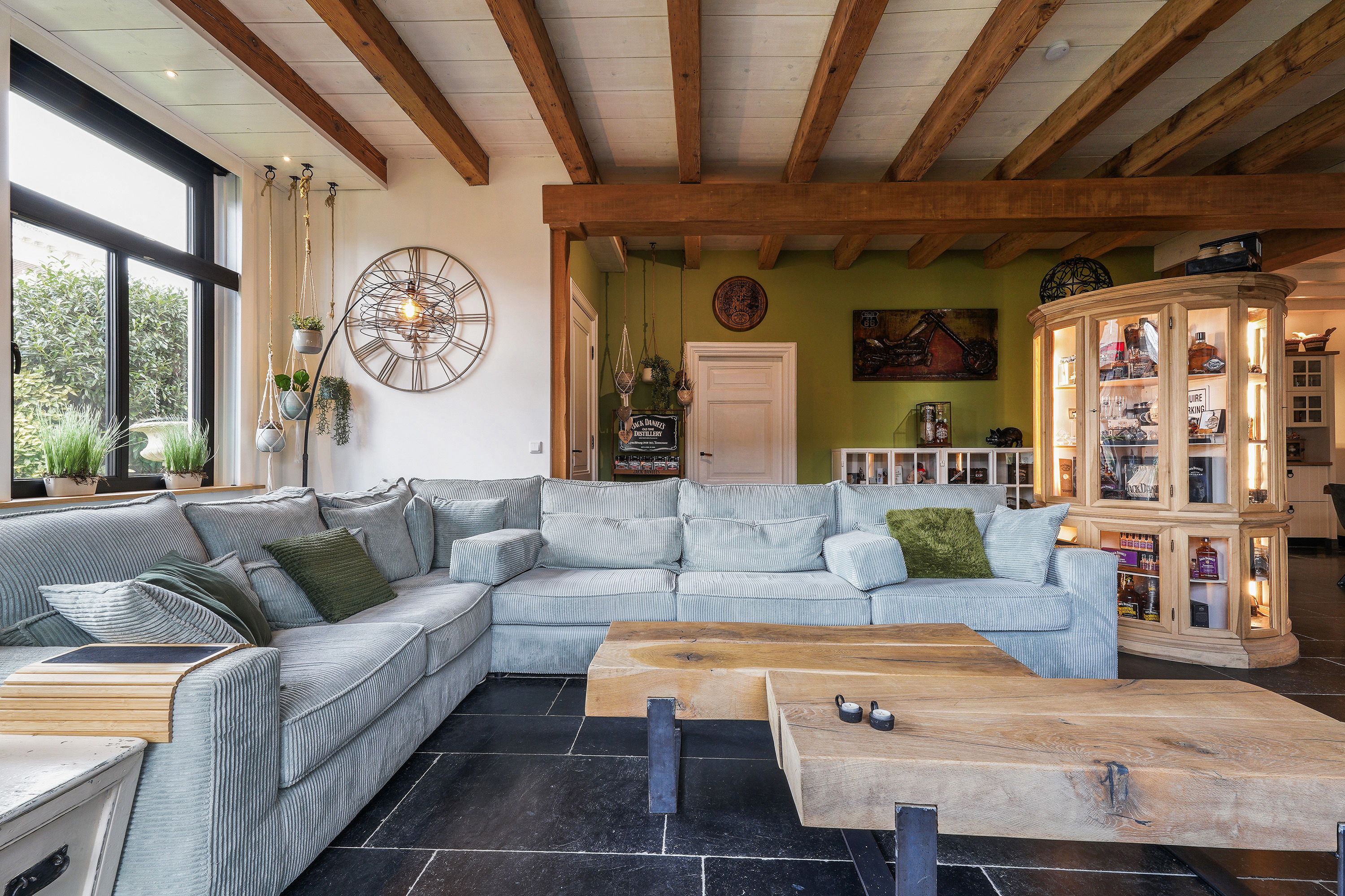 Кухня с внушительным островом и обеденным столом из дерева открыта в гостиную, способствуя как уютным домашним встречам, так и масштабным мероприятиям. По соседству — примечательная барная зона с холодильным оборудованием, санузлом и эффектной антресолью. Гараж площадью почти 160 м², оборудован подъёмными воротами высотой 3,5 метра, предназначен для коллекционеров, путешественников или мастеров.