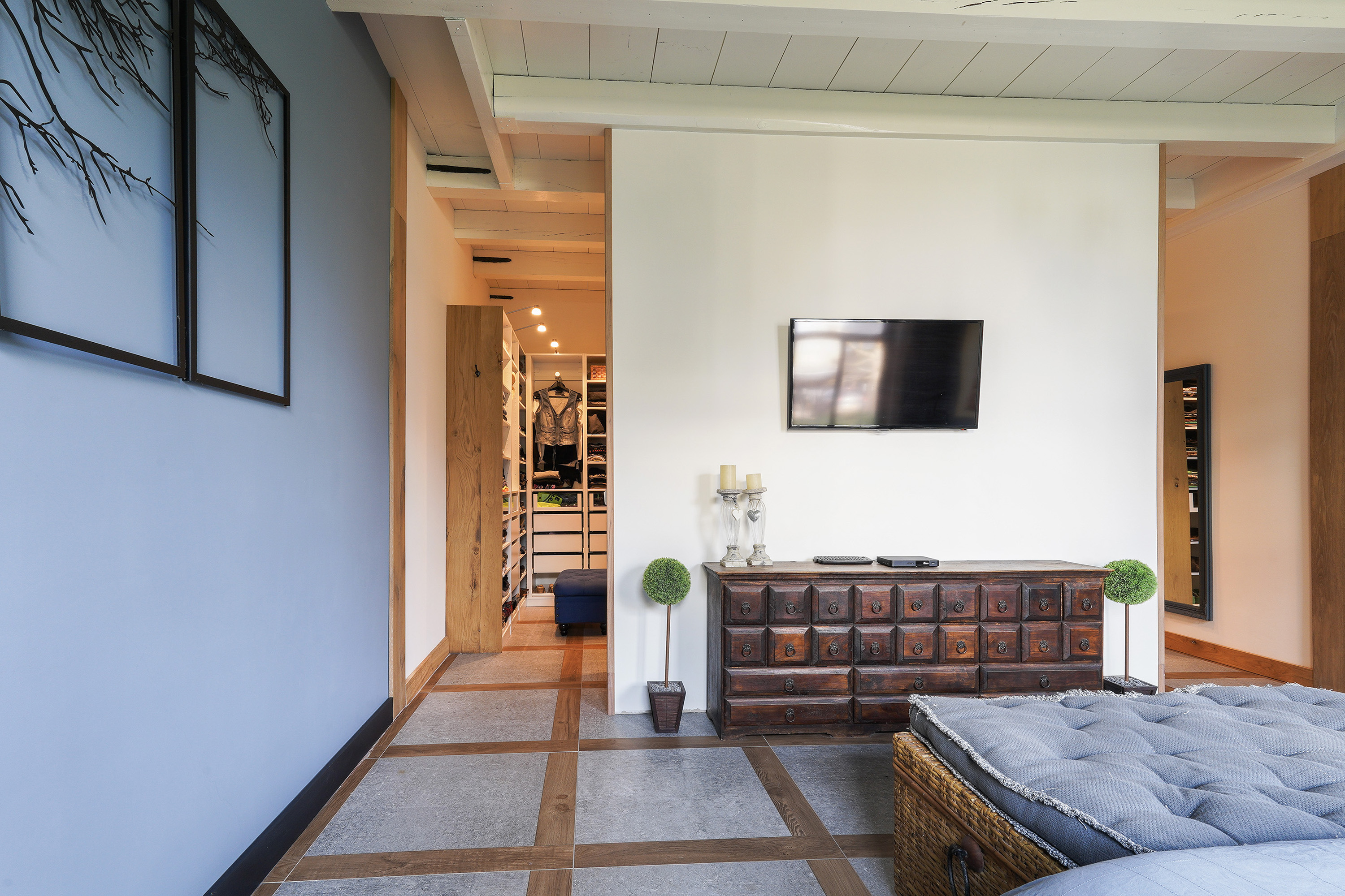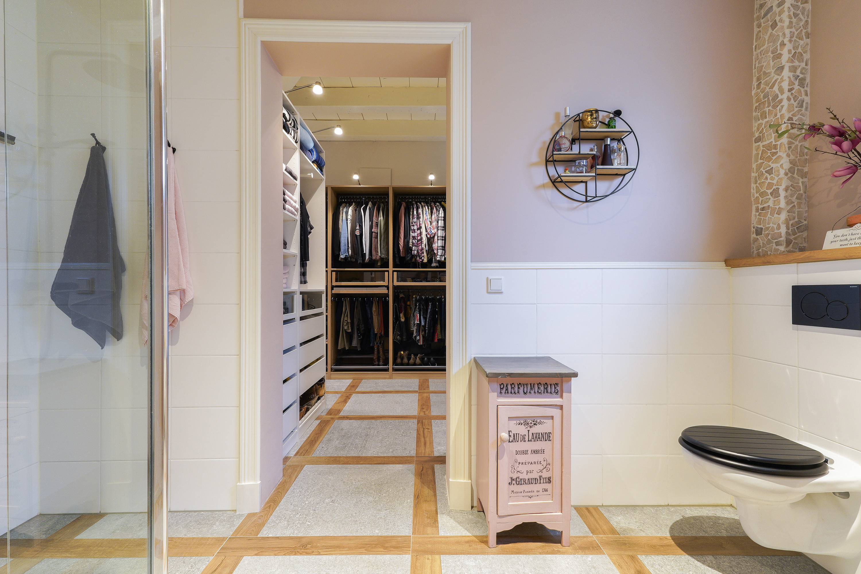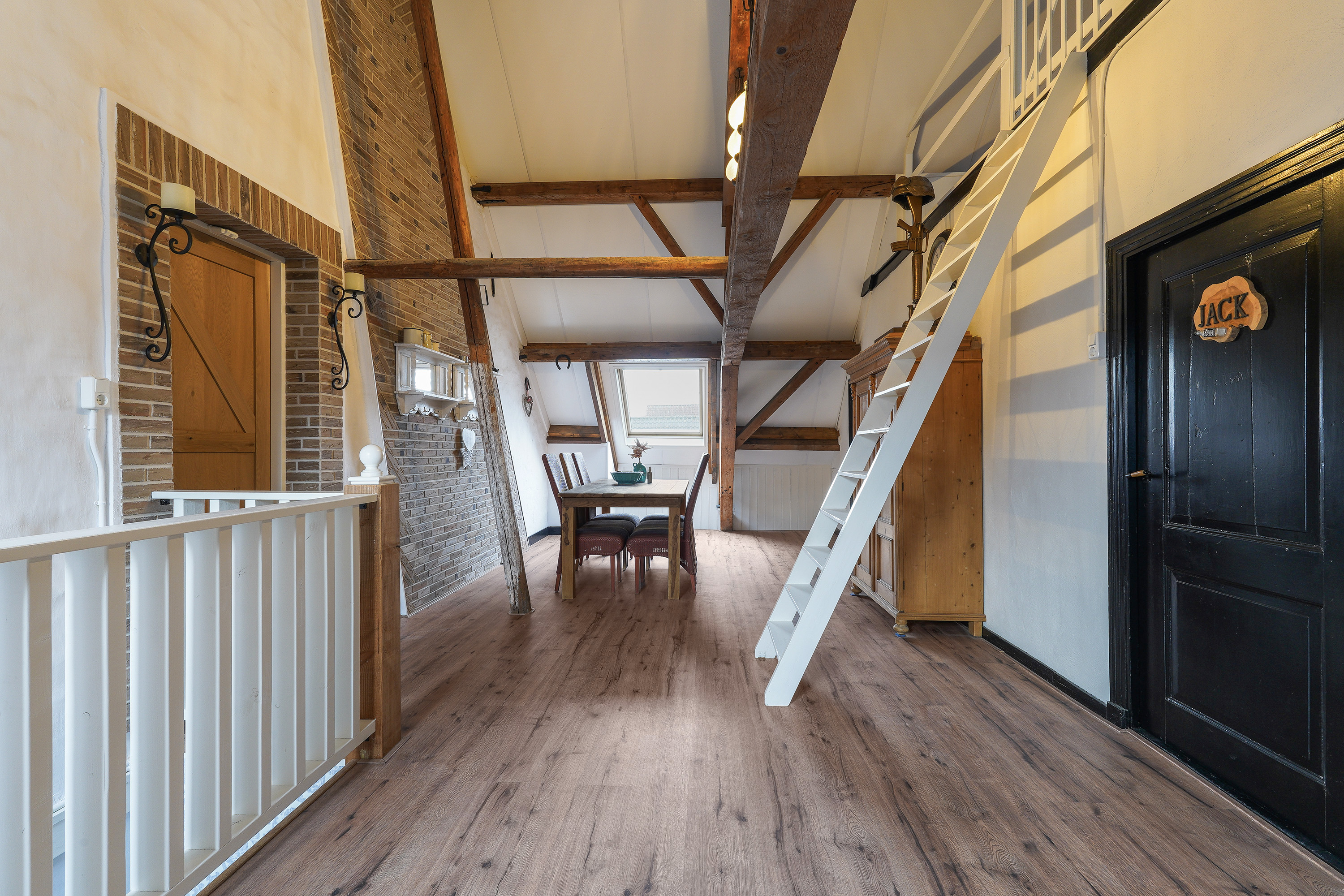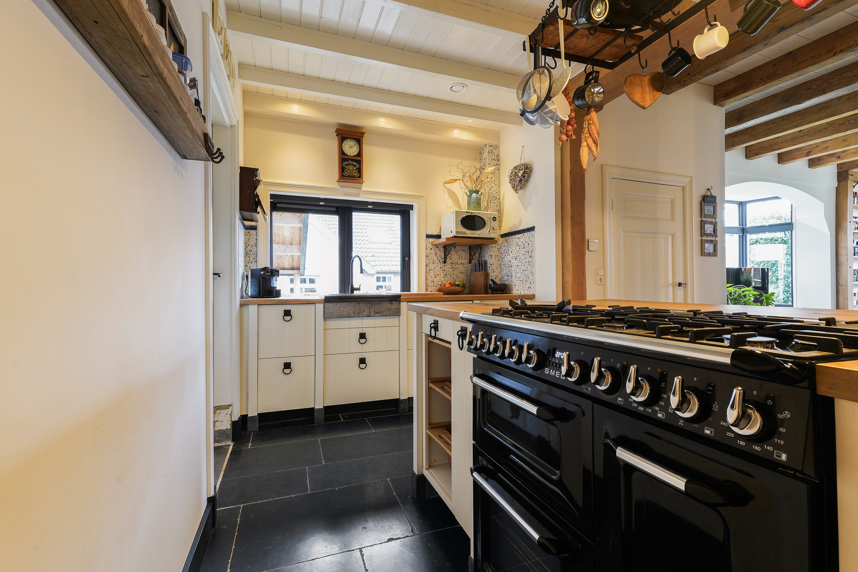 Здание 1850 года сохраняет свой подлинный характер благодаря открытым и обработанным деревянным балкам, восстановленным фасадам и современному уровню комфорта. Первый этаж предназначен для жизни на любом этапе, включает просторную гостиную, большую спальню с гардеробной и крупную ванную комнату с подогревом пола для ежедневного комфорта. На втором этаже расположены три светлые спальни и вторая ванная — всё спланировано так, чтобы подчёркивать легкую масштабность дома.