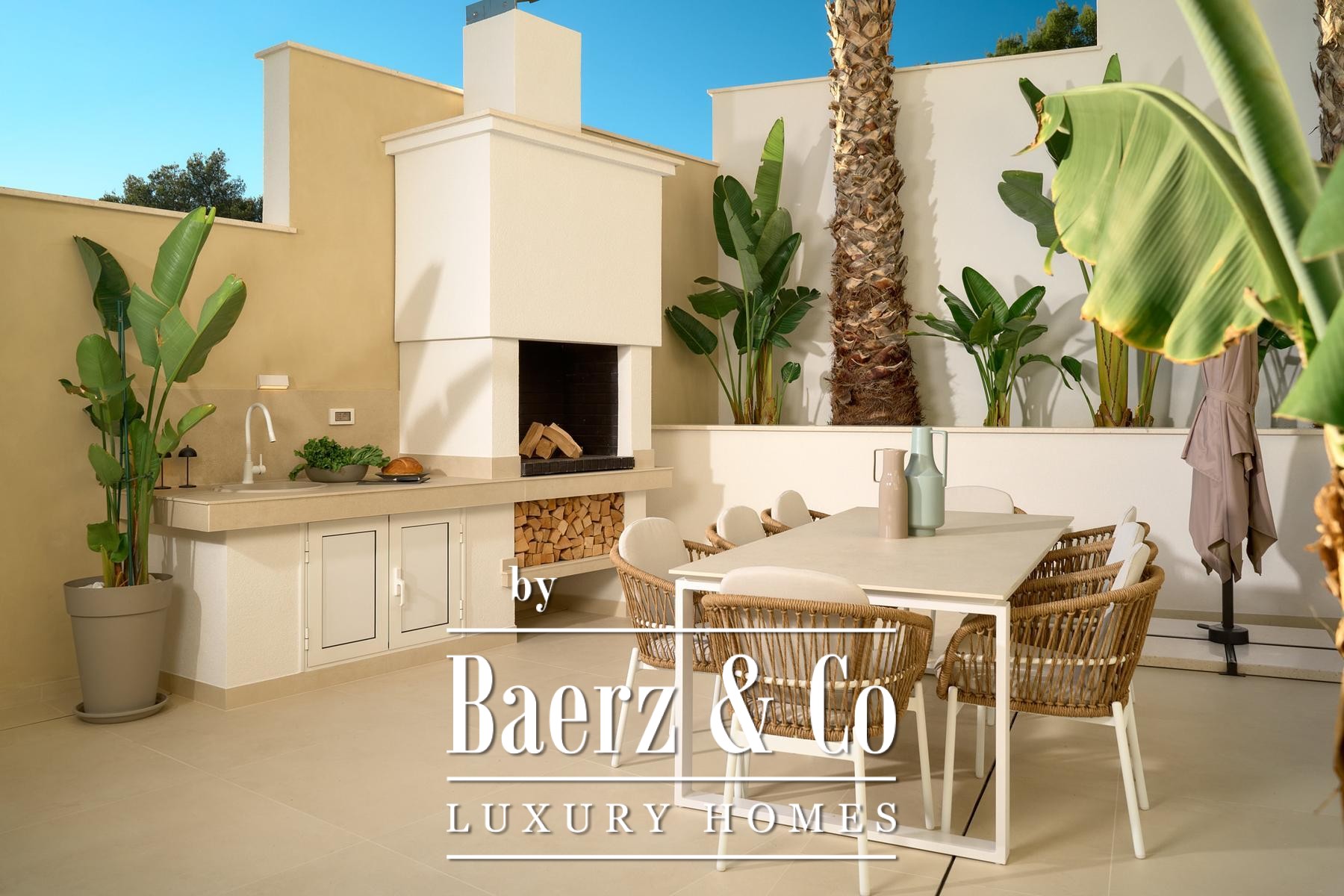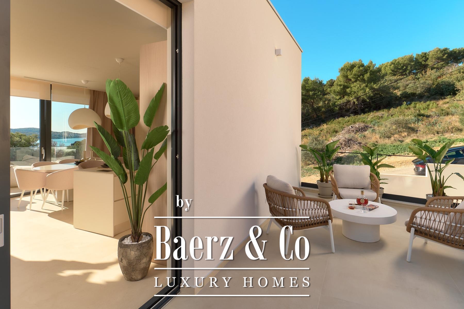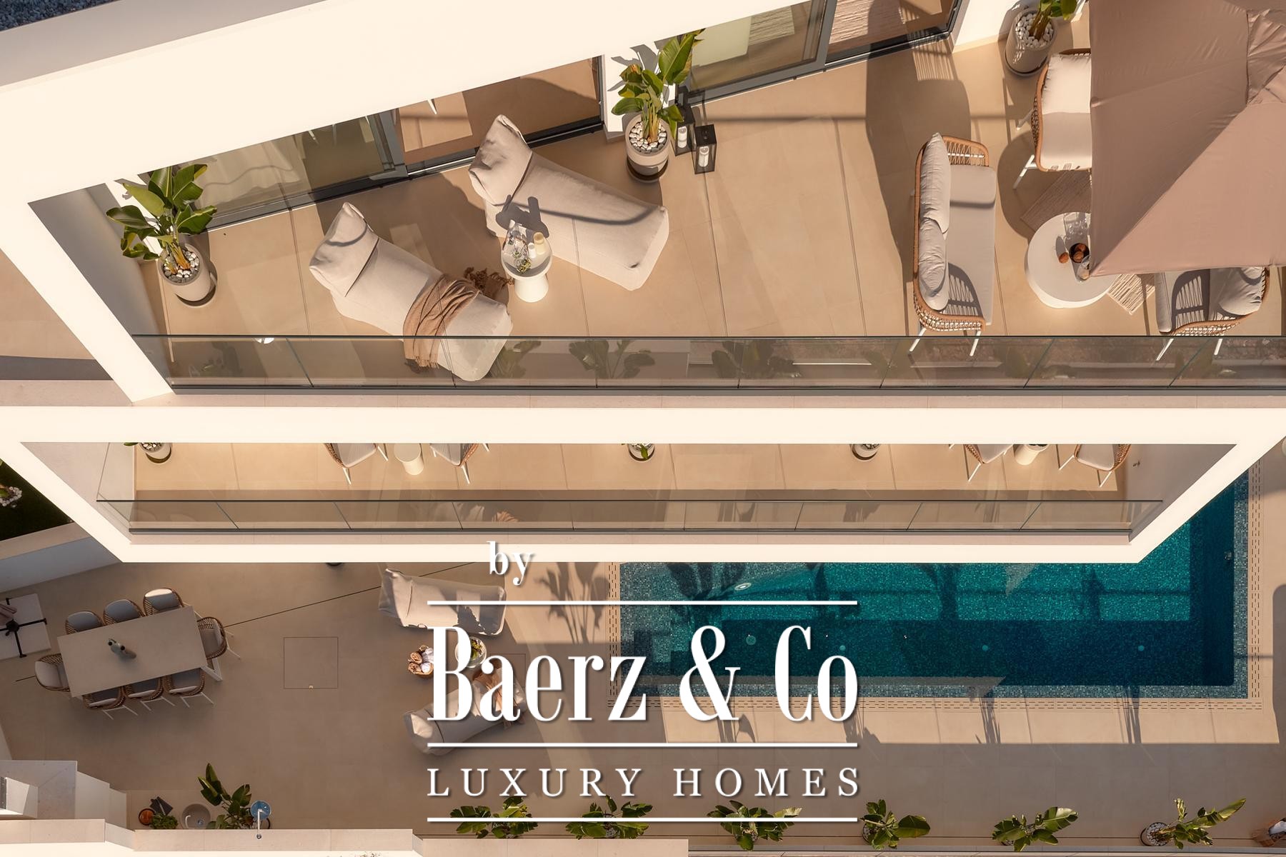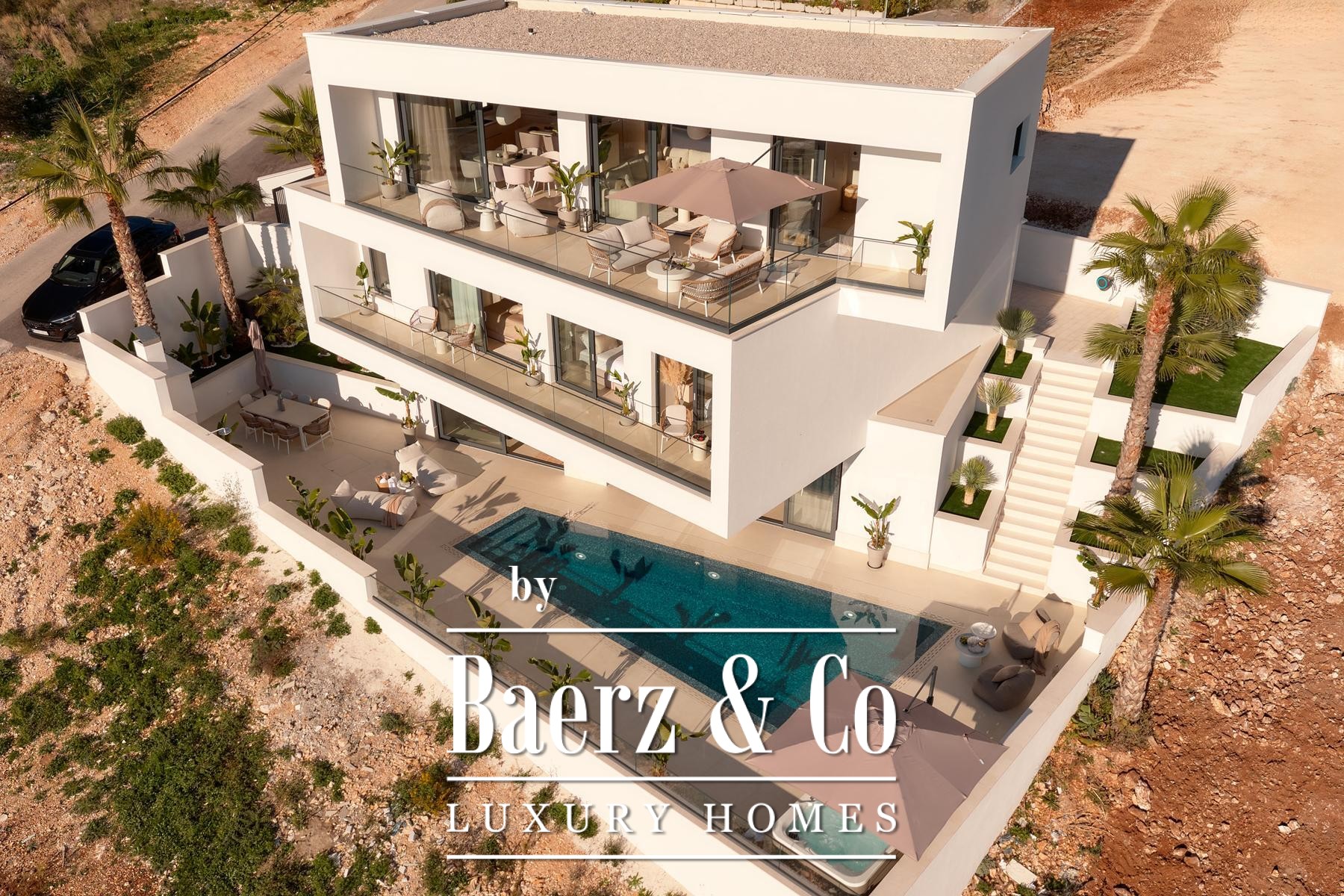 Строительные стандарты безупречны: потолочное кондиционирование, тёплый пол на тепловых насосах, вентиляция с рекуператором, термоизоляция, алюминиевые оконные системы, стеклянные ограждения террас, солнечные панели, автоматический полив сада и видеонаблюдение обеспечивают техническое совершенство. Два открытых парковочных места и средиземноморское озеленение обогащают атмосферу.