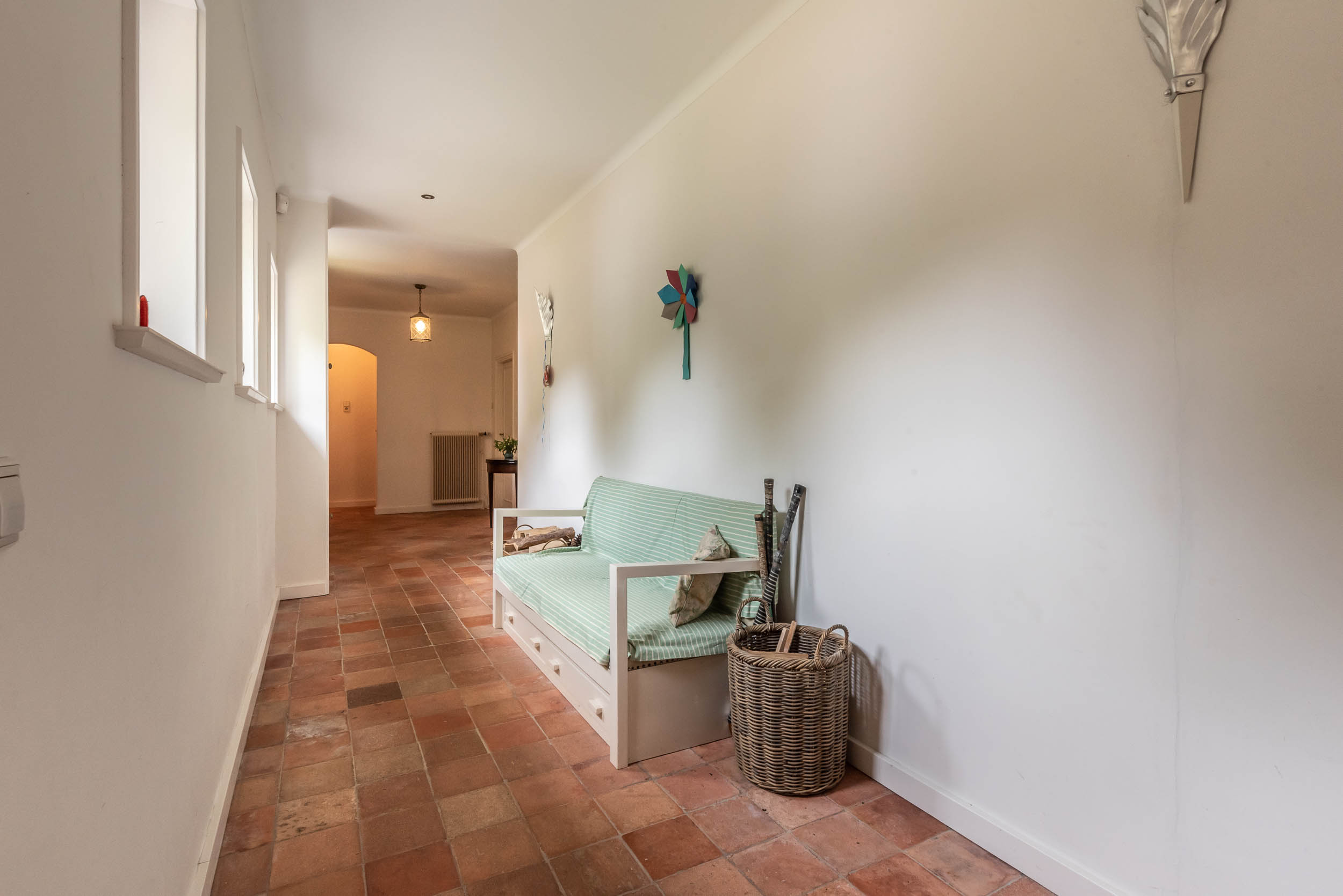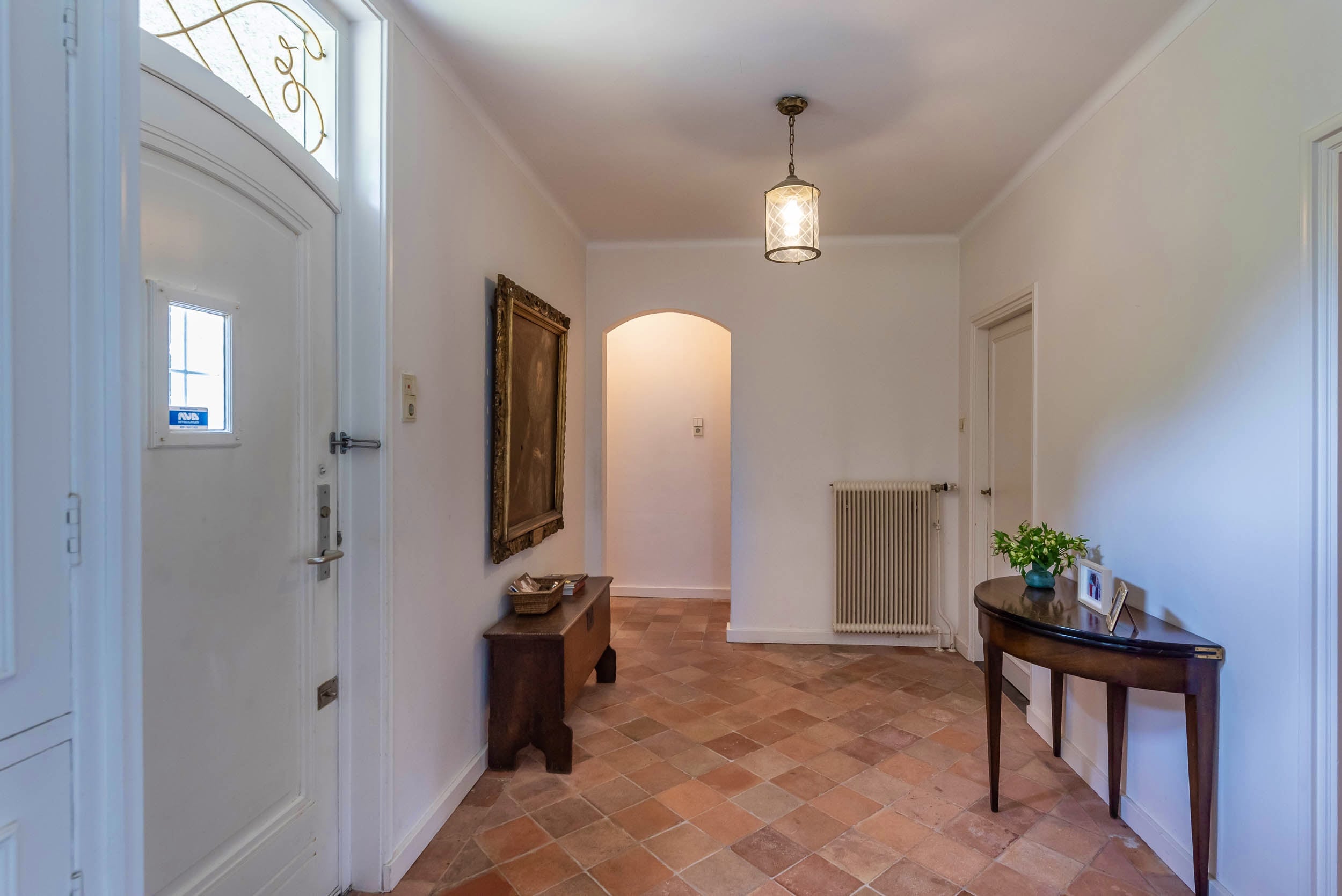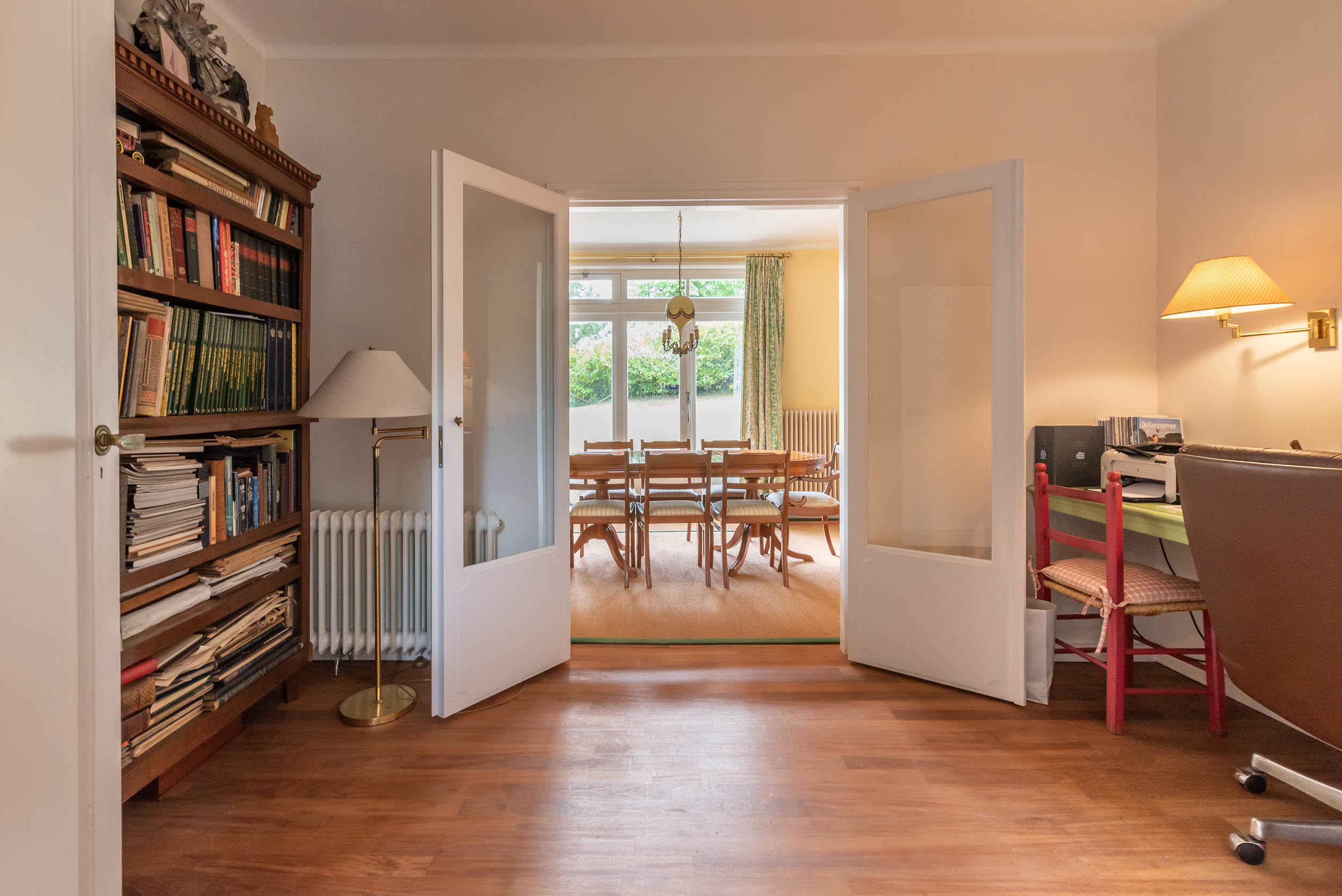 En svepande infart leder till ett dubbelcarport med rundel och gott om parkering, kompletterat av ett integrerat garage. Boytan på 221 m² fördelas på både det ursprungliga huset från 1953 och en tillbyggnad från 2001, med bibehållen arkitektonisk harmoni. Interiören är skapad för komfort: ljusa, luftiga rum binds samman med franska dörrar till en ovanligt omväxlande och solig trädgård. Sällskapsytorna karaktäriseras av parkett och terrazzogolv, öppna spisar och platsbyggda detaljer, vilket ger en lågmäld men välkomnande värme.