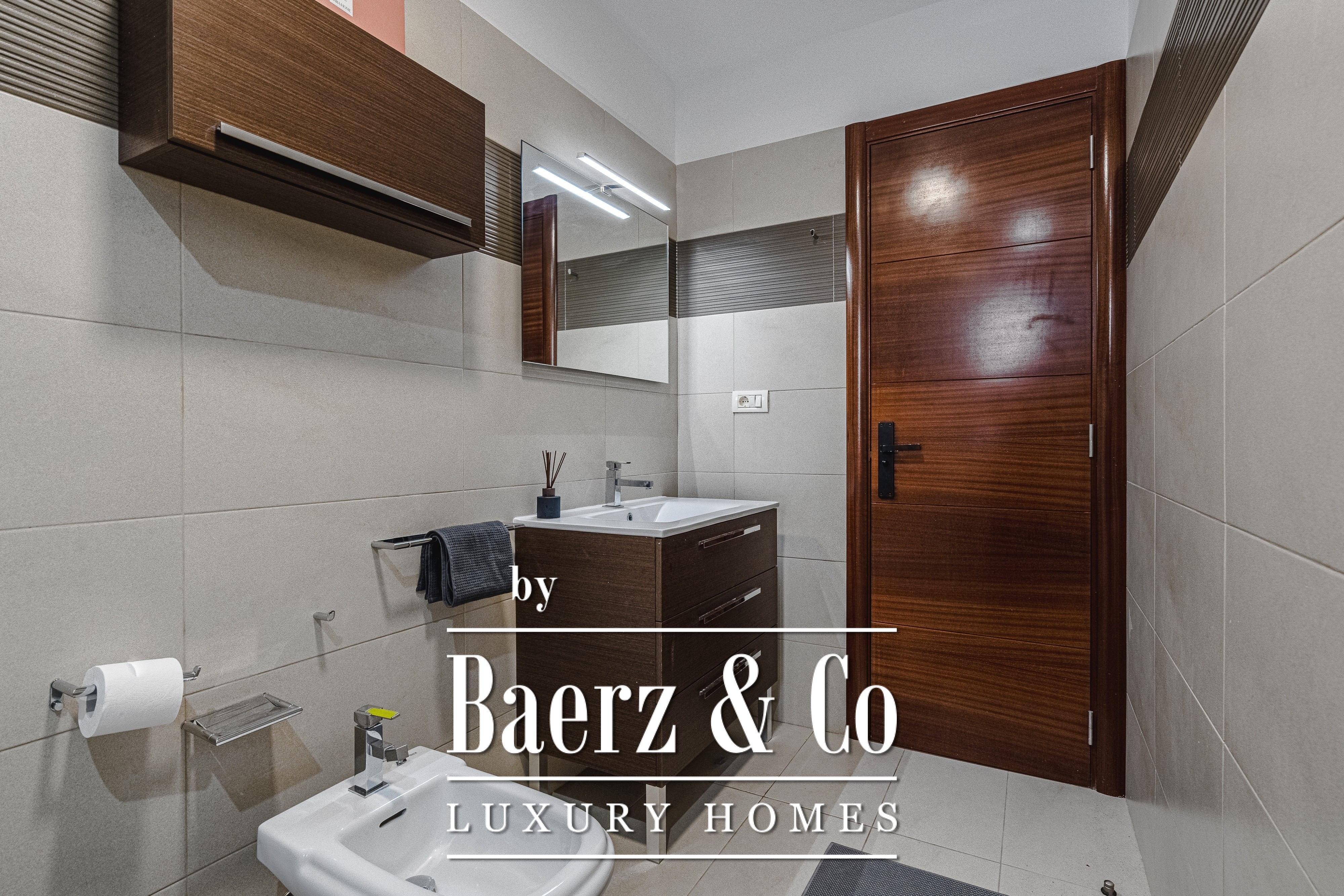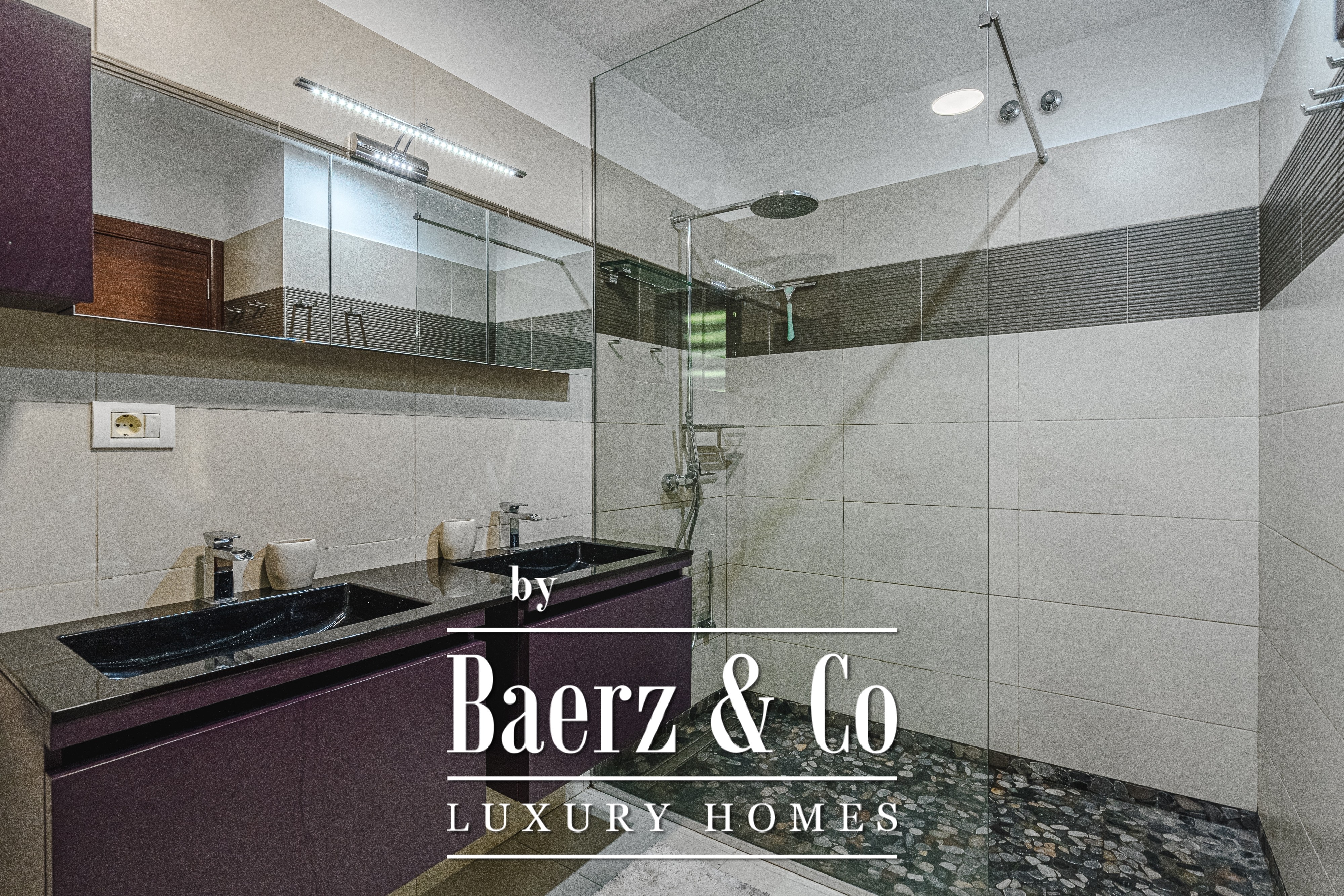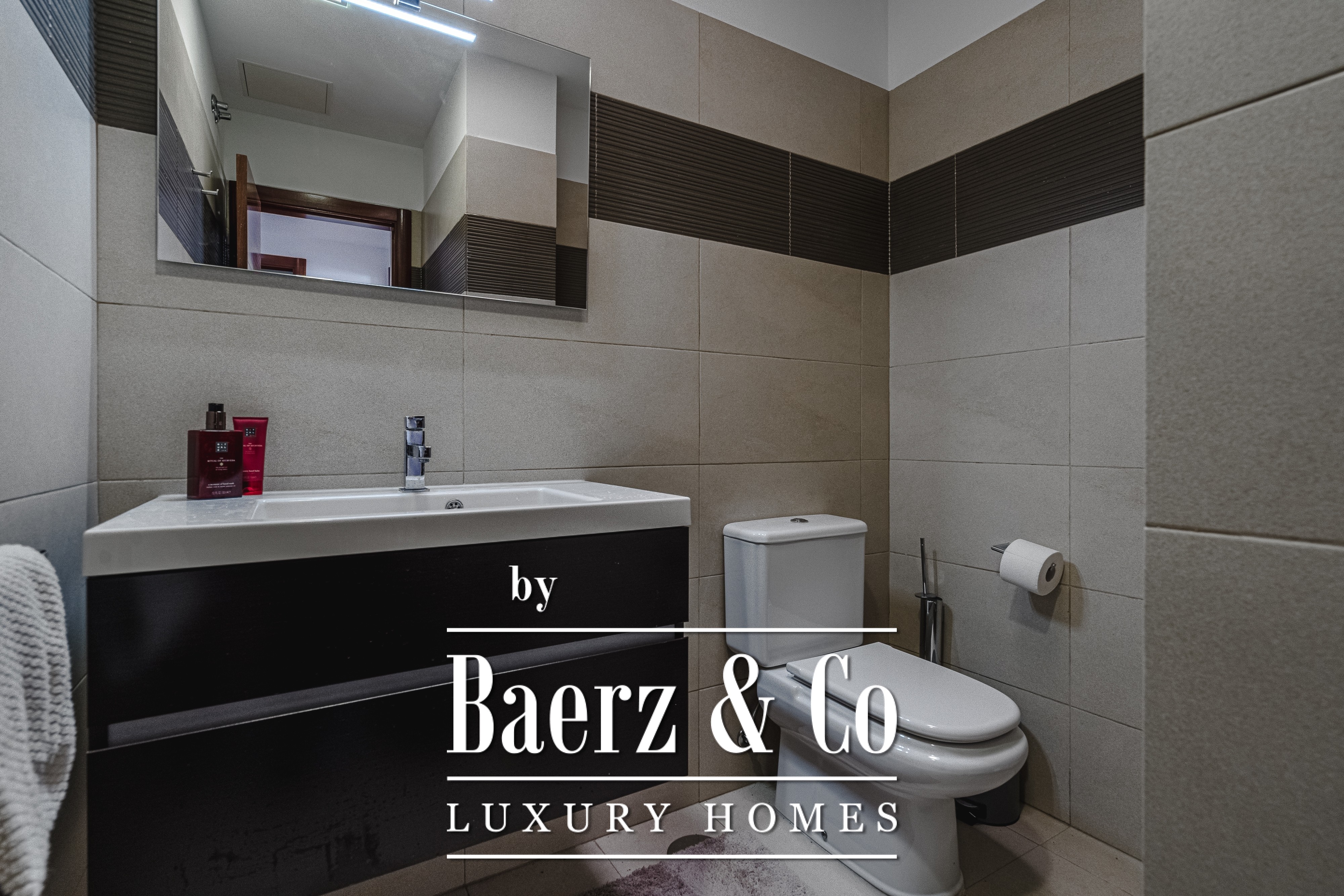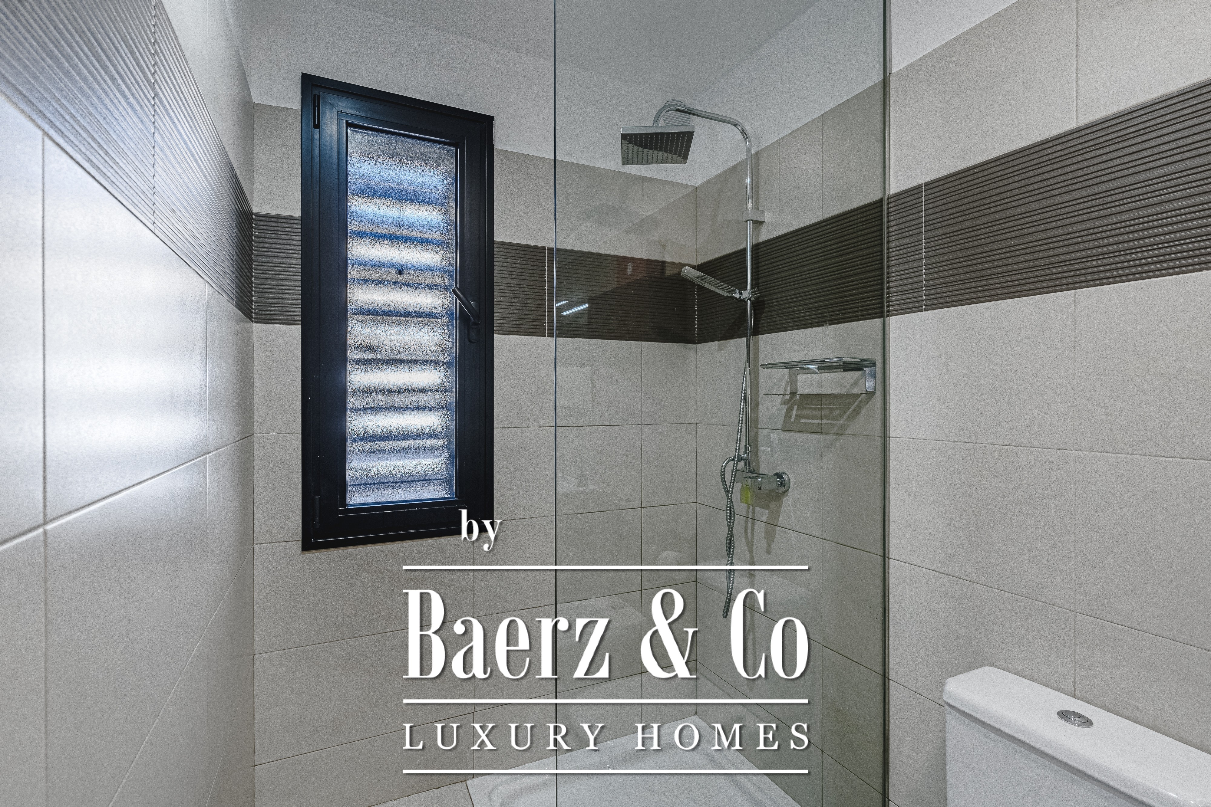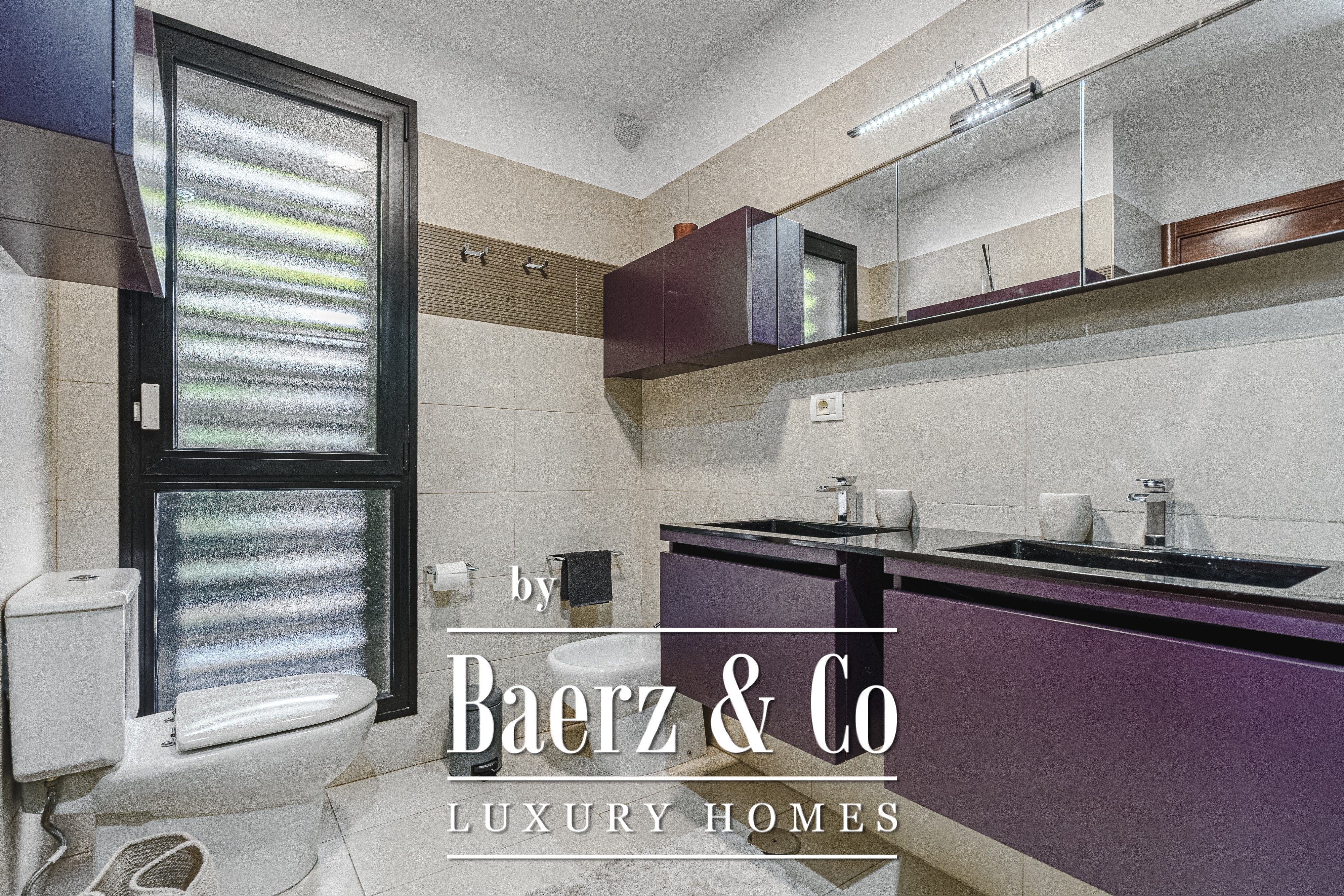 Interiören rymmer tre sovrum och tre badrum som kompletteras av två kök, två tvättstugor och särskilt förrådsutrymme. En självständig gästlägenhet med vardagsrum, sovrum, badrum, klädkammare och kök ger både flexibilitet och avskildhet för gäster eller längre vistelser. Bostaden är utrustad med Daikin-luftkonditionering, värmeåtervinningsventilation och solcellsdriven varmvattenberedare för hållbar komfort.