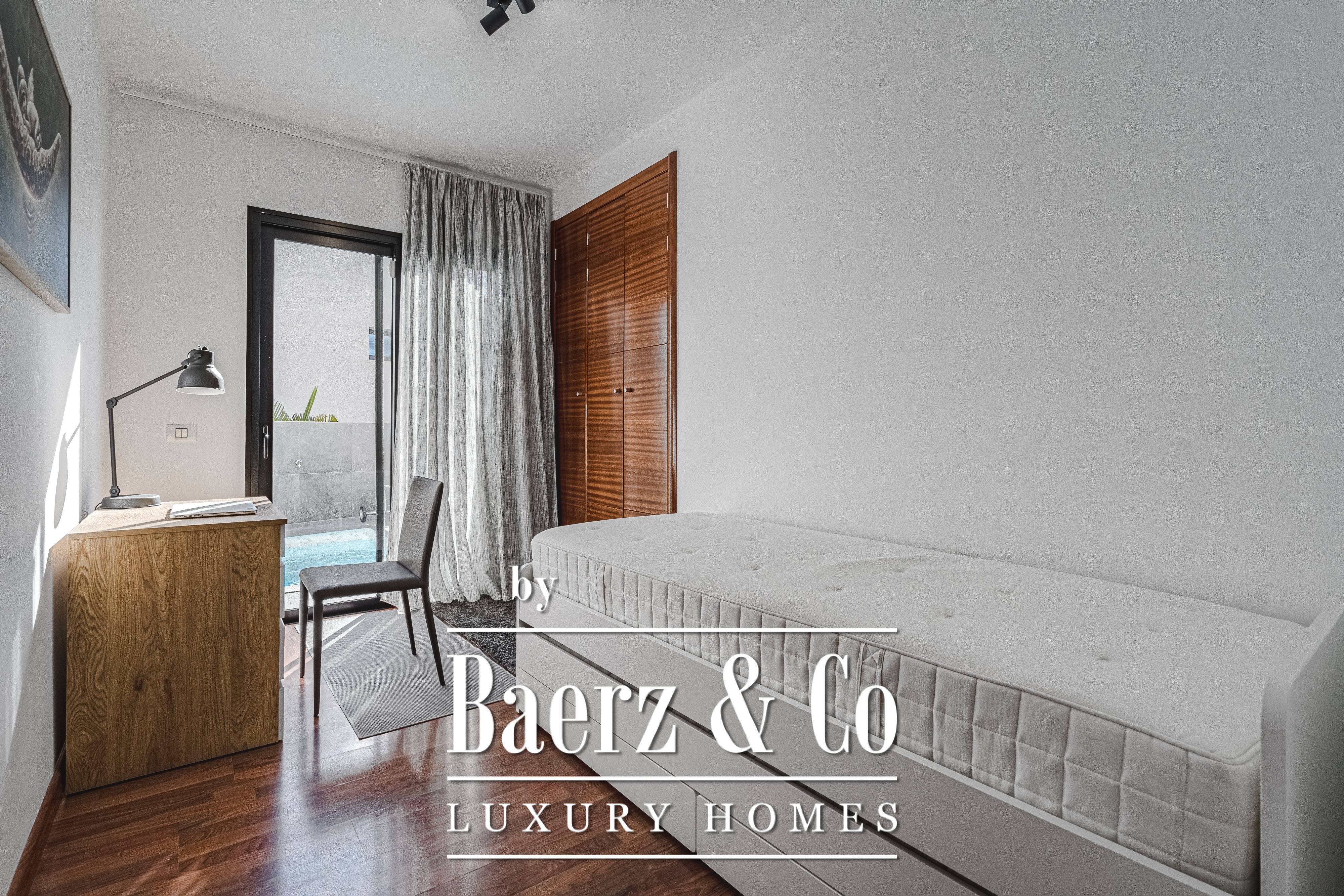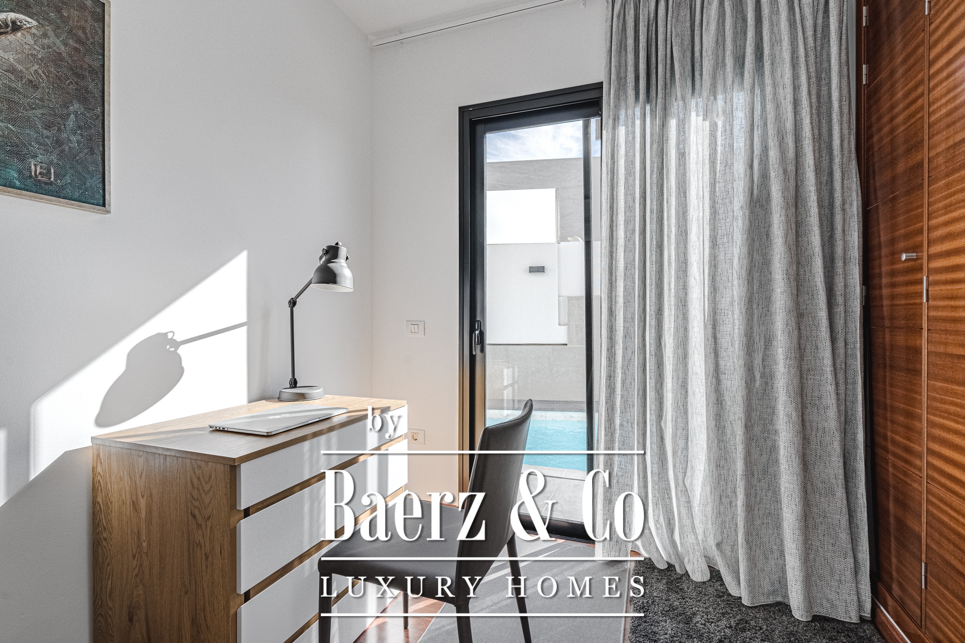 Bland de unika faciliteterna finns privat garage för upp till sex bilar med direkt access till gatan samt panoramahiss som förbinder samtliga våningsplan. Denna fastighet i Caldera del Rey är uttrycket för diskret lyx, skapad för smidig och elegant vardag.