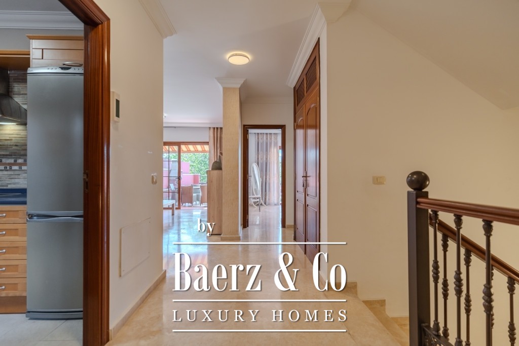 Entréplanet har en välkomnande hall med platsbyggda garderober, separat kök och tvättstuga samt ett vardagsrum med matsalsdel. Ett sovrum och ett badrum kompletterar våningen, med direktutgång till en solig terrass som ramar in den privata poolen och grillplatsen, vackert inbäddad i uppvuxen grönska. Två ytterligare sovrum finns på övre plan, båda med platsbyggda garderober och egna utsikter—det ena med tillgång till en terrass med parkutsikt och en glimt av havet i fjärran, det andra mot en liten balkong riktad mot trädgården. Två badrum, varav ett en suite, samt gott om förvaring i korridoren utgör det övre planet.