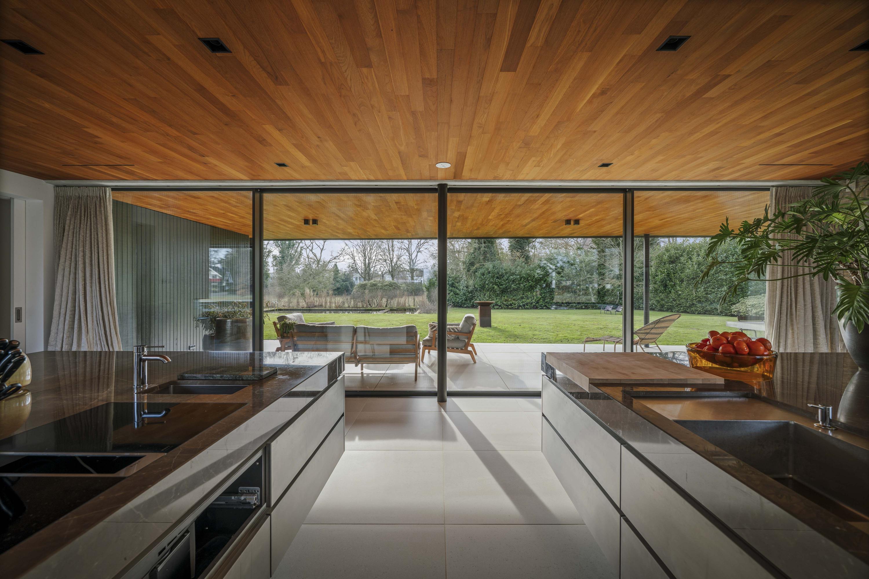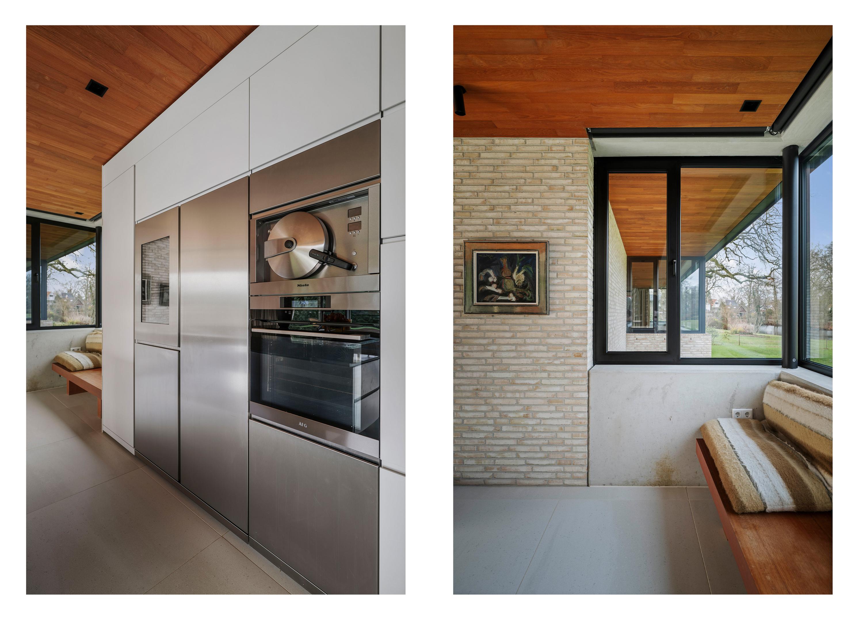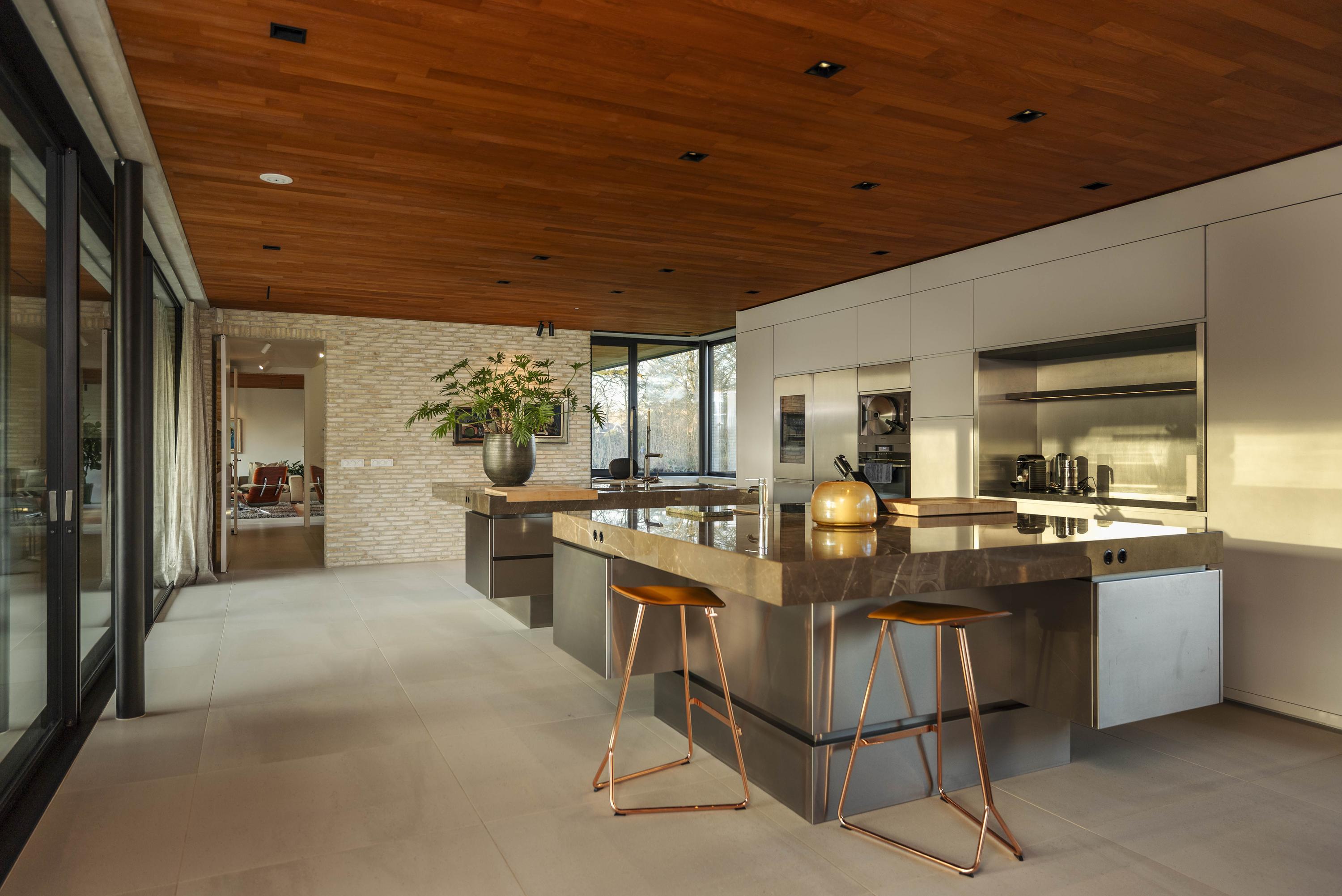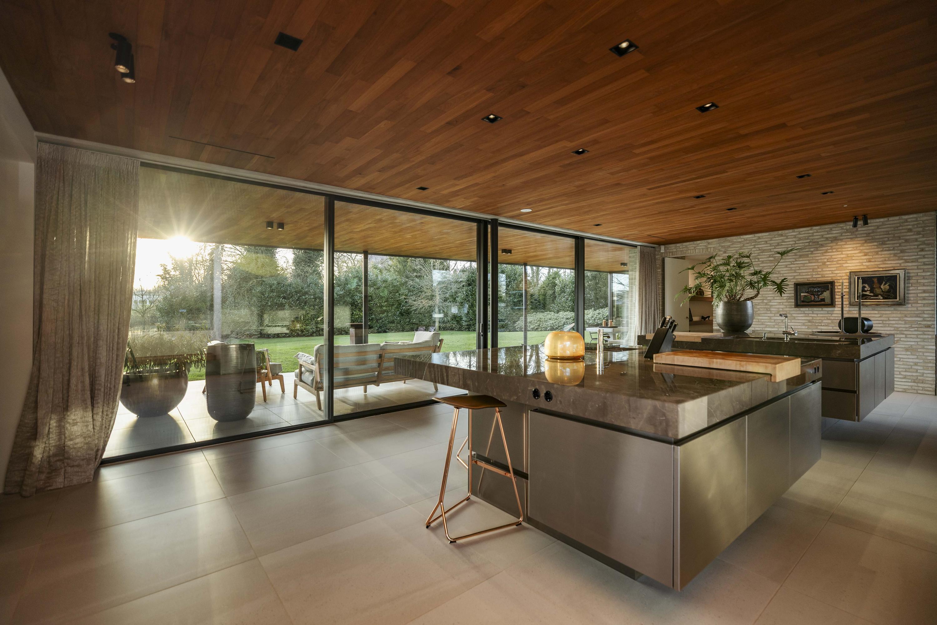 Binnen zorgen travertinkleurige Mosa-vloertegels en geoliede teakhouten plafonds voor een warme uitstraling. Vloeren en plafonds lopen door naar buiten, waardoor keuken en terras als één geheel worden ervaren. De keuken, ontworpen door ontwerpstudio Roel de Vos, beschikt over twee royale eilanden met marmeren bladen (‘olive brown’) en een RVS onderstel. De apparatuurwand is uitgevoerd in matwit met RVS en omvat onder meer een ijskast, vriezer, wijnklimaatkast met twee zones, een hetelucht- en een stoomoven. De inductiekookplaat met geïntegreerde afzuiging is verwerkt in het kookeiland. Op maat gemaakte teakhouten banken sluiten qua uitstraling aan bij het plafond en versterken het harmonieuze karakter van de ruimte. Vloerverwarming op alle drie de woonlagen zorgt voor een aangenaam binnenklimaat - verwarmend in de winter en verkoelend in de zomer.
