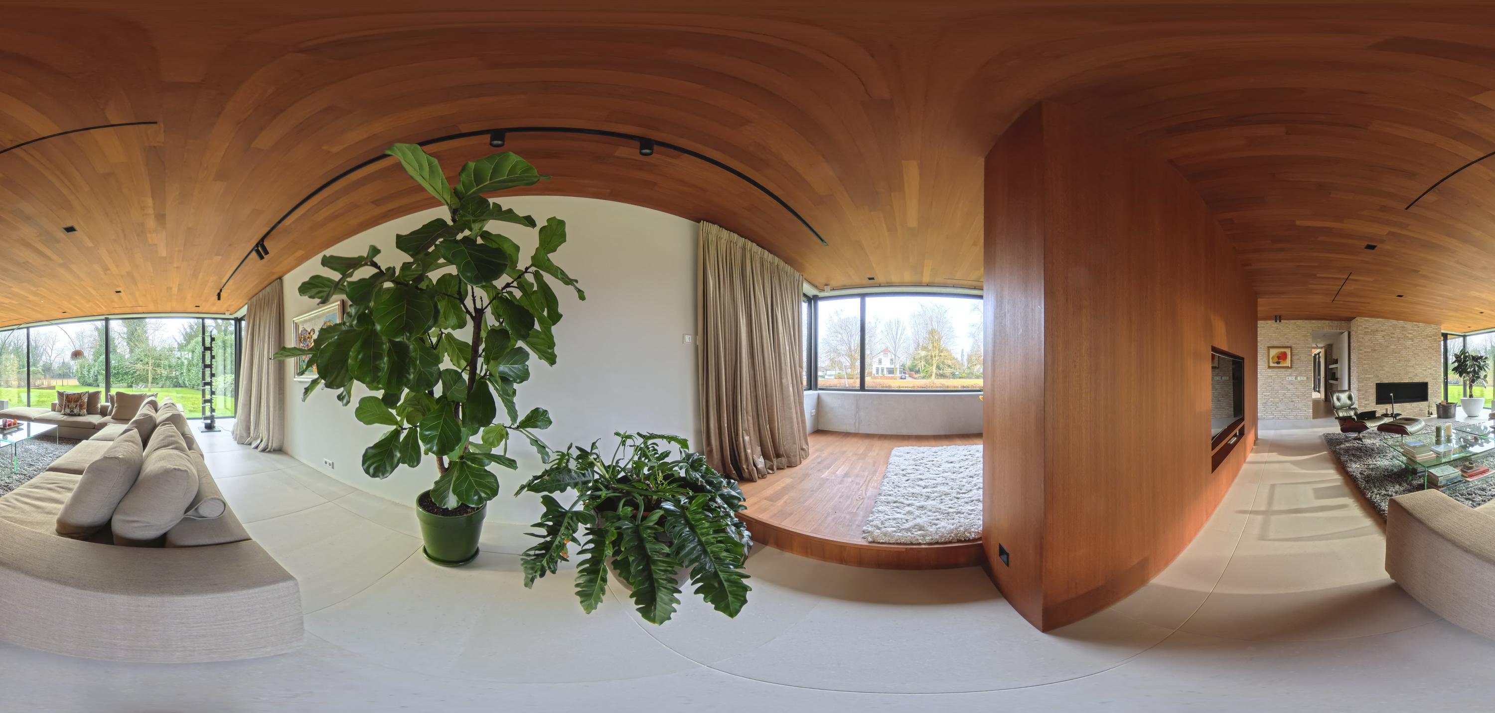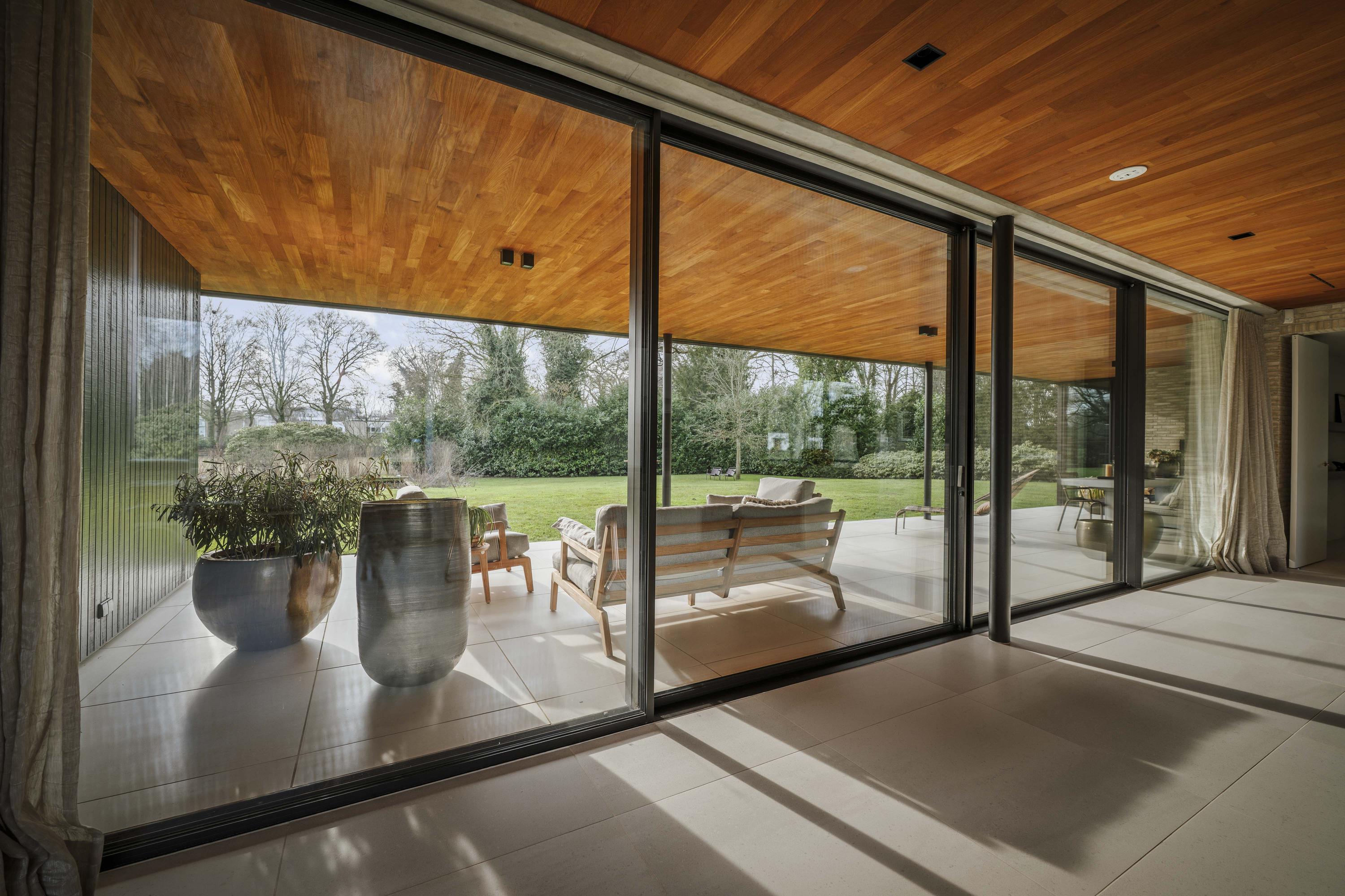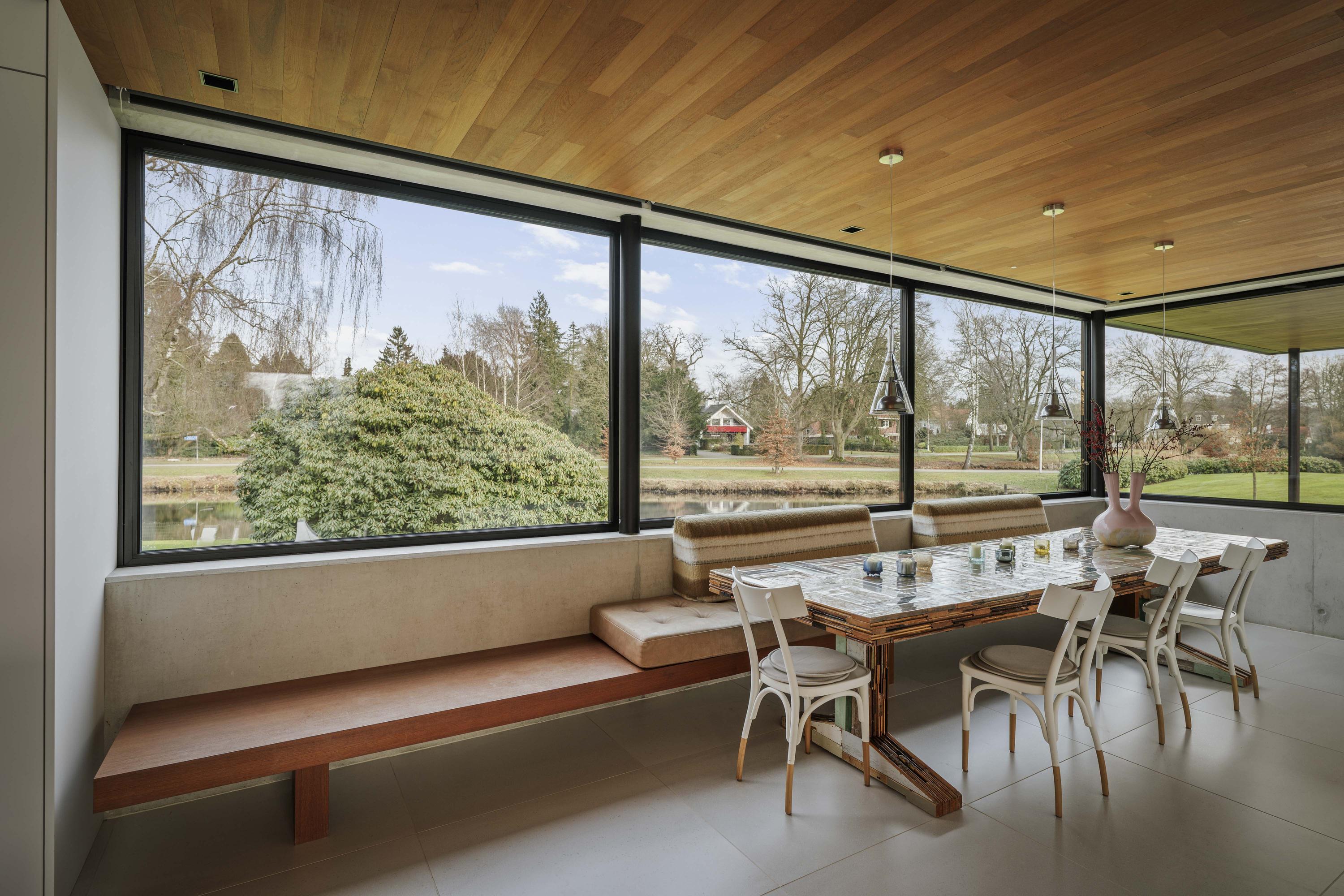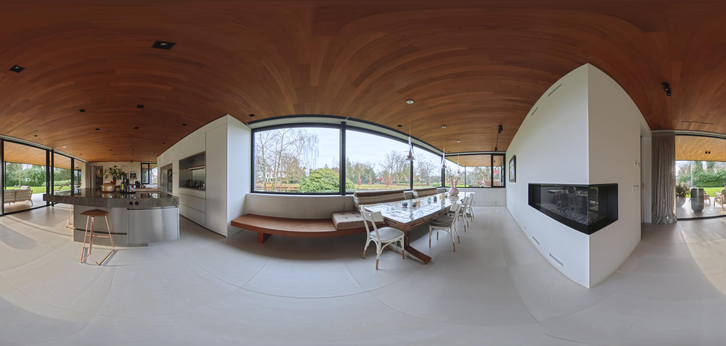 Binnen zorgen travertinkleurige Mosa-vloertegels en geoliede teakhouten plafonds voor een warme uitstraling. Vloeren en plafonds lopen door naar buiten, waardoor keuken en terras als één geheel worden ervaren. De keuken, ontworpen door ontwerpstudio Roel de Vos, beschikt over twee royale eilanden met marmeren bladen (‘olive brown’) en een RVS onderstel. De apparatuurwand is uitgevoerd in matwit met RVS en omvat onder meer een ijskast, vriezer, wijnklimaatkast met twee zones, een hetelucht- en een stoomoven. De inductiekookplaat met geïntegreerde afzuiging is verwerkt in het kookeiland. Op maat gemaakte teakhouten banken sluiten qua uitstraling aan bij het plafond en versterken het harmonieuze karakter van de ruimte. Vloerverwarming op alle drie de woonlagen zorgt voor een aangenaam binnenklimaat - verwarmend in de winter en verkoelend in de zomer.