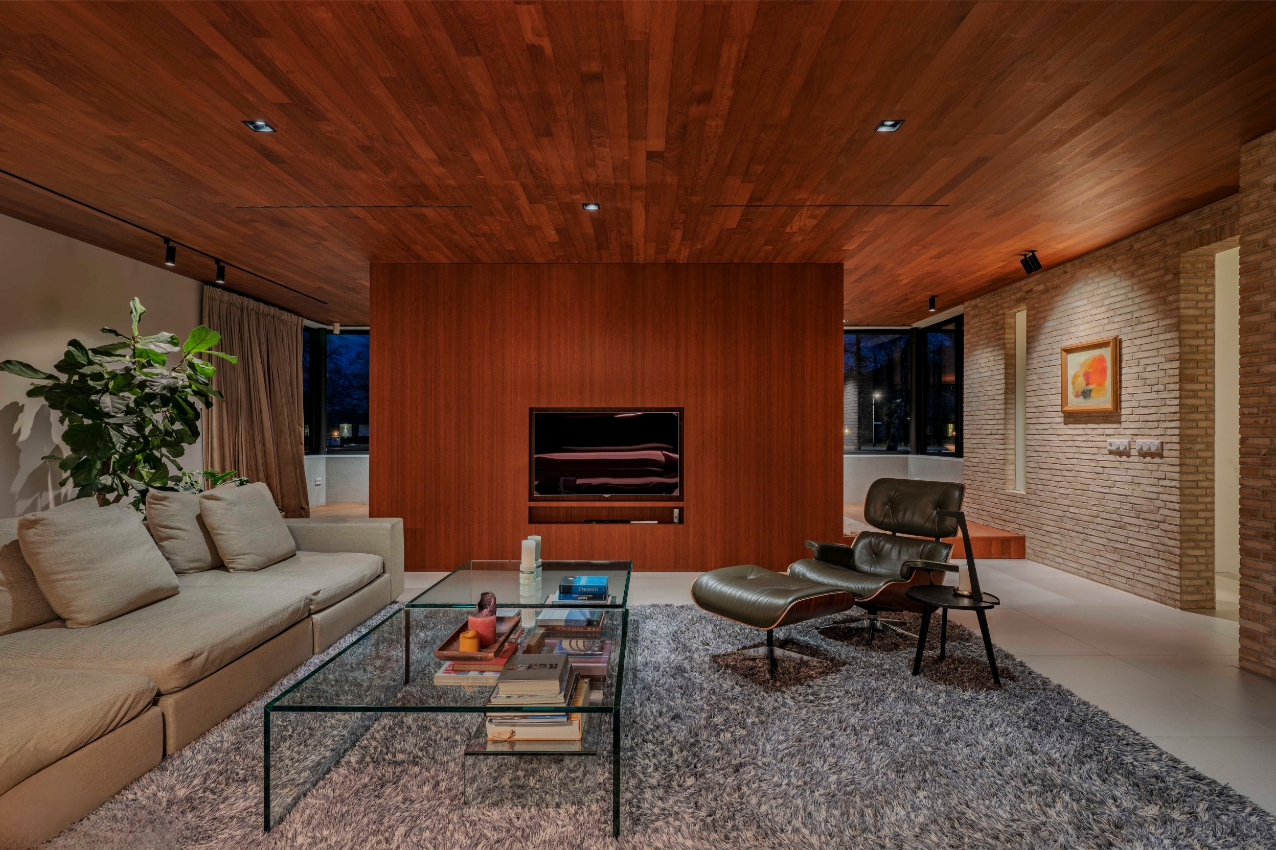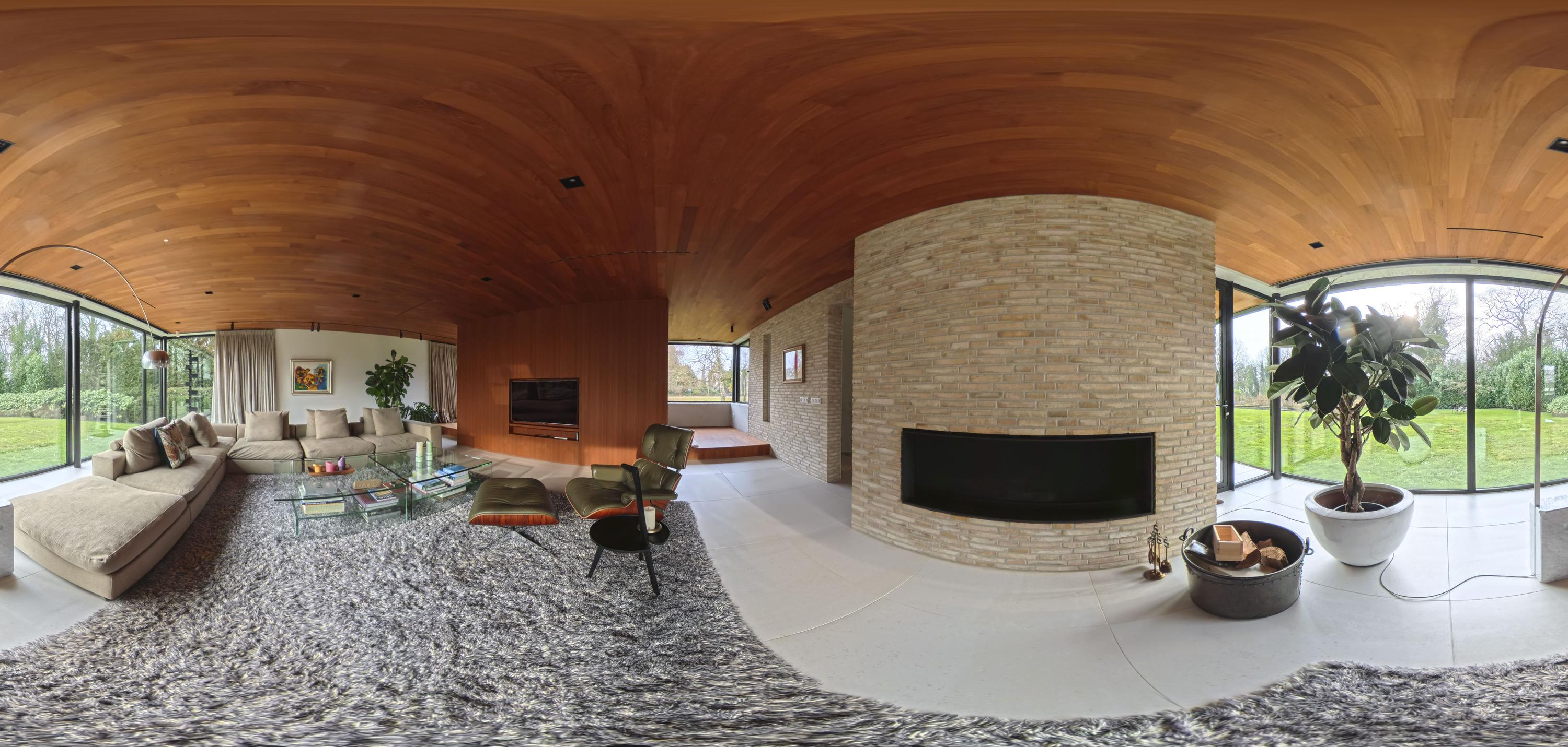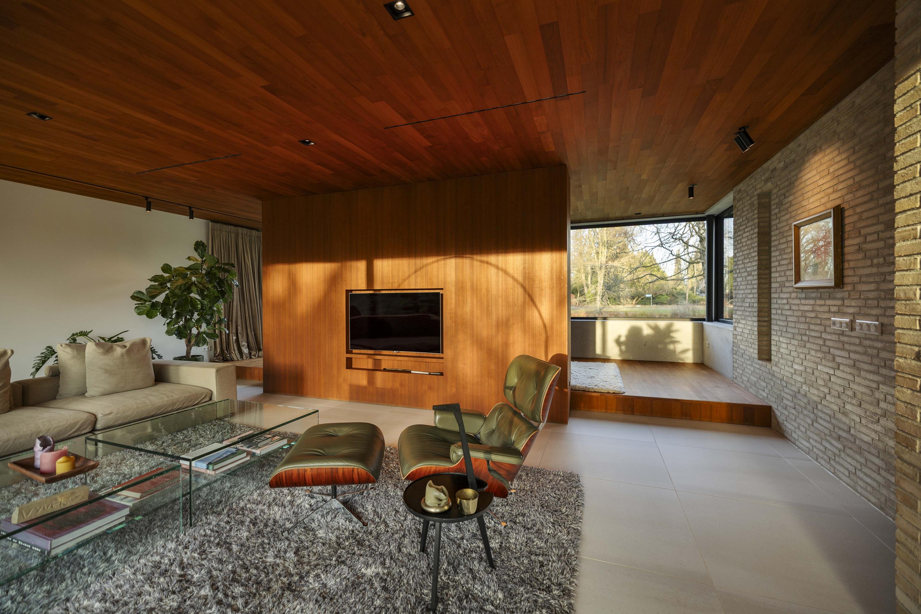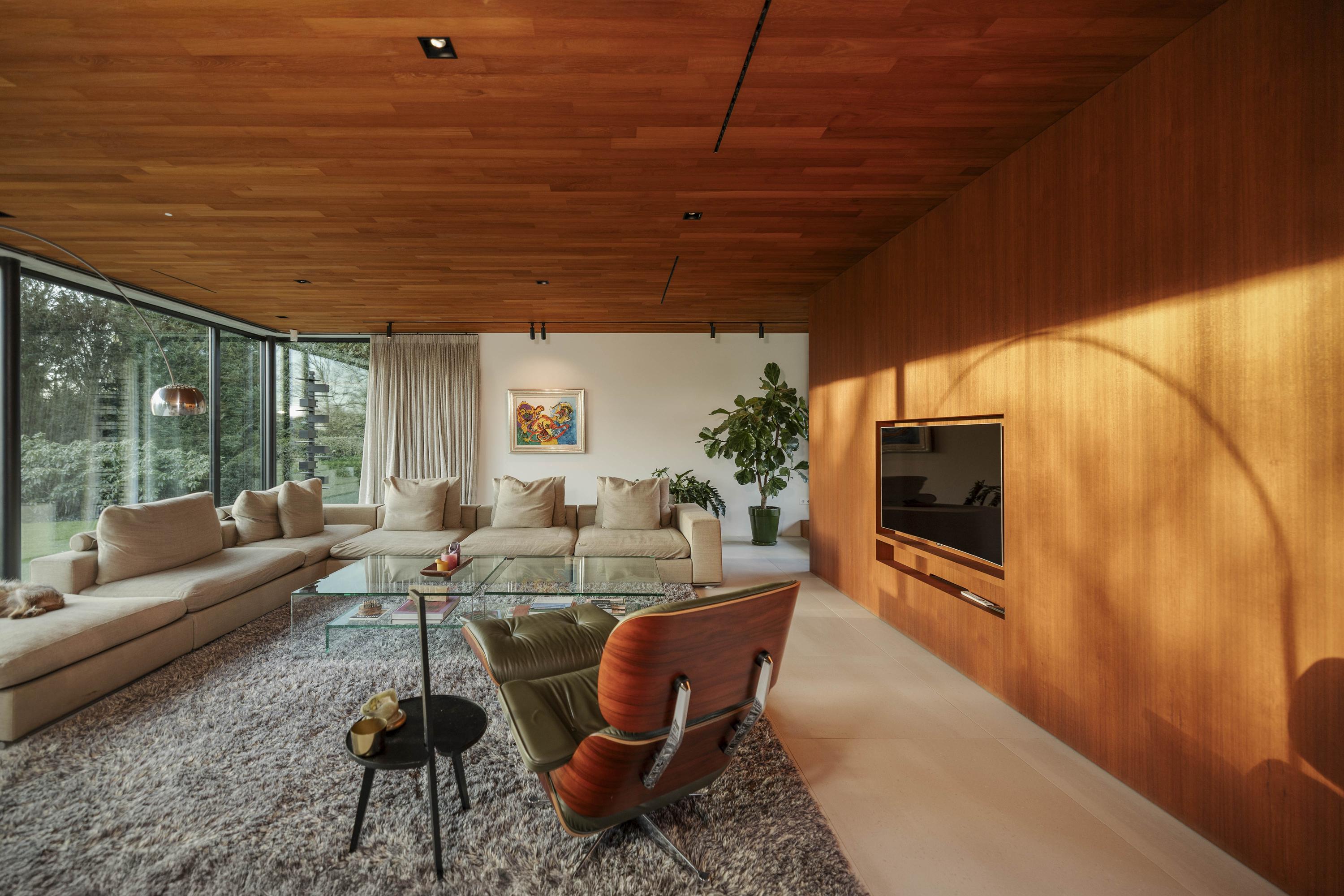 De woonkamer (74 m²) is royaal en verdeeld in twee zitgedeeltes door de toepassing van een roomdivider met geïntegreerde televisie- en boekenkast. Aan de achterzijde bieden kamerhoge raampartijen uitzicht over de tuin, terwijl aan de voorzijde de vijvers in beeld komen, met voldoende privacy dankzij de halfhoge borstwering. Een brede haardpartij van Metalfire en een verhoogde teakhouten vloerzone aan de voorzijde geven de ruimte extra karakter. Het uitgekiende lichtplan zorgt ervoor dat kunst en architectonische lijnen optimaal tot hun recht komen.